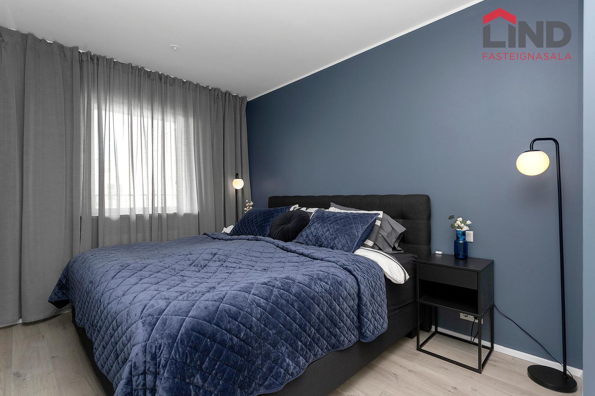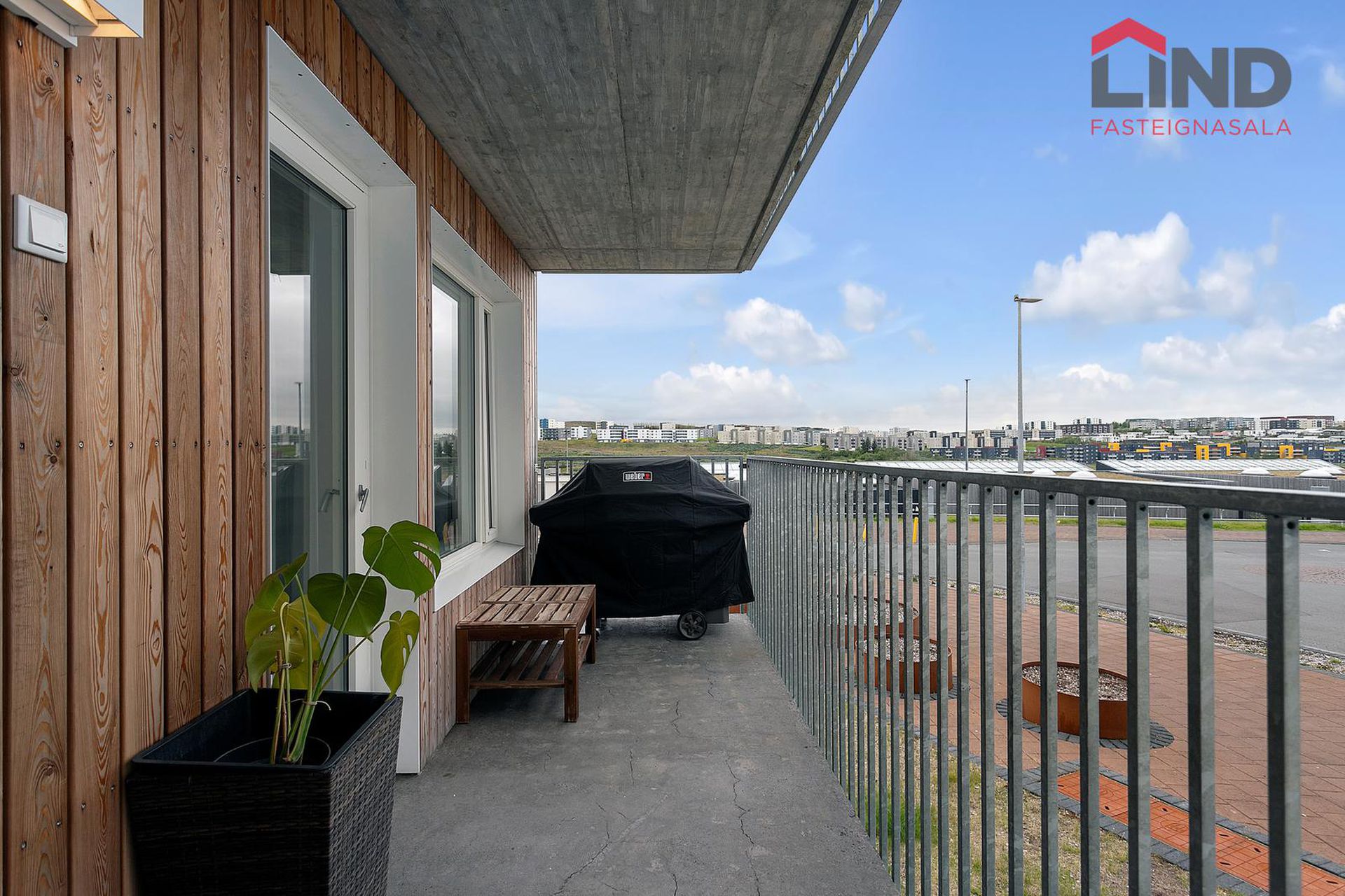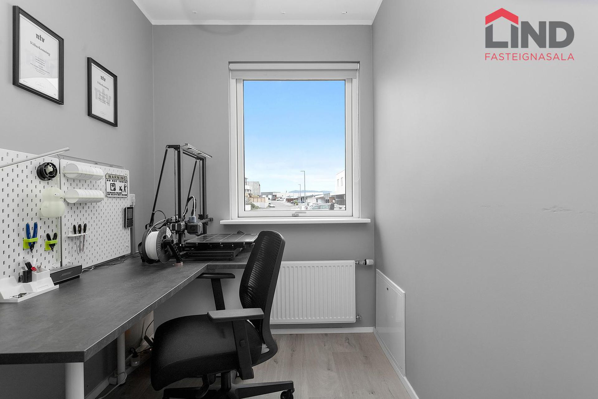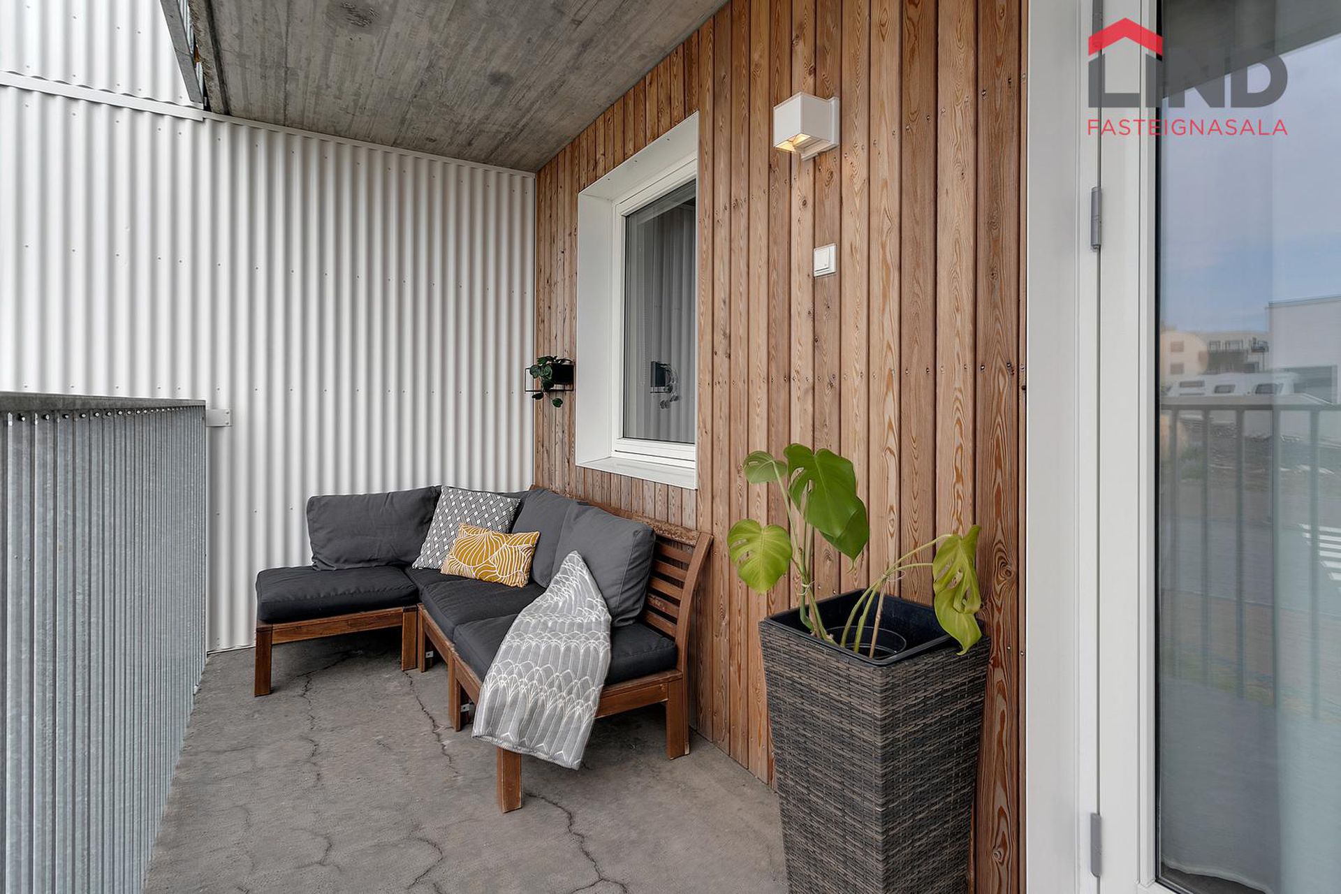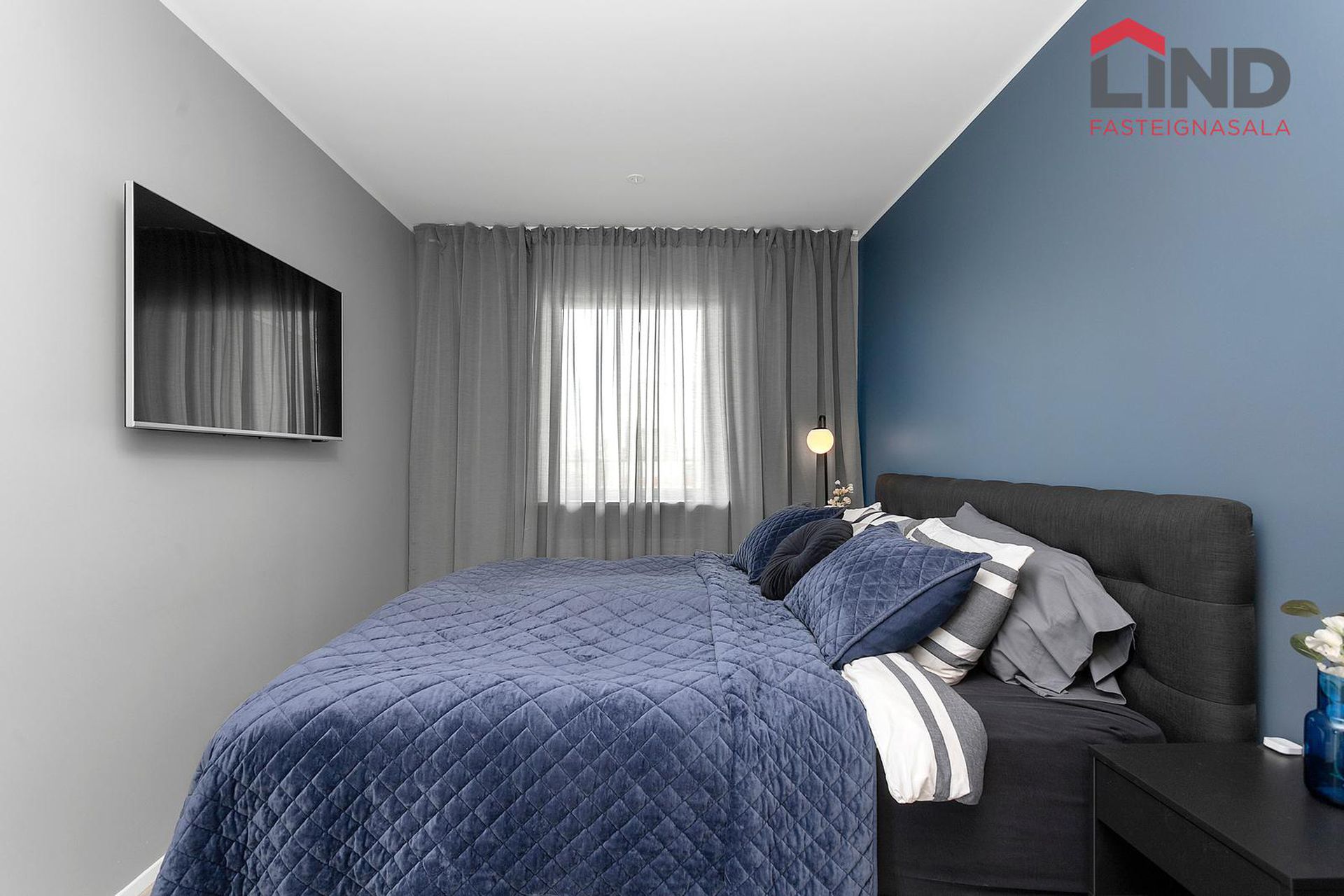Í forstofu eru fataskápar og parket á gólfi. Til vinstri er skráð geymsla innan íbúðar, björt með stórum glugga sem hægt er að nota sem skrifstofu eða barnaherbergi. Frá Forstofu er gengið inn í alrými eignar. Þar er fallegt eldhús. Hvít innrétting með innbyggðri uppþvottavél og gert ráð fyrir ísskáp í innréttingu. Parket á gólfi. Stofa og borðstofa einnig í alrými eignar. Parket á gólfi. Þaðan er útgengt út á vestur svalir. Við hlið stofu er rúmgott og bjart hjónaherbergi. Parket á gólfi og fataskápar. Bjart barnaherbergi við hlið eldhúss. Parket á gólfi og einfaldur fataskápur. Fallegt baðherbergi með sturtu, upphengdu WC, hvítri innréttingu með upplýstum spegli fyrir ofan skolvask. Gert er ráð fyrir þvottavél og þurrkara inná baðherbergi.