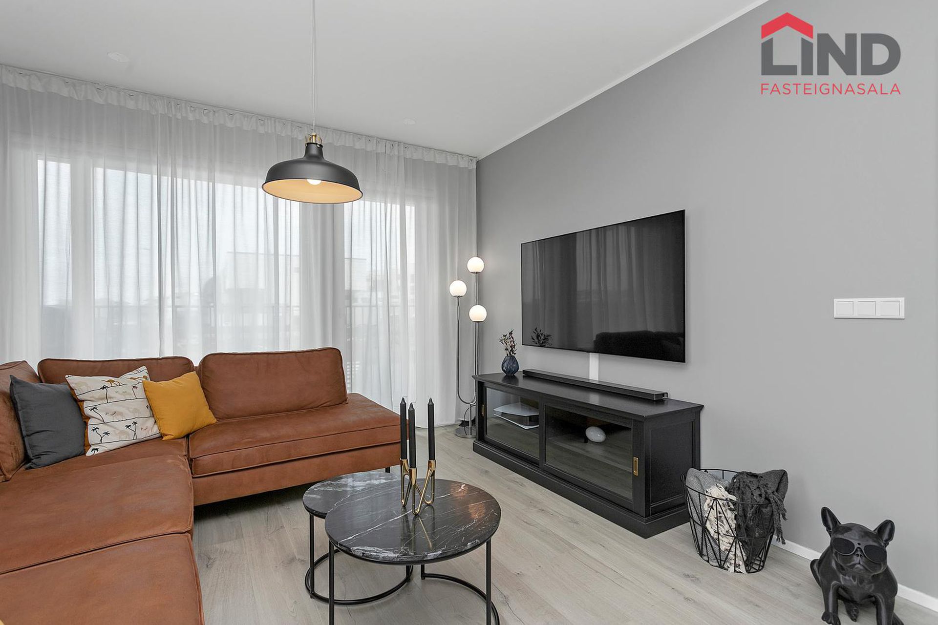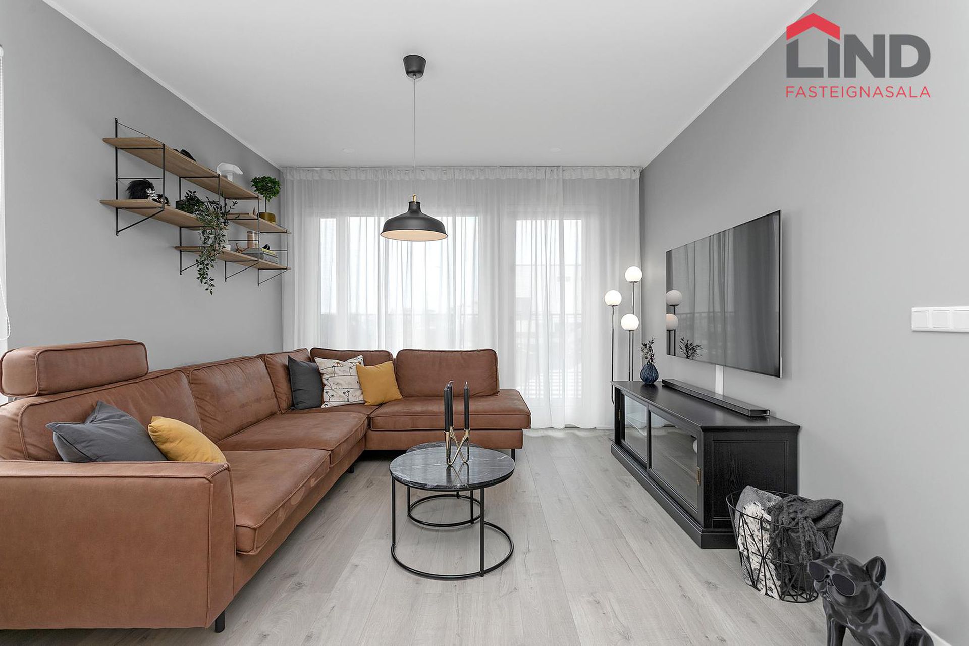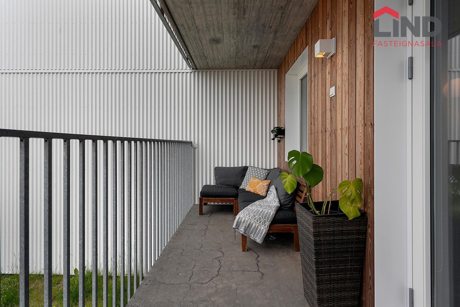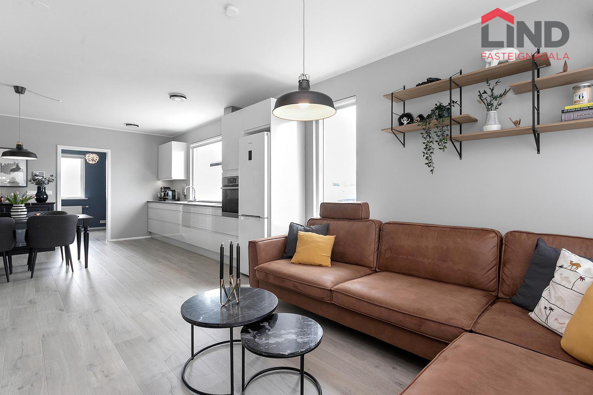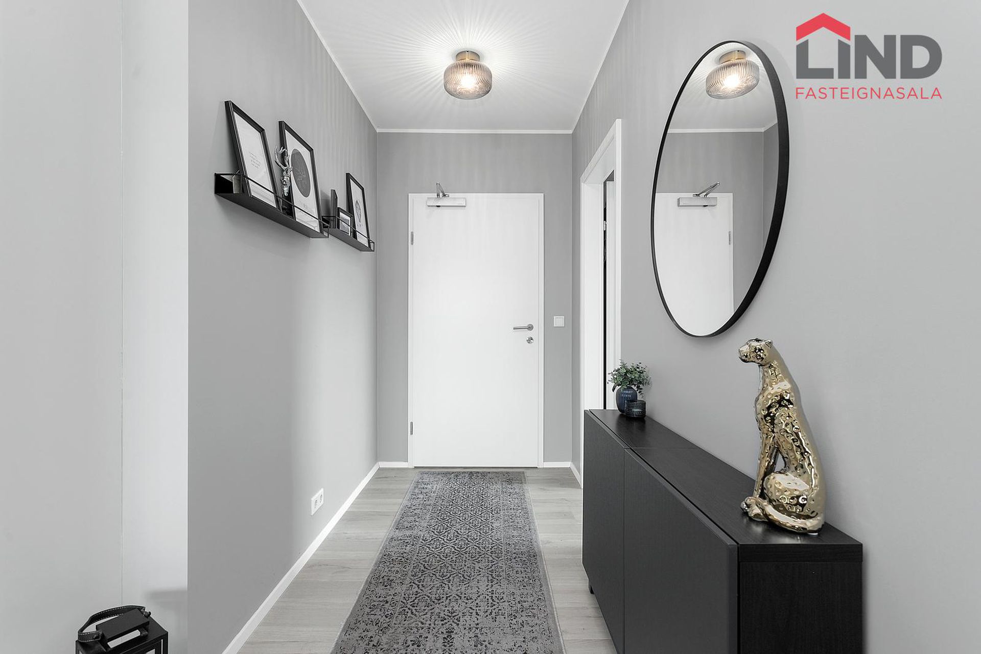 Í forstofu eru fataskápar og parket á gólfi. Til vinstri er skráð geymsla innan íbúðar, björt með stórum glugga sem hægt er að nota sem skrifstofu eða barnaherbergi. Frá Forstofu er gengið inn í alrými eignar. Þar er fallegt eldhús. Hvít innrétting með innbyggðri uppþvottavél og gert ráð fyrir ísskáp í innréttingu. Parket á gólfi. Stofa og borðstofa einnig í alrými eignar. Parket á gólfi. Þaðan er útgengt út á vestur svalir. Við hlið stofu er rúmgott og bjart hjónaherbergi. Parket á gólfi og fataskápar. Bjart barnaherbergi við hlið eldhúss. Parket á gólfi og einfaldur fataskápur. Fallegt baðherbergi með sturtu, upphengdu WC, hvítri innréttingu með upplýstum spegli fyrir ofan skolvask. Gert er ráð fyrir þvottavél og þurrkara inná baðherbergi.