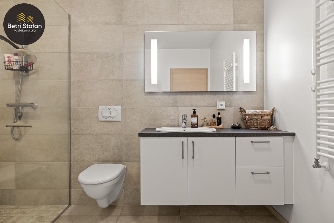 Baðherbergi: Rúmgott með "walk in" sturtu með glerskilrúmi. Upphengt salerni, innrétting með neðri skápum, skúffum og vaski. Stór spegill fyrir ofan vask með innbyggðri lýsingu. Innrétting fyrir þvottavél og þurrkara.