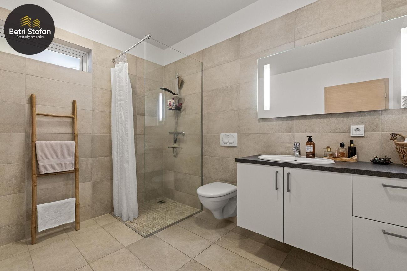 Baðherbergi: Rúmgott með "walk in" sturtu með glerskilrúmi. Upphengt salerni, innrétting með neðri skápum, skúffum og vaski. Stór spegill fyrir ofan vask með innbyggðri lýsingu. Innrétting fyrir þvottavél og þurrkara.