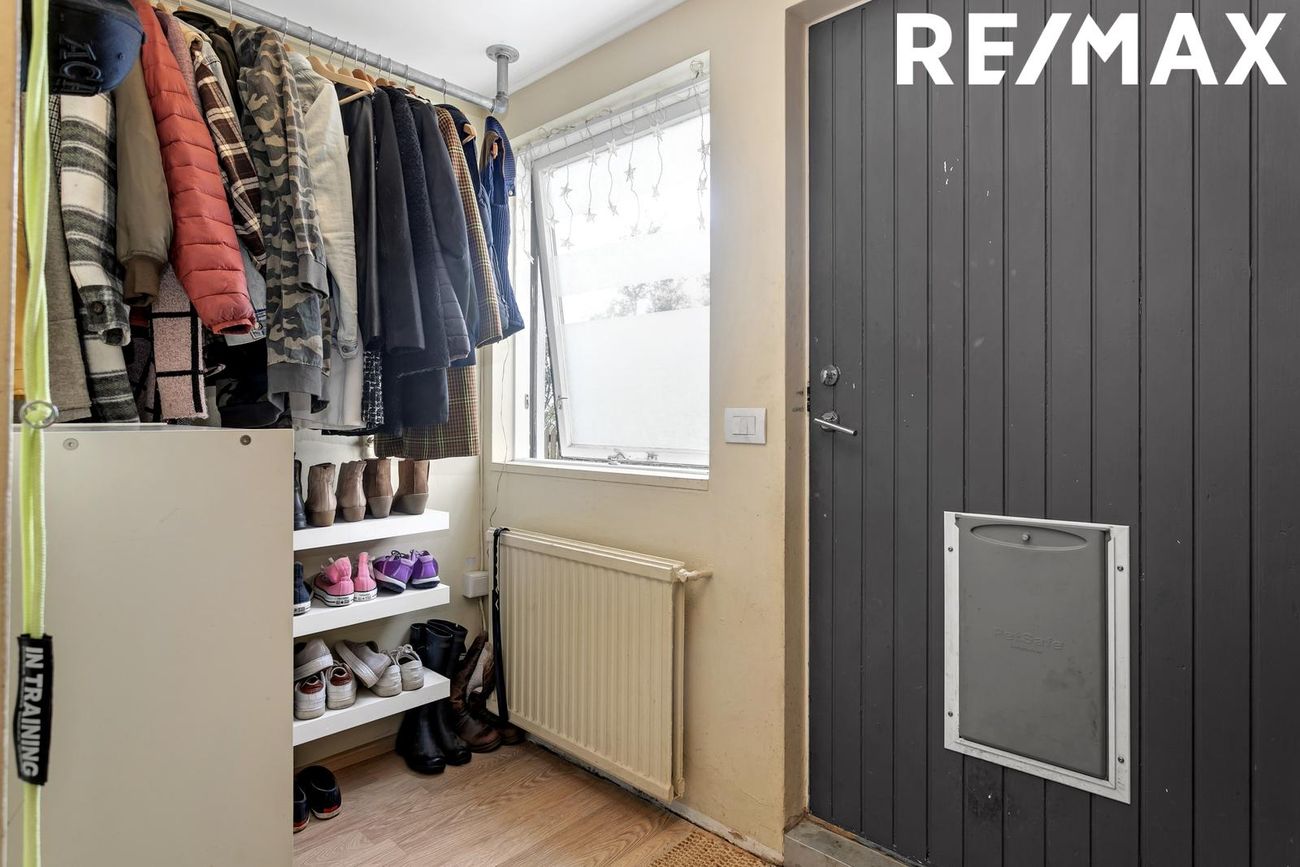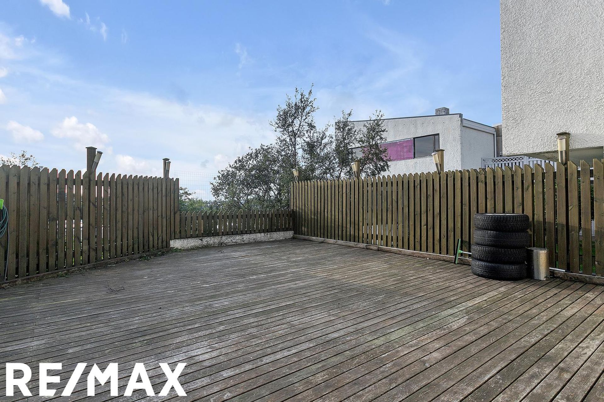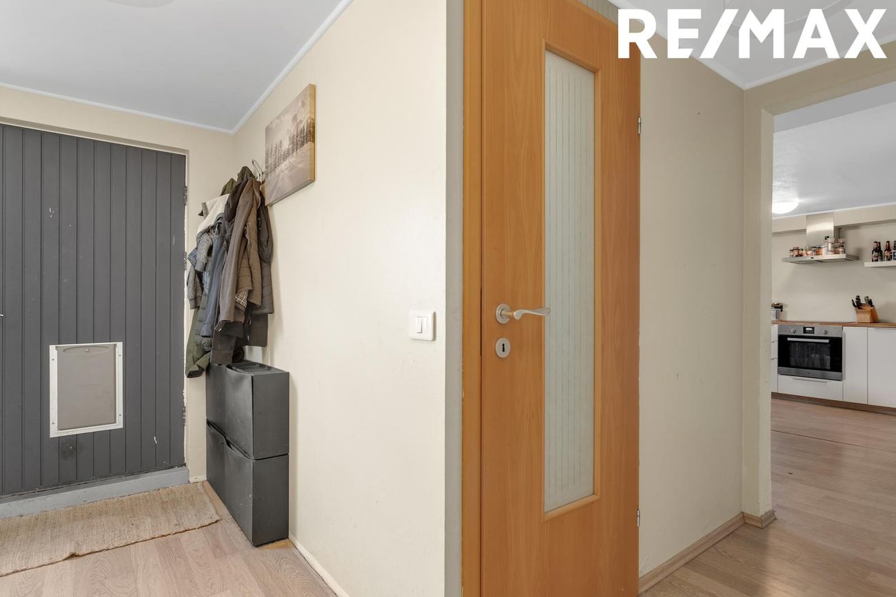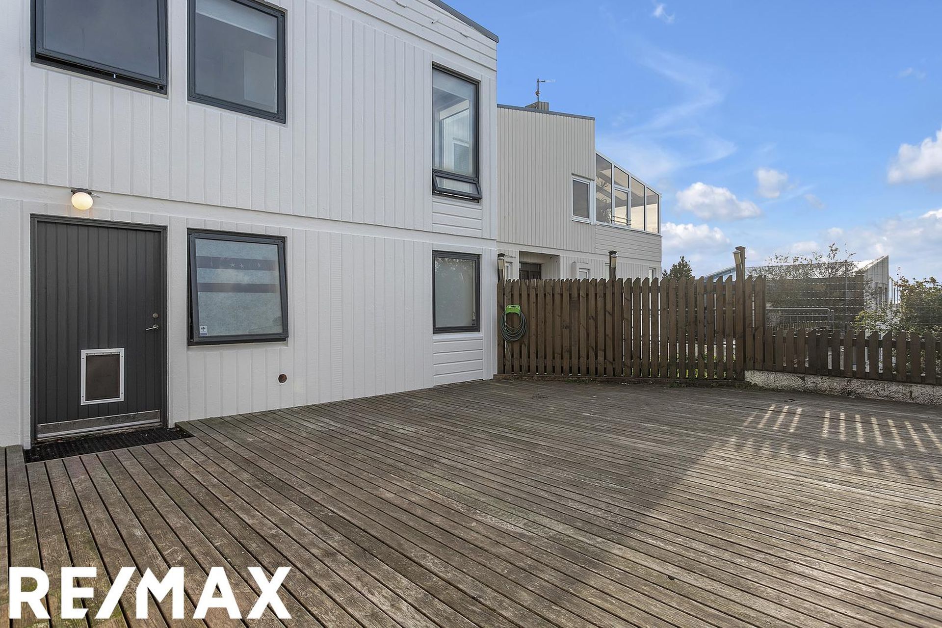 Nánari lýsing: Forstofa með fatahengi og harðparketi á gólfi. Eldhús er með hvítri fallegri innréttingu og viðarborðplötu. Tengi fyrir uppþvottavél og ísskáp. Rúmgott rými þar sem rúmast vel fyrir eldhúsborði. Harðparket á gófli. Baðherbergi er með handlaug, salerni og flísalögðum sturtuklefa með hengi. Flísar á gólfi og veggjum. Stofa er rúmgóð og þaðan er gengið út á yfirbyggðan skála sem er ekki inn í fermetra tölu íbúðarinnar. Harðparket á gólfi. Svefnherbergin 2 eru rúmgóð með harðparketi á gólfi. Þvottaherbergi er með tengi fyrir þvottavél og þurrkara. Borðplata og efri skápar. Sérgeymsla er stór og gengið í hana af verönd, hún er ekki inn í fermetratölu íbúðarinnar. Garður er allur stór timburverönd sem er sérafnotaréttur íbúðar.