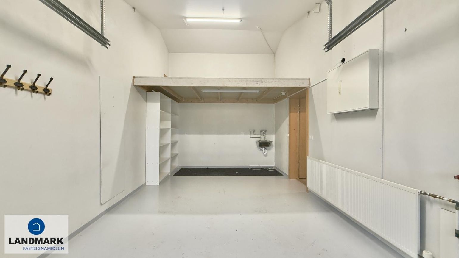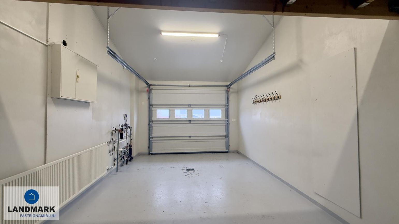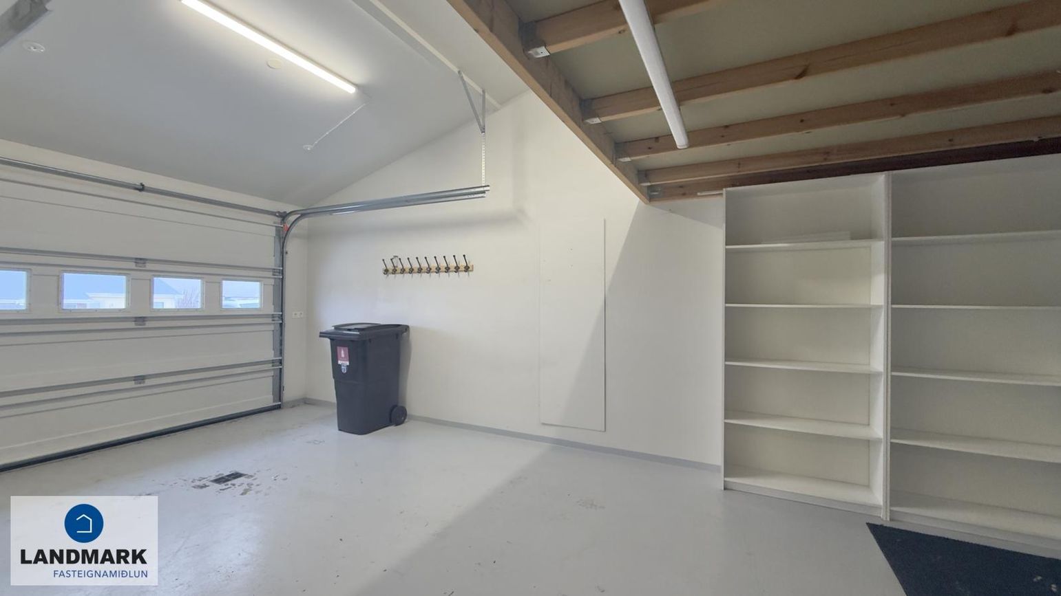 Geymsla/Bílskúr: Rafdrifin bílskúrshurð, milliloft á hluta, málað gólf.