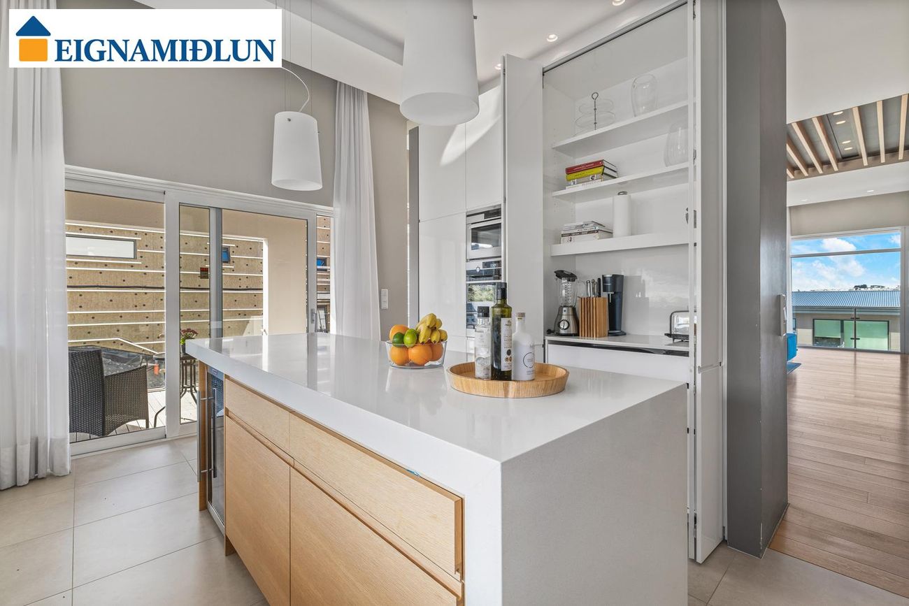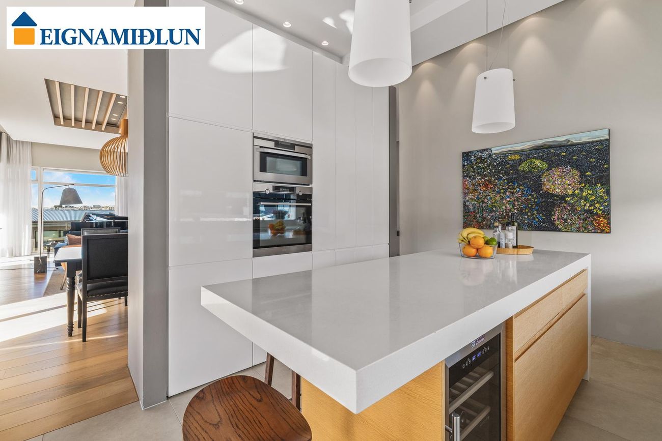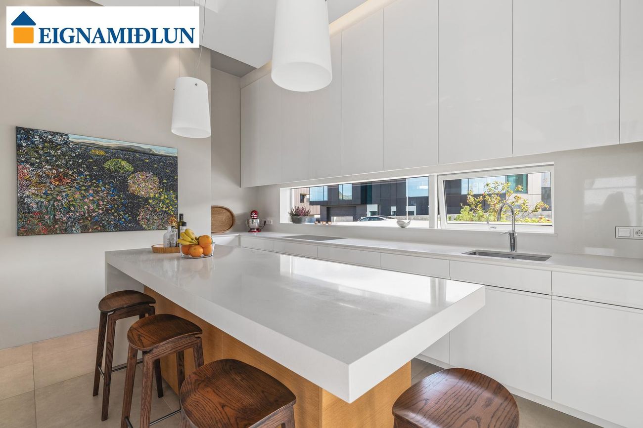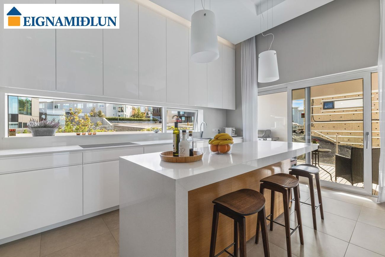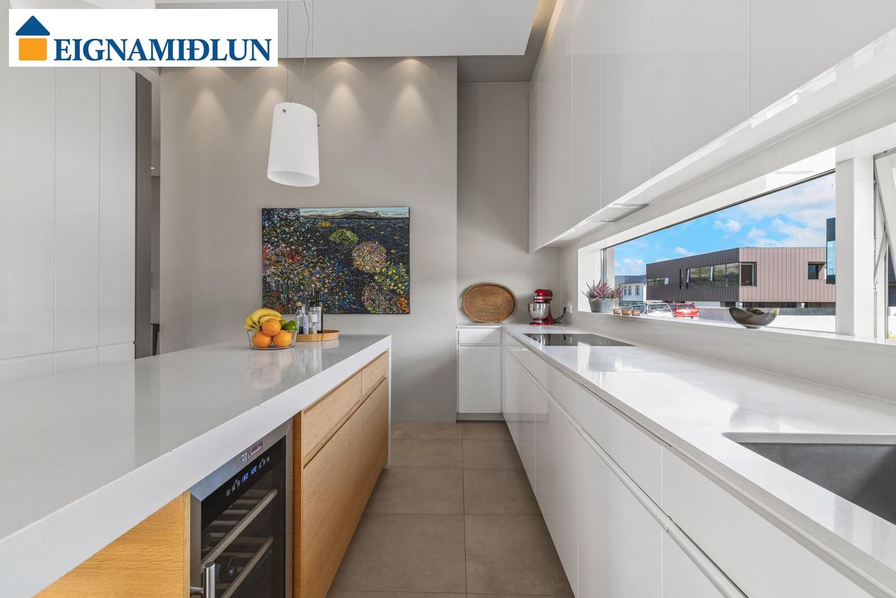 Eldhús er opið að hluta yfir í stofu. Sérsmíðaðar vandaðar innréttingar. Steinn á borðum. Vínkælir í eyju. Flísar á gólfi. Útgengt út á verönd frá eldhúsi.