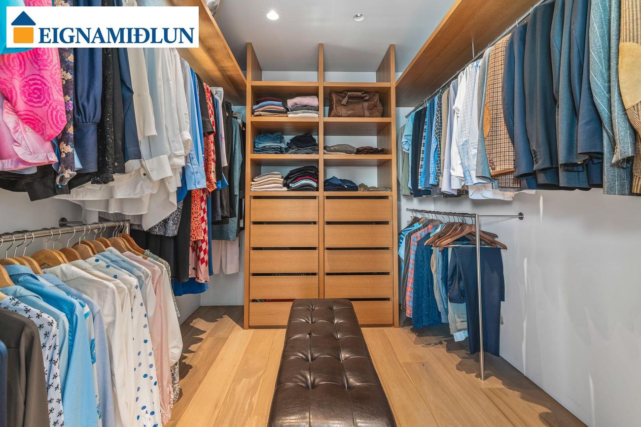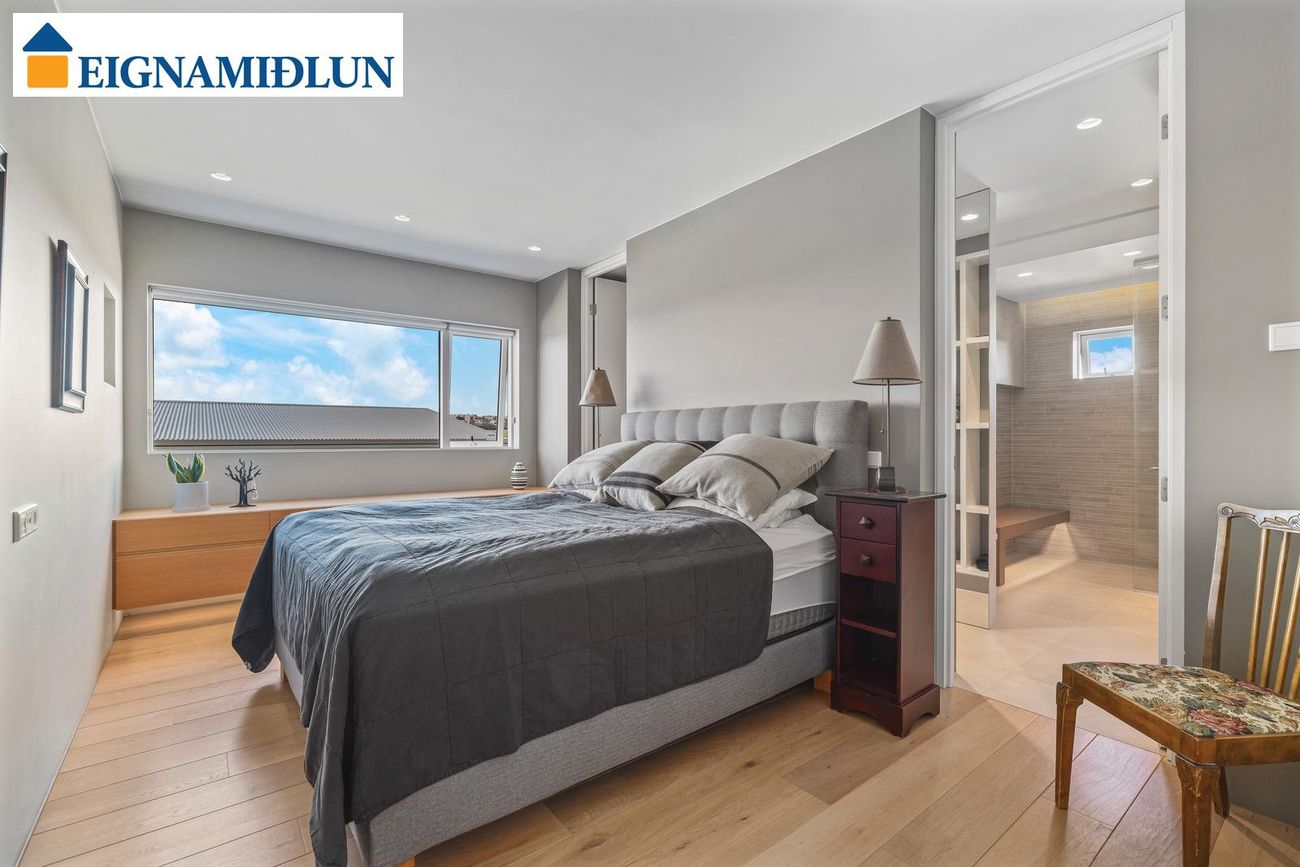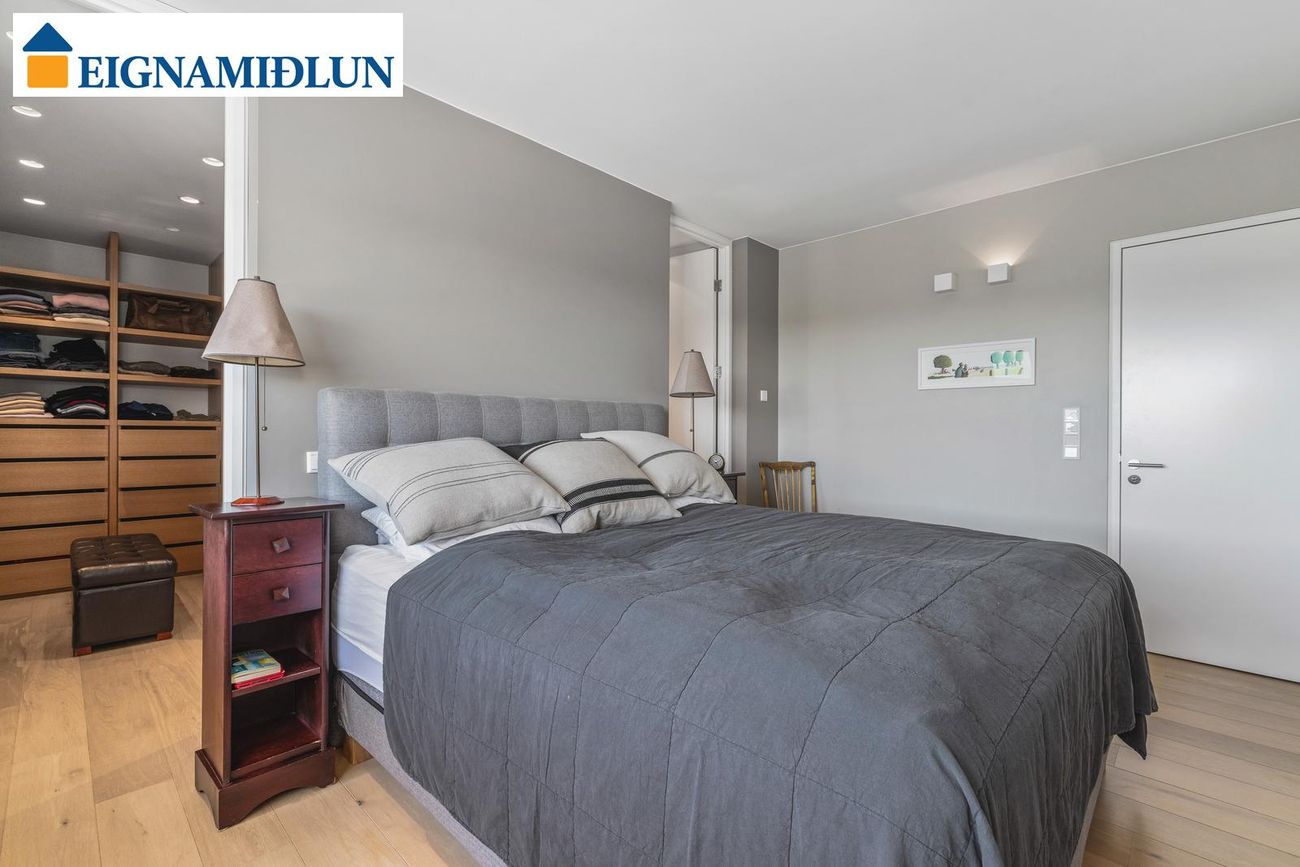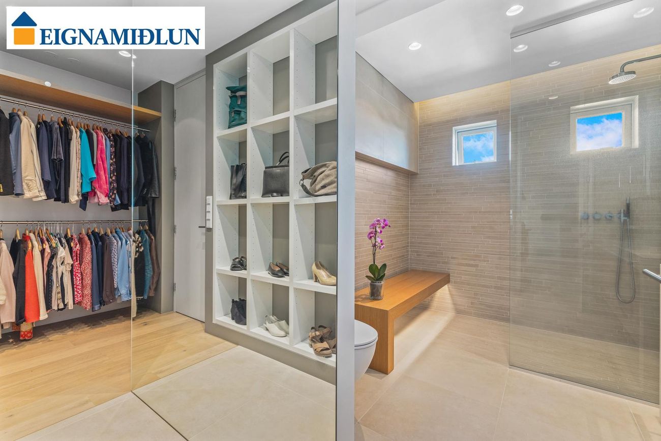 Vel hönnuð hjónasvíta með miklu geymsluplássi. Fataherbergi og baðherbergi innaf svítu. Baðherbergið er rúmgott með opnanlegum gluggum. Flísalagt í hólf og gólf. Sérsmíðaðar innréttingar og bekkur við sturtu. Innbyggð blöndunartæki í sturtu.