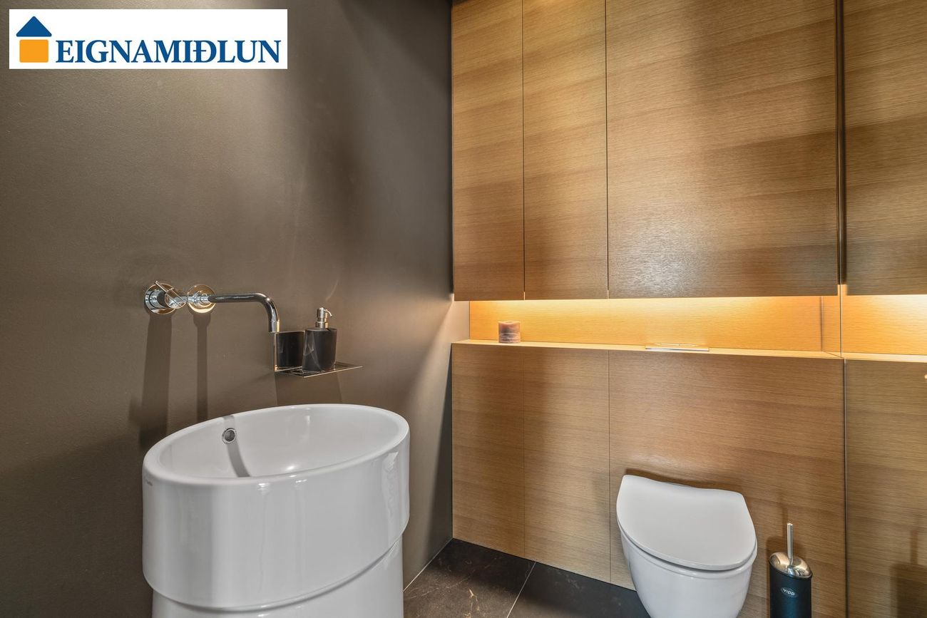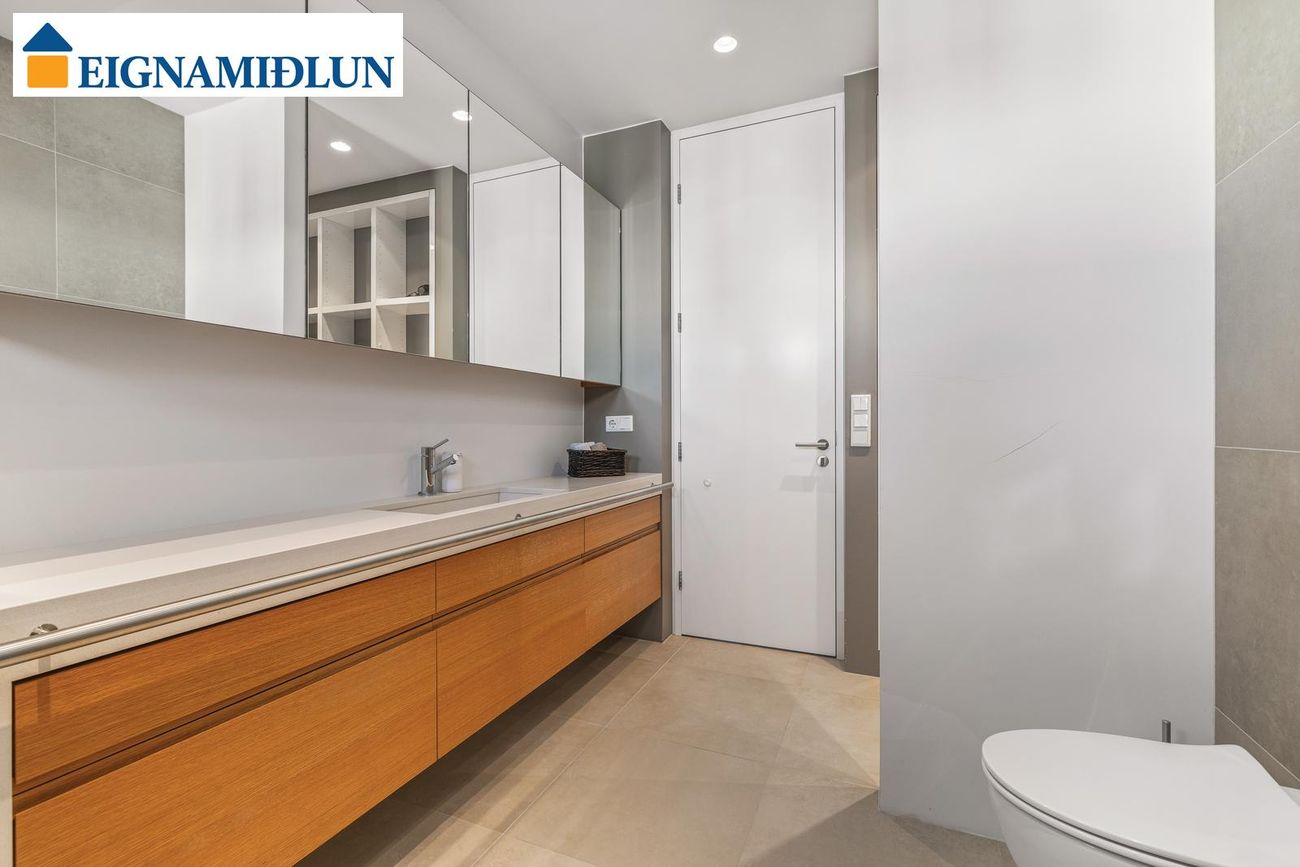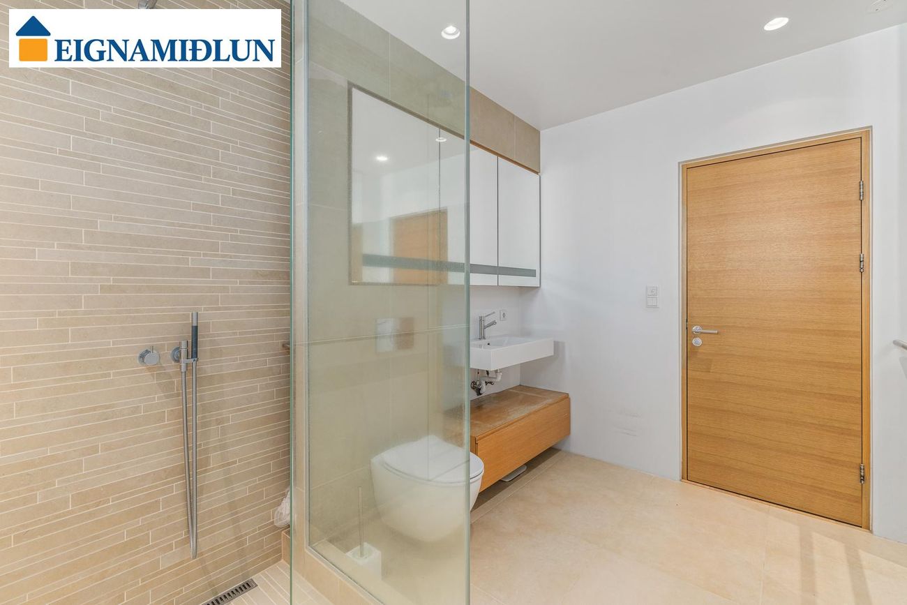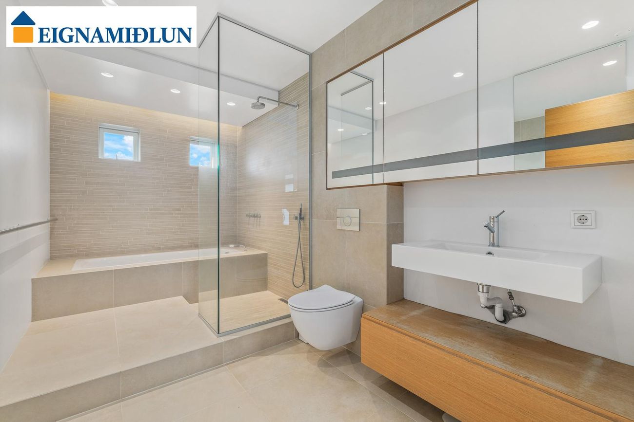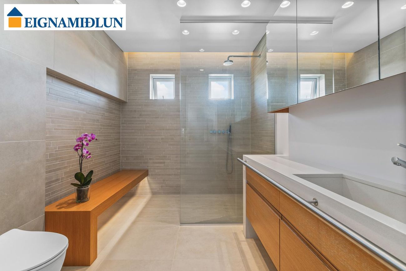 Vel hönnuð hjónasvíta með miklu geymsluplássi. Fataherbergi og baðherbergi innaf svítu. Baðherbergið er rúmgott með opnanlegum gluggum. Flísalagt í hólf og gólf. Sérsmíðaðar innréttingar og bekkur við sturtu. Innbyggð blöndunartæki í sturtu.