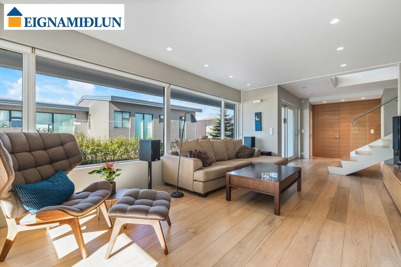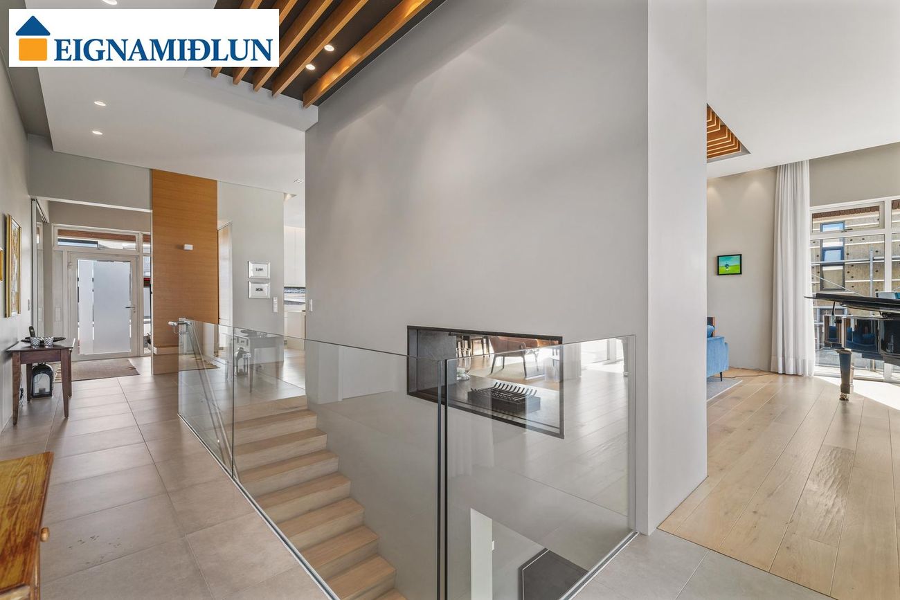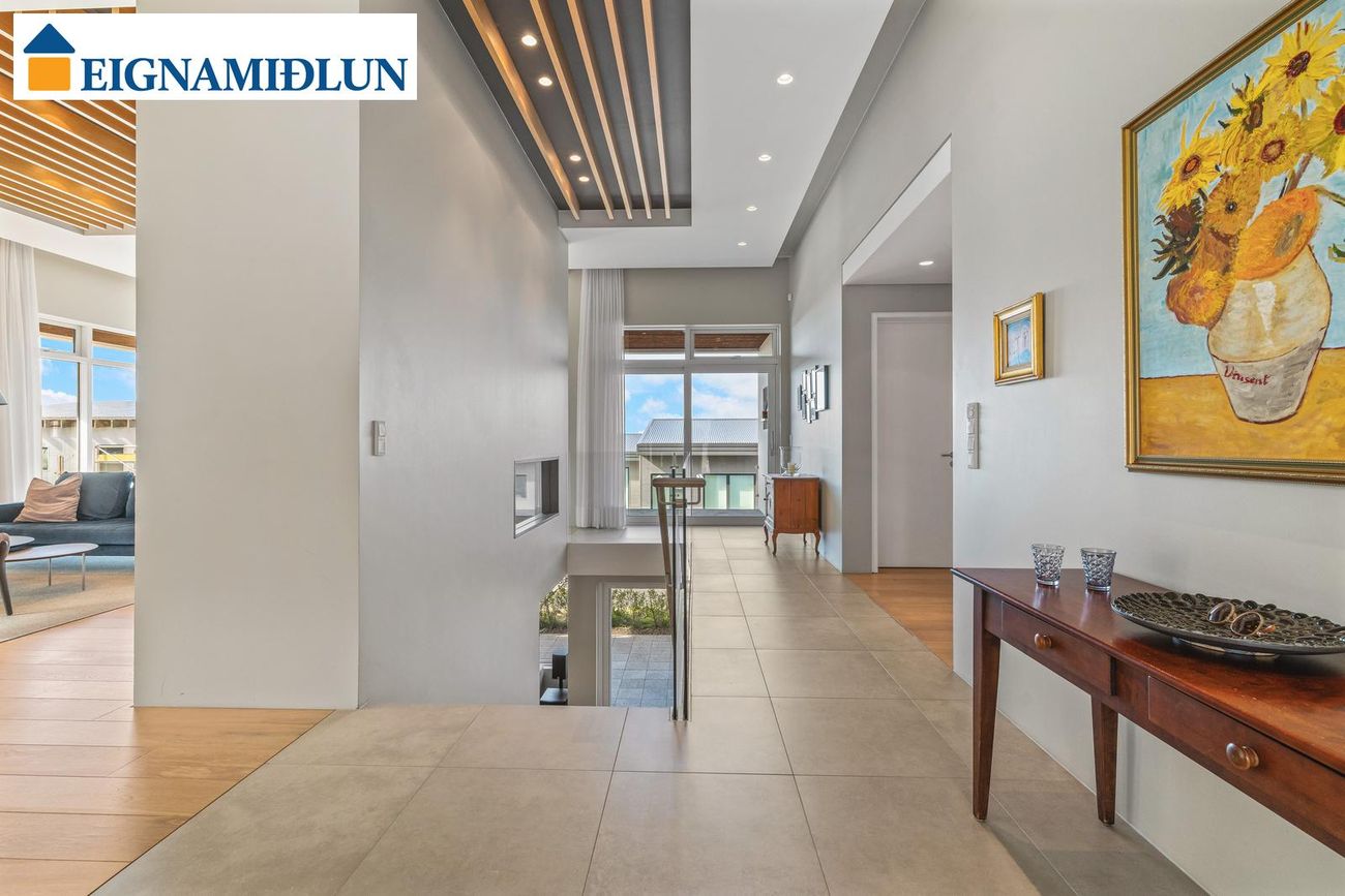 Gólfefni hússins er gegnheilt viðarparket á flestum rýmum en á öðrum flísar. Allar innréttingar og hurðir eru sérsmíðaðar. Innfelld lýsing er í flestum rýmum.