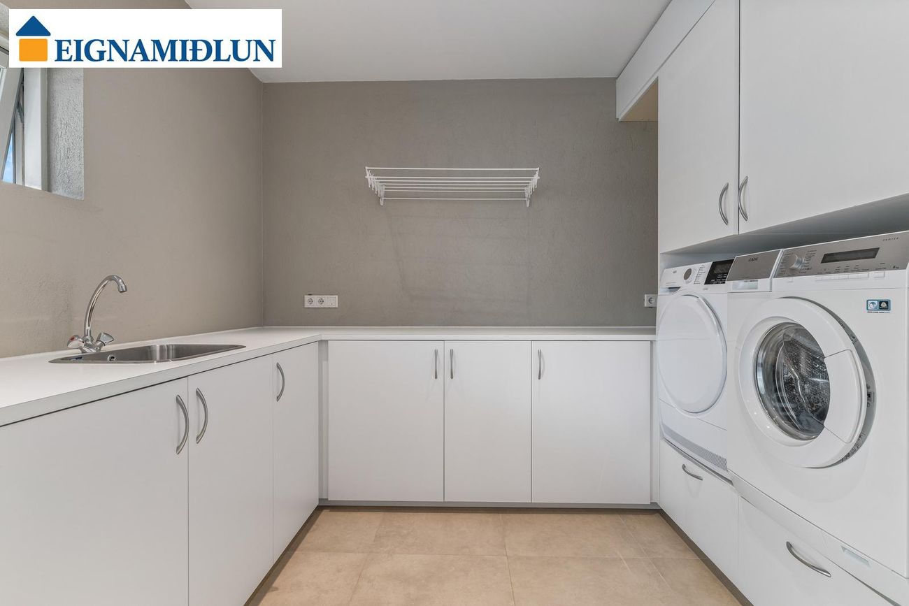 Frá gangi er geymsla og inn af henni er þvottahús með miklu skápaplássi og tengi fyrir þvottavél og þurrkara í vinnuhæð.