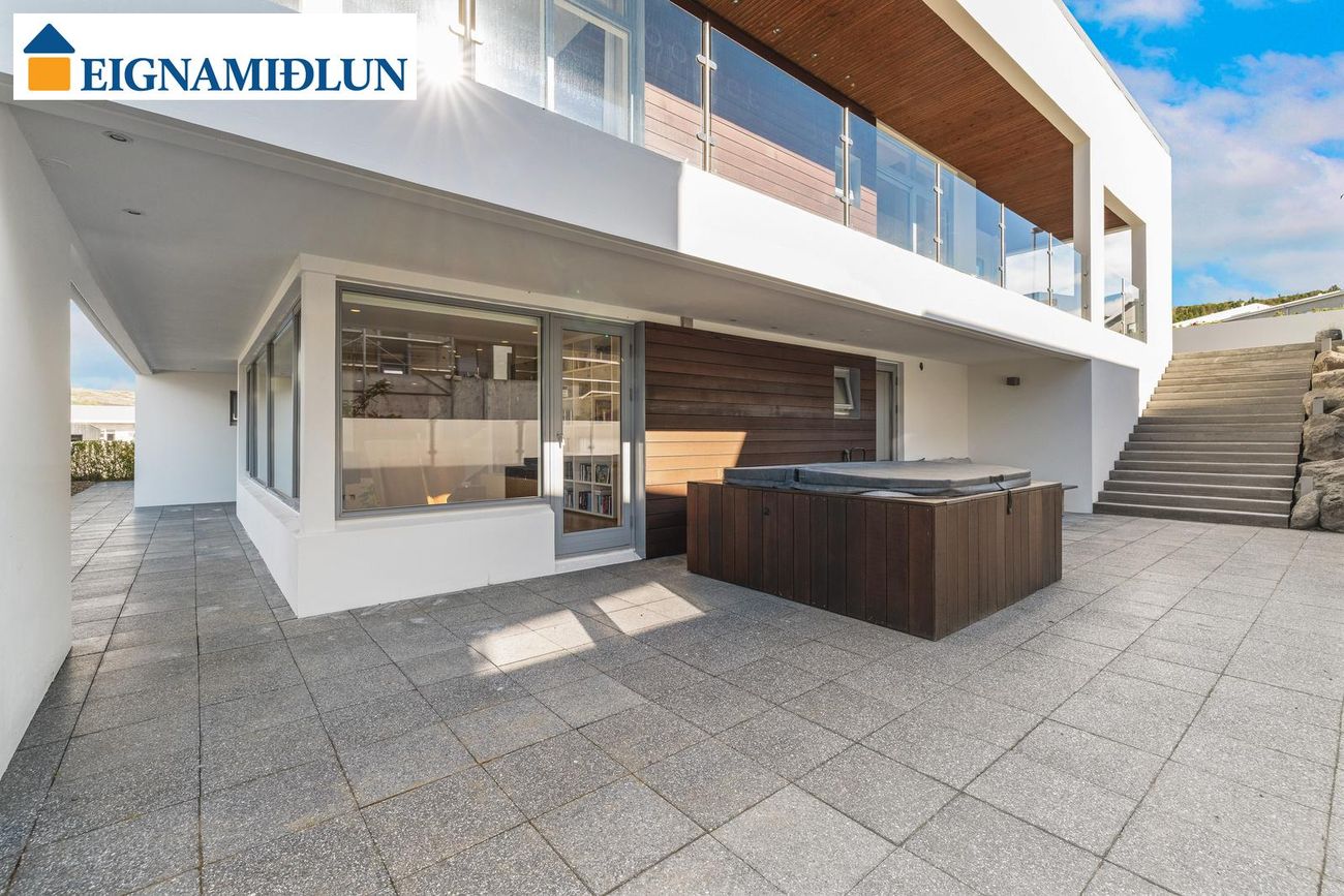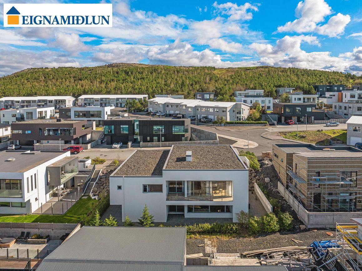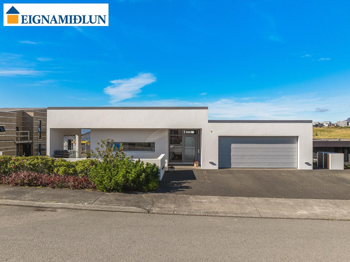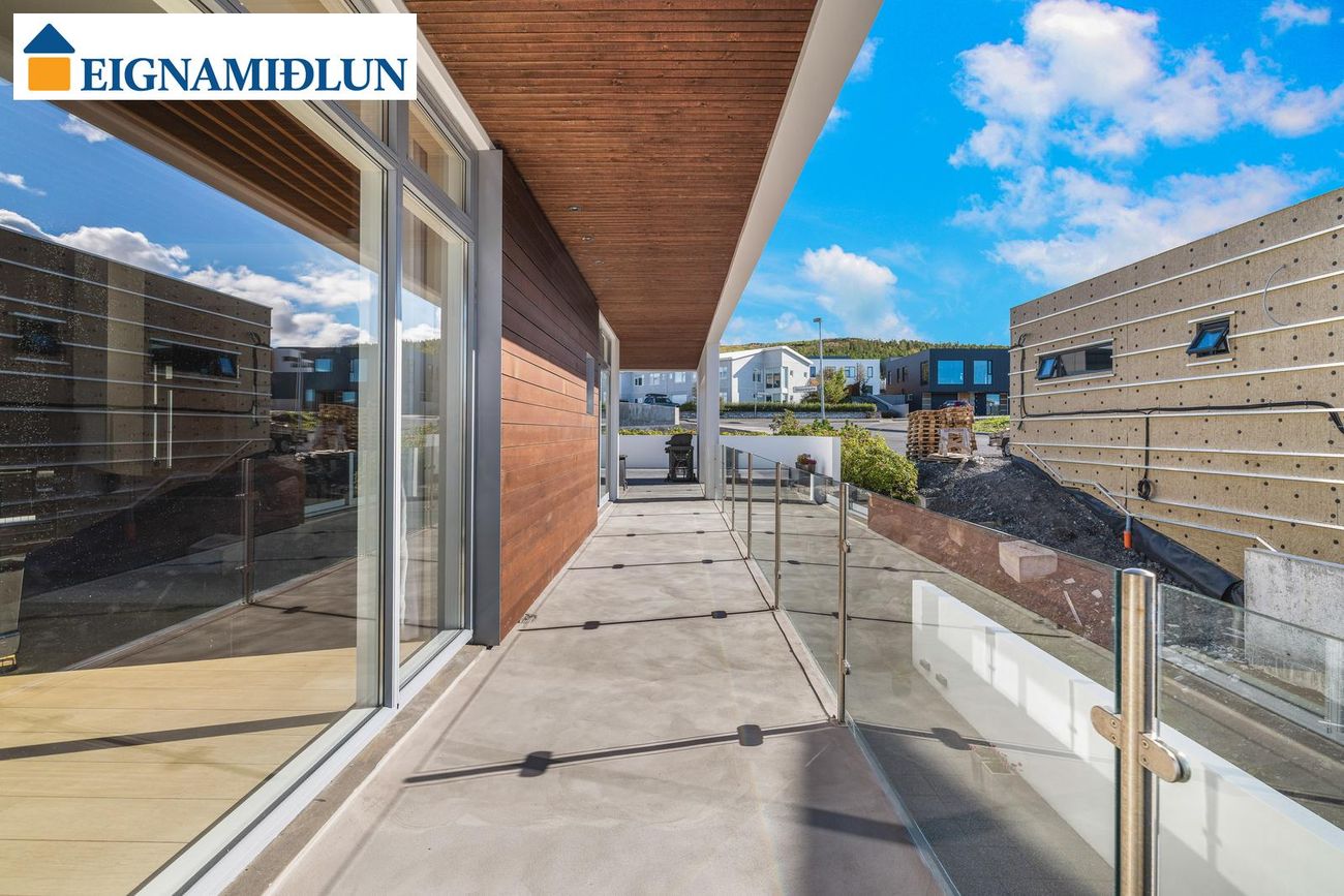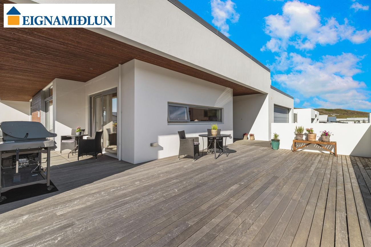 Húsið stendur á snyrtilegri lóð meðupphitað bílaplan sem rúmar vel þrjá bíla. Timburverönd er við inngang við suðurhorn hússins og steyptir skjólveggir. Frá verönd er gengið út á svalir sem eru meðfram suð- og vesturhlið hússins. Einnig er hægt að ganga niður á hellulagða verönd með heitum potti.