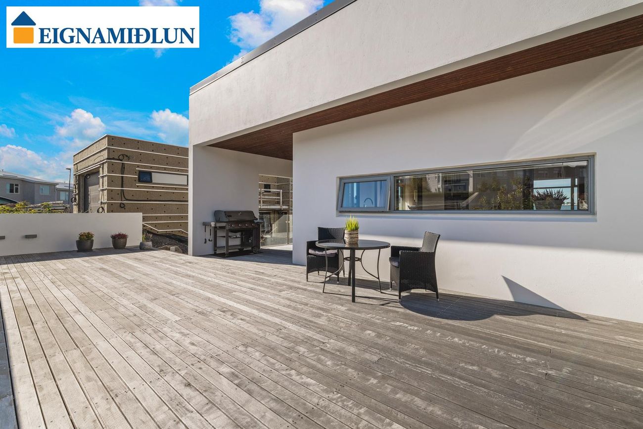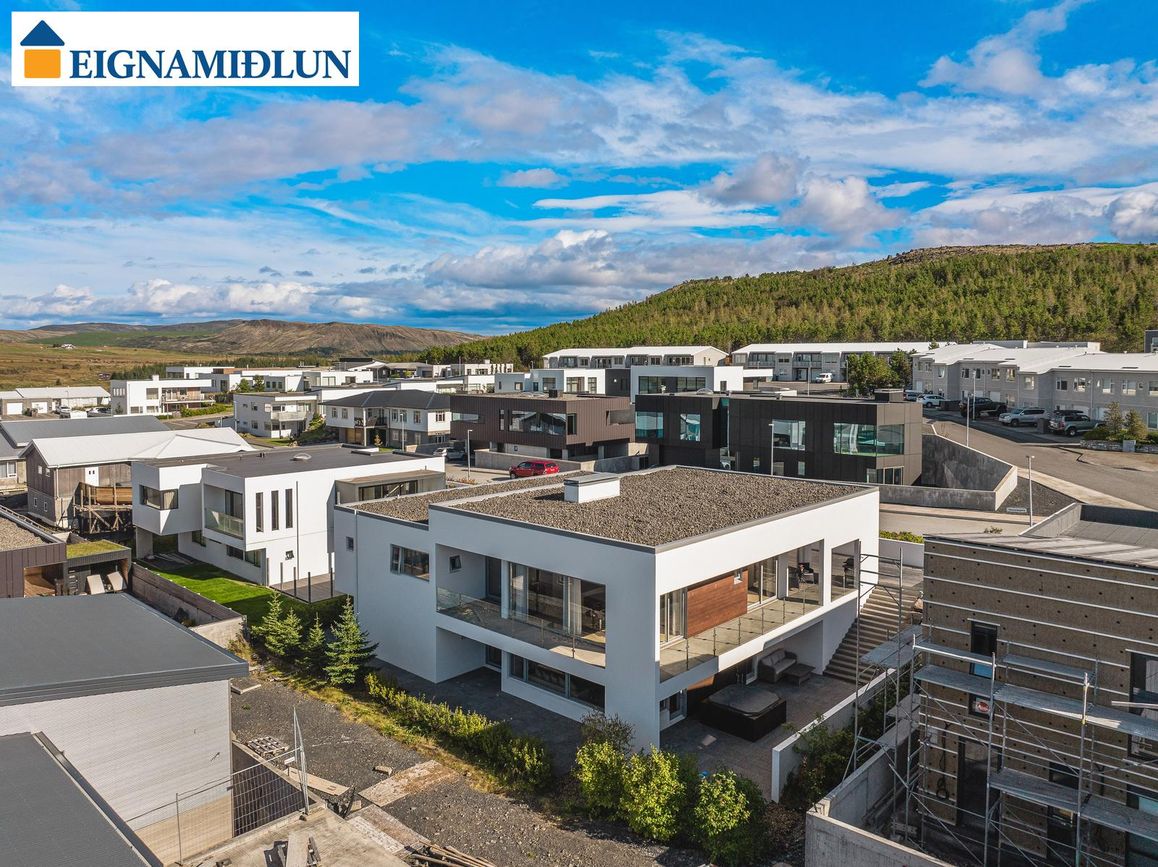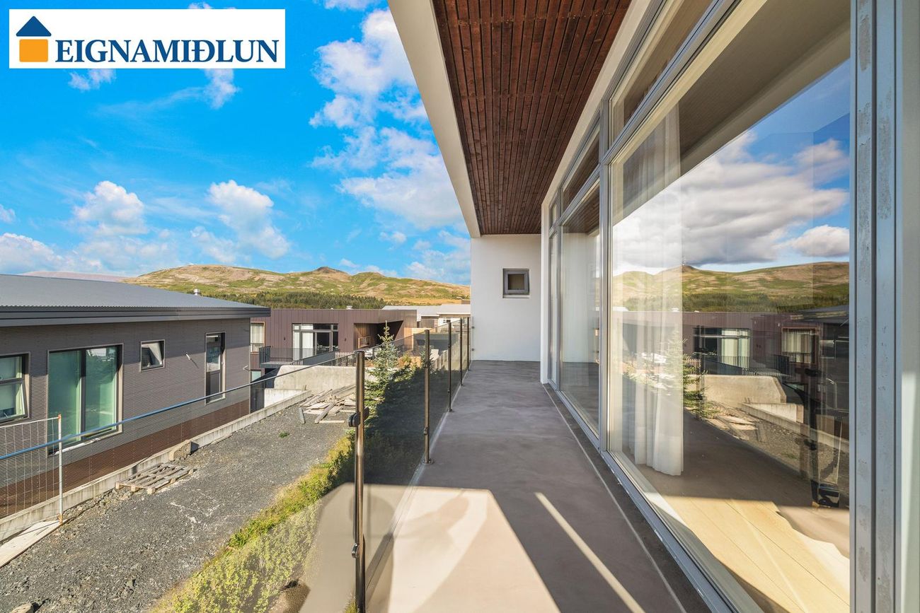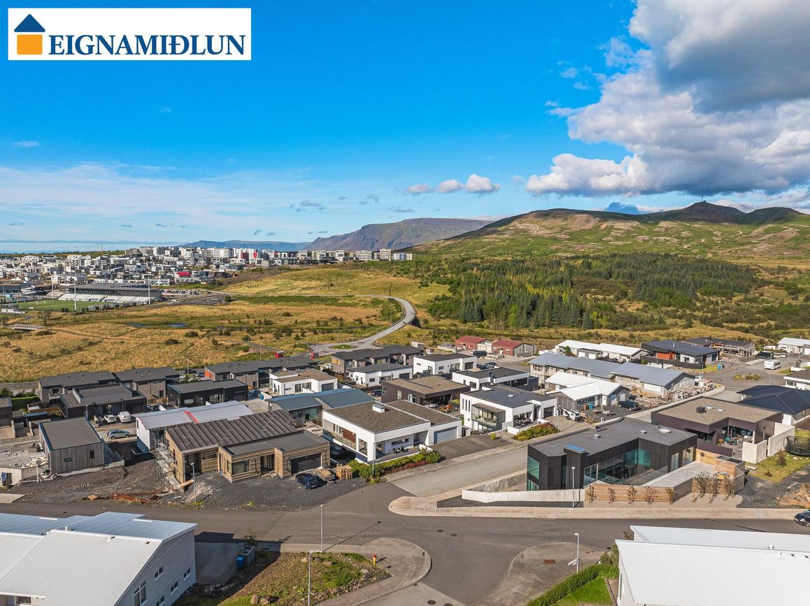 Húsið stendur á snyrtilegri lóð meðupphitað bílaplan sem rúmar vel þrjá bíla. Timburverönd er við inngang við suðurhorn hússins og steyptir skjólveggir. Frá verönd er gengið út á svalir sem eru meðfram suð- og vesturhlið hússins. Einnig er hægt að ganga niður á hellulagða verönd með heitum potti.
