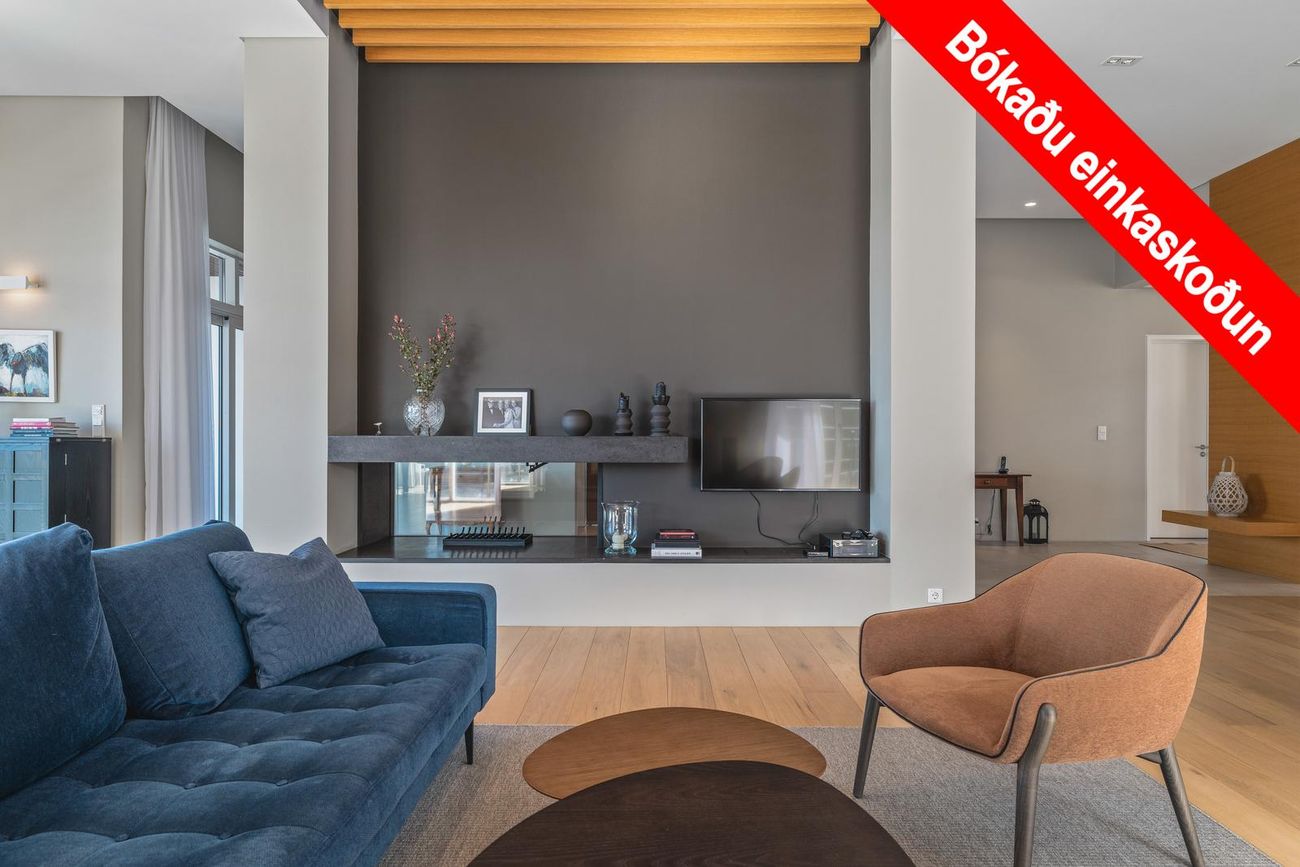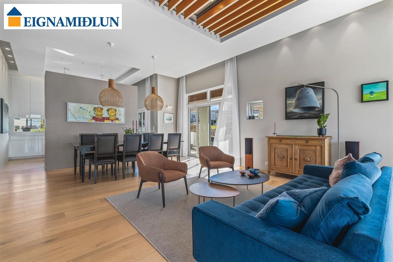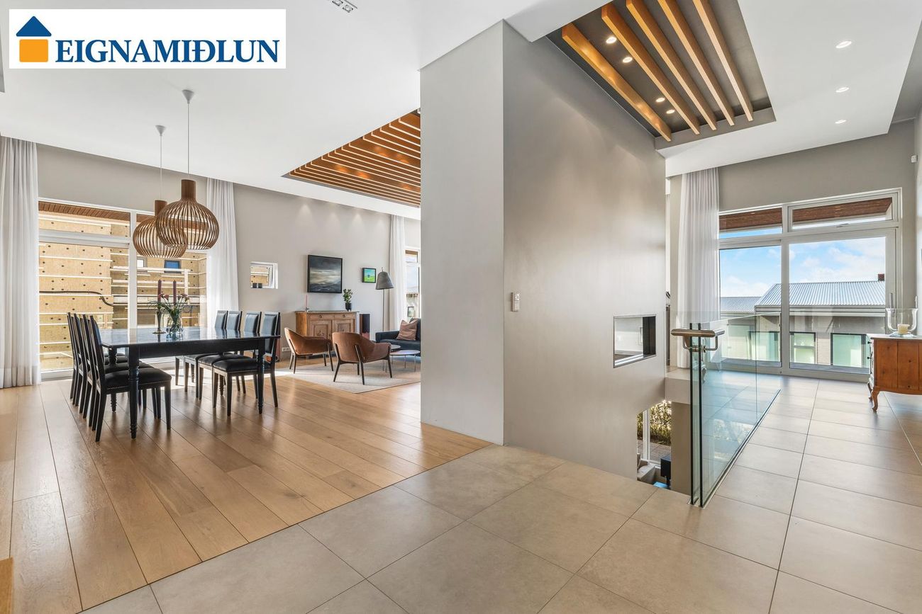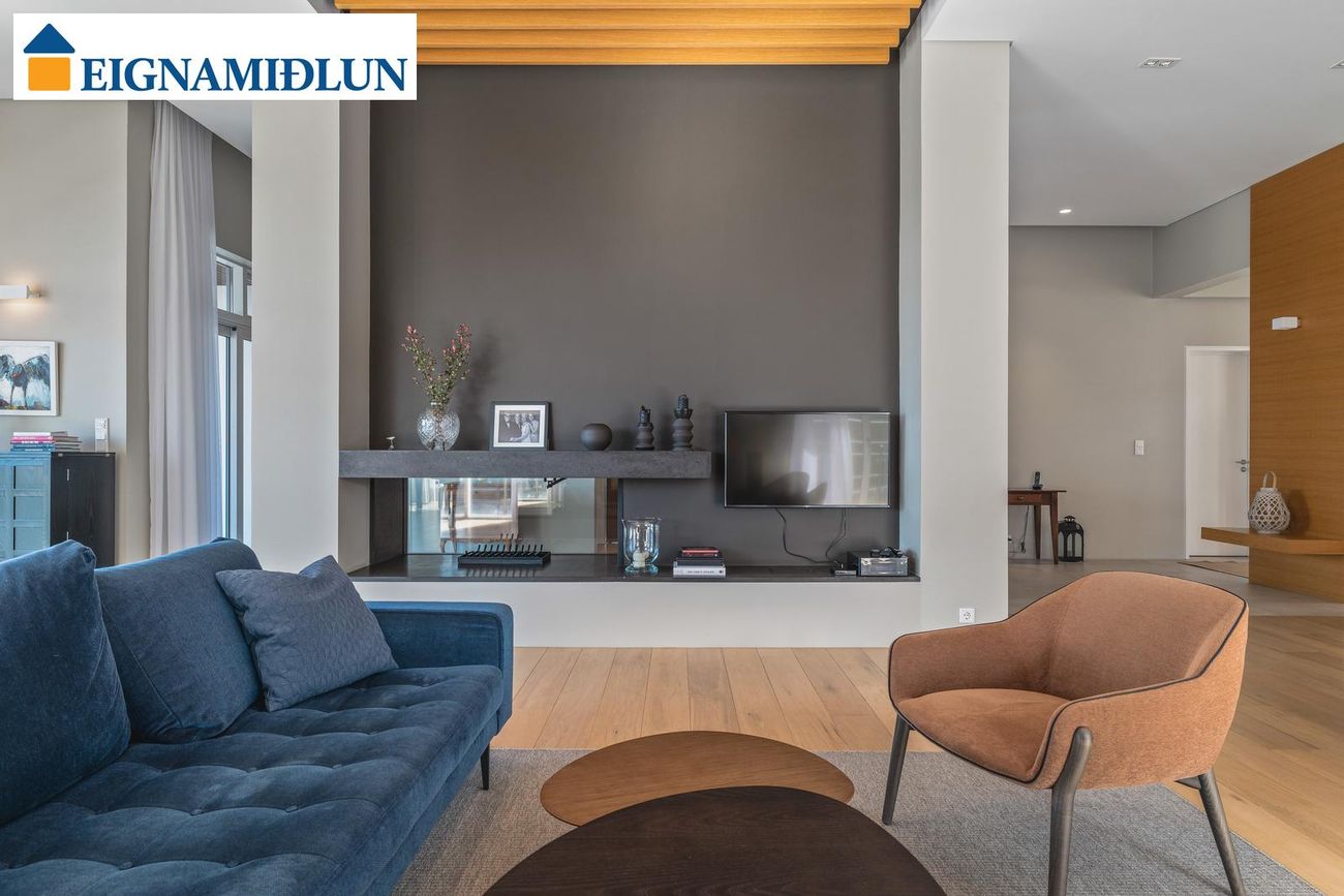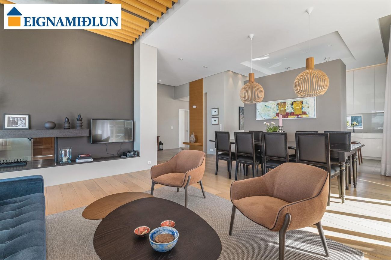 Tvær samliggjandi stofur með mikilli lofthæð. Niðurtekið loft með hljóðgildrum. Arin. Gólfsíðir gluggar eru á tvo vegu inn í rýmið.