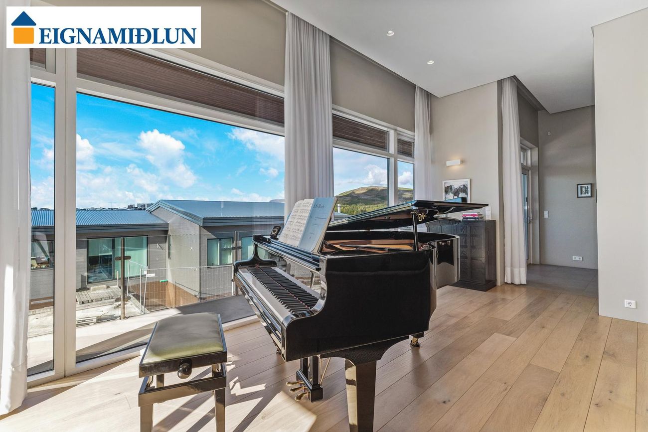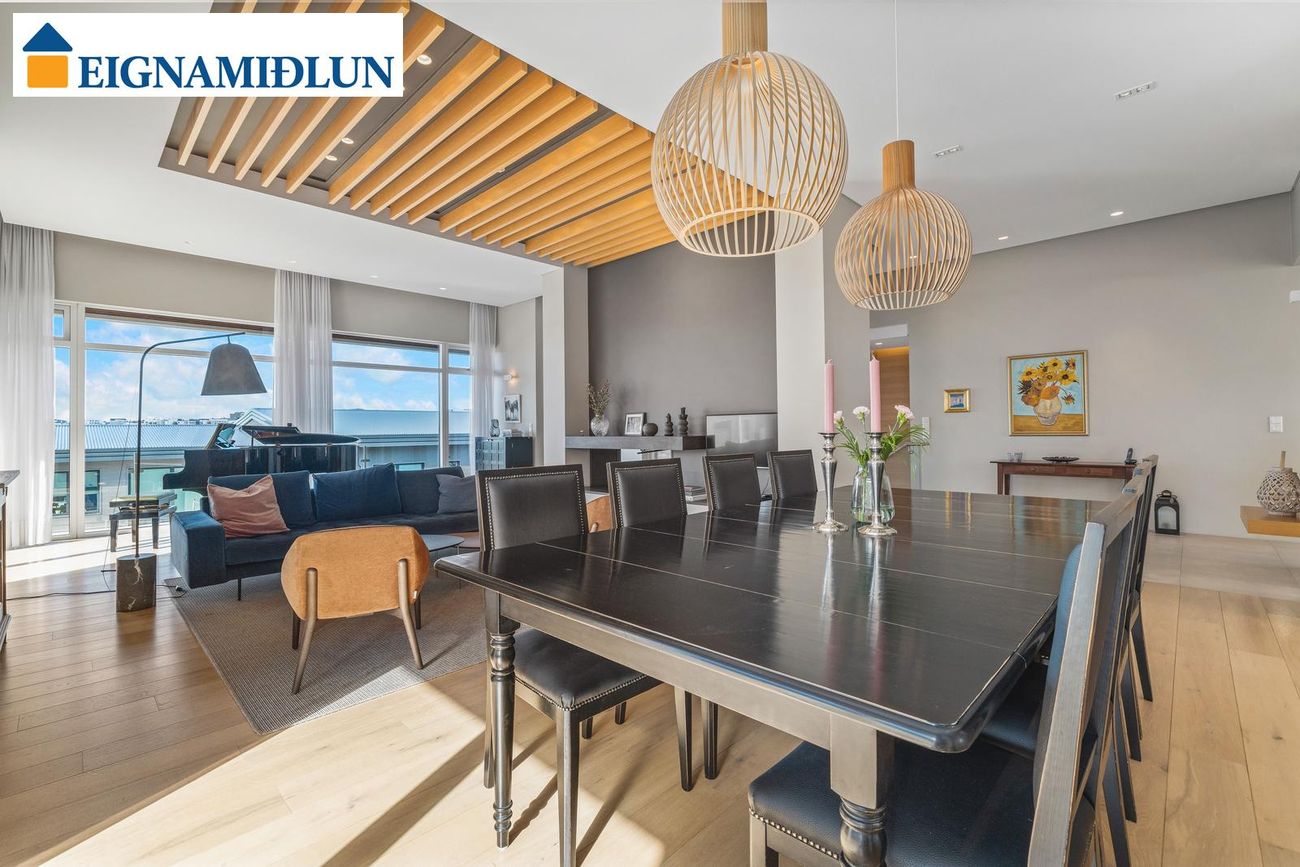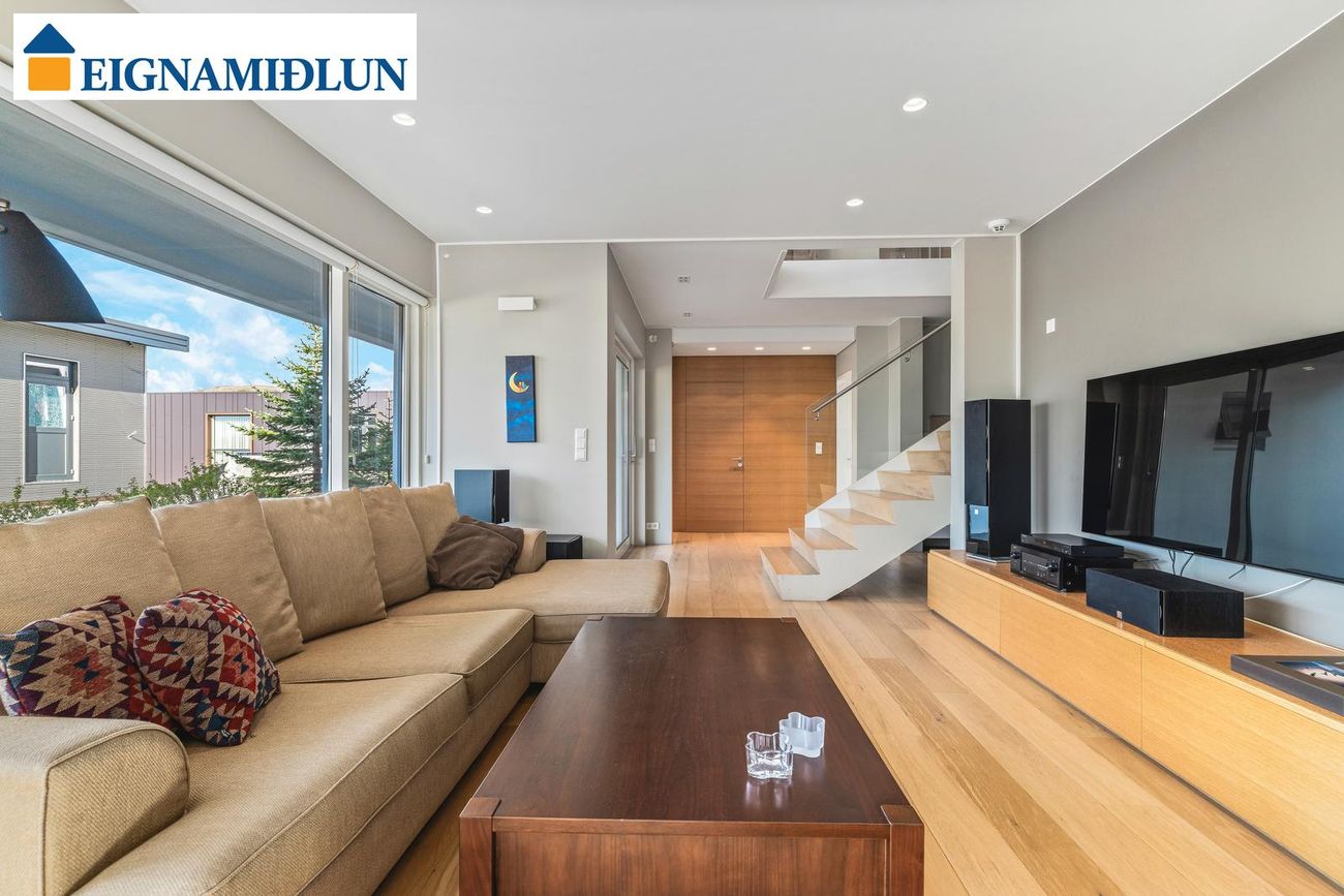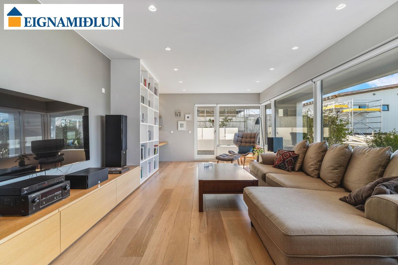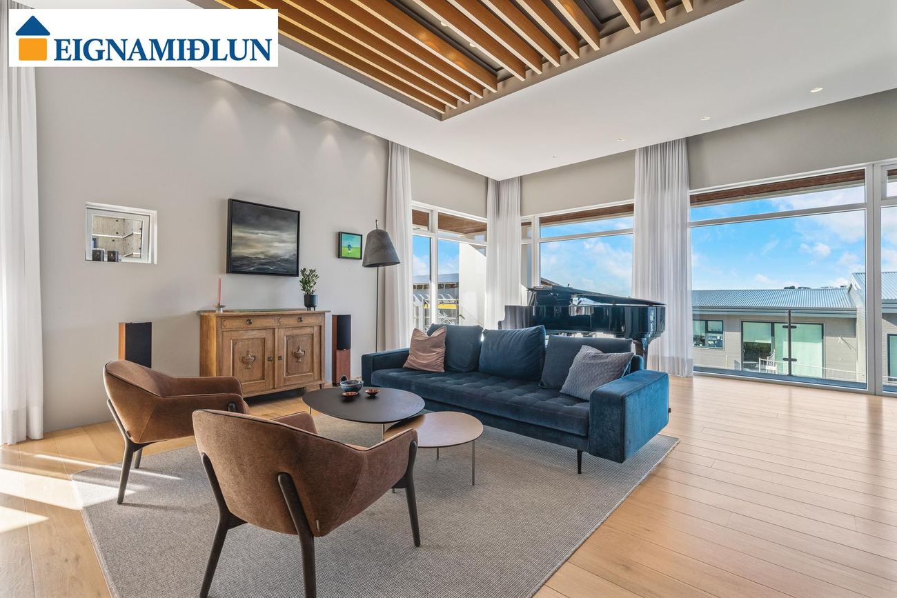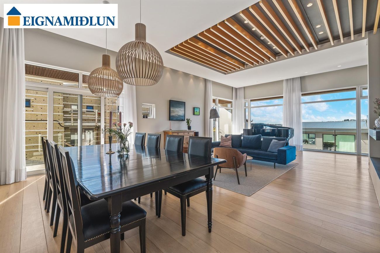 Tvær samliggjandi stofur með mikilli lofthæð. Niðurtekið loft með hljóðgildrum. Arin. Gólfsíðir gluggar eru á tvo vegu inn í rýmið.