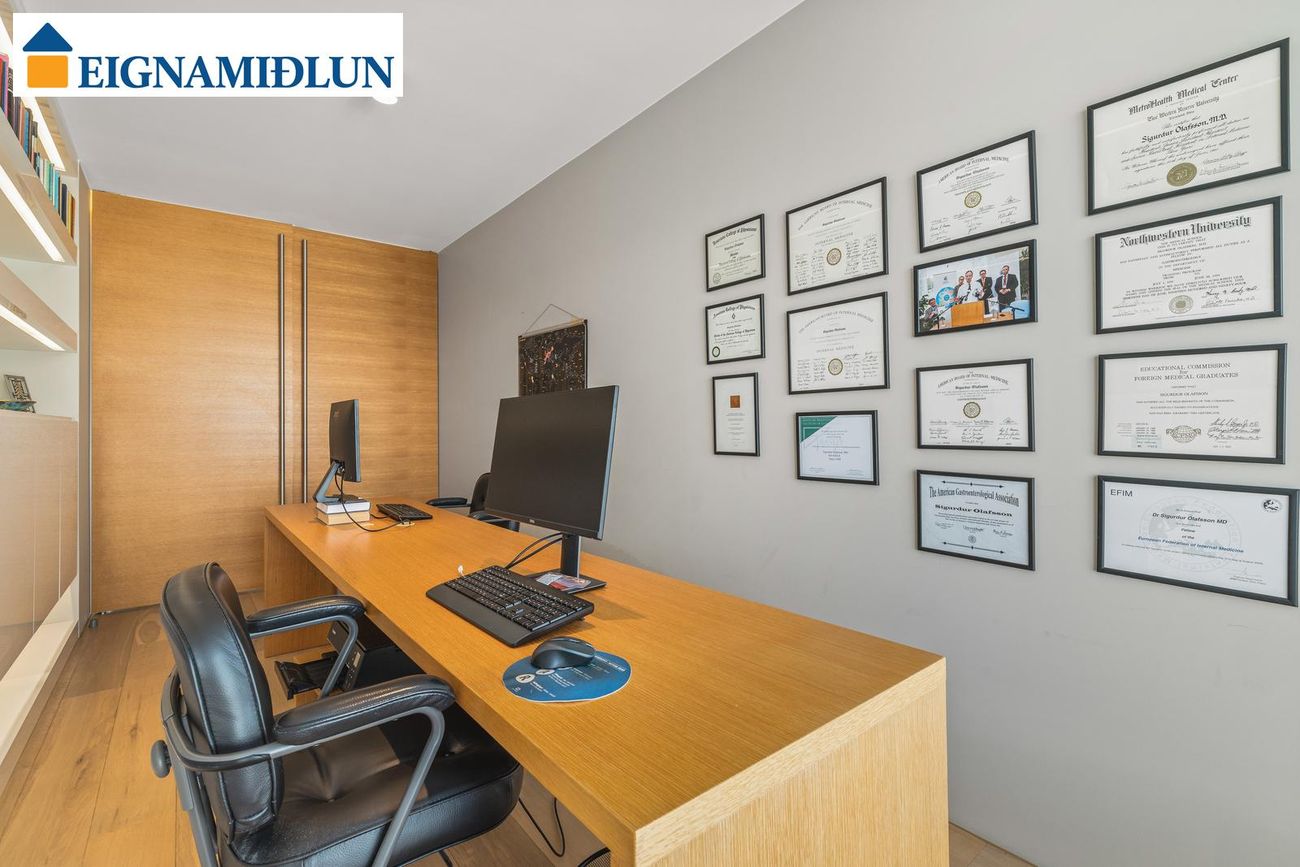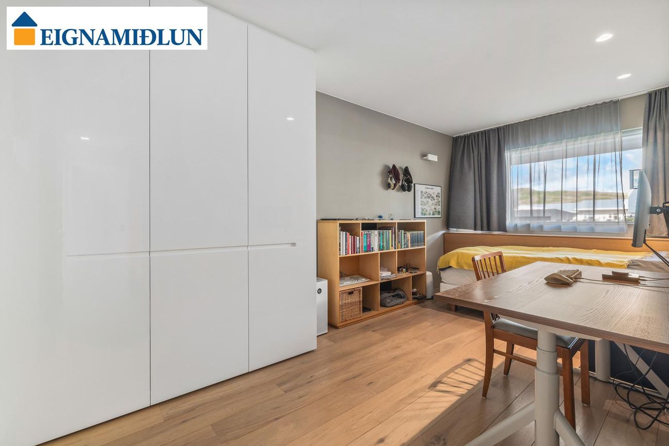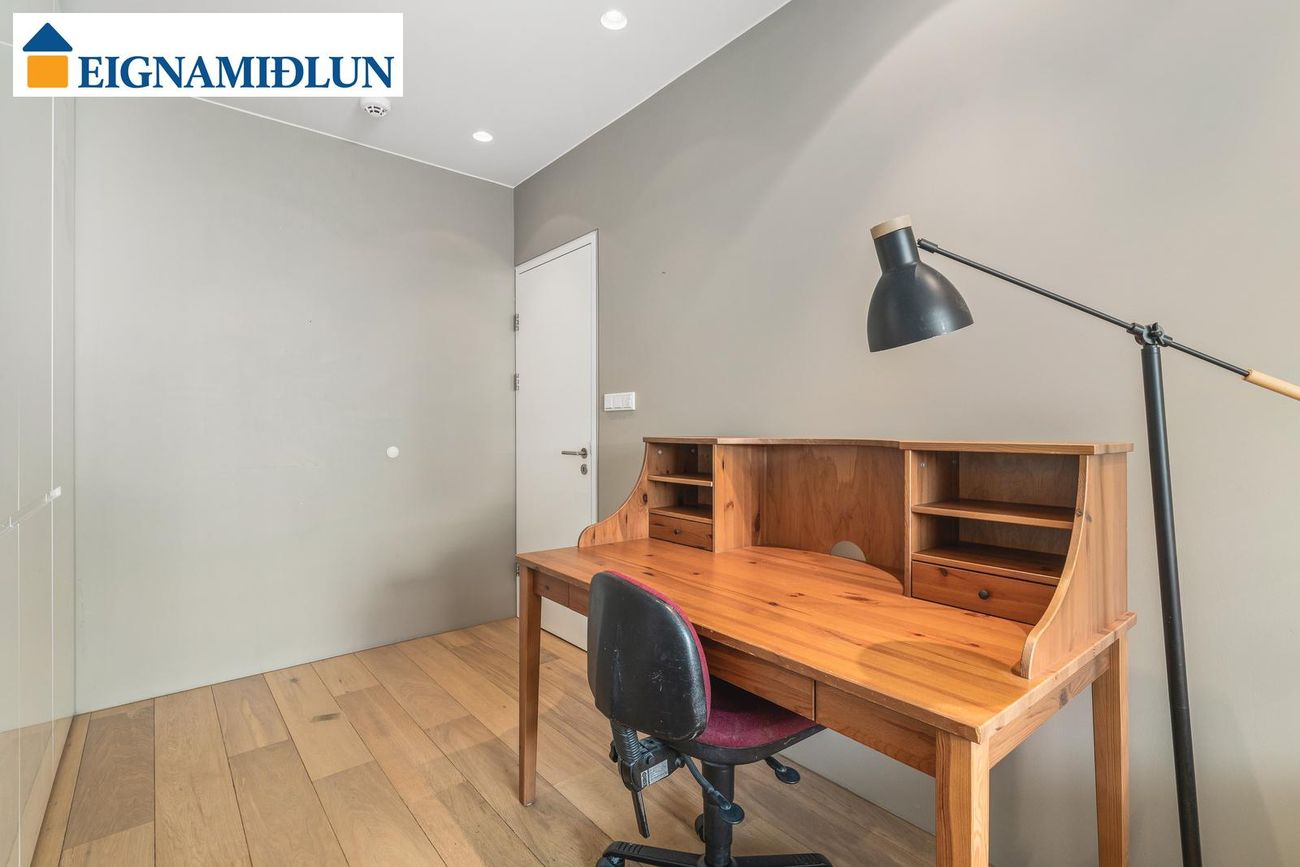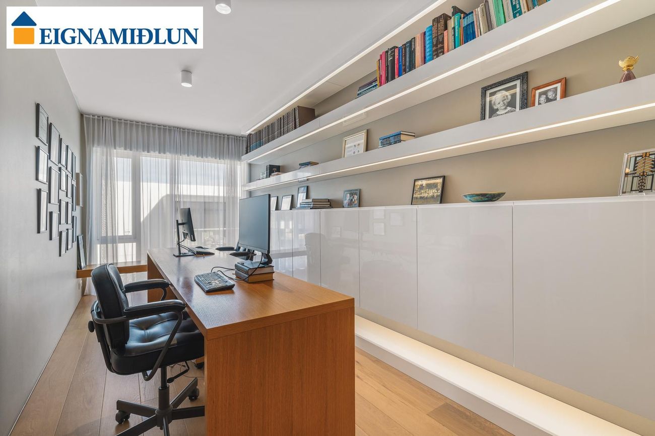 Rúmgóð skrifstofa með fallegum upphengdum skápum og hillum. Væri einnig hægt að nýta sem svefnherbergi. Glæsileg tvöföld hurð sem nær alveg upp í loft svo hægt er að opna rýmið alveg við gang.