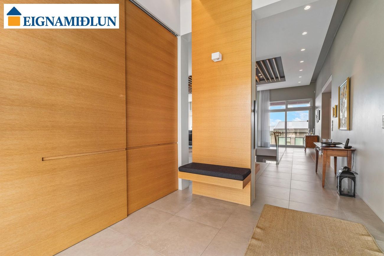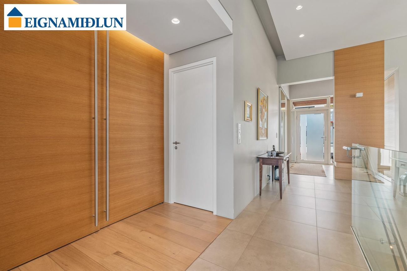 *Smelltu hér fyrir söluyfirlit*Efri hæð - Anddyri, stofa, borðstofa, eldhús, gangur, gestasalerni, skrifstofa, hjónasvíta og bílskúr.Gengið er inn í anddyri með stórum fataskápum með rennihurð. Flísar á gólfi.