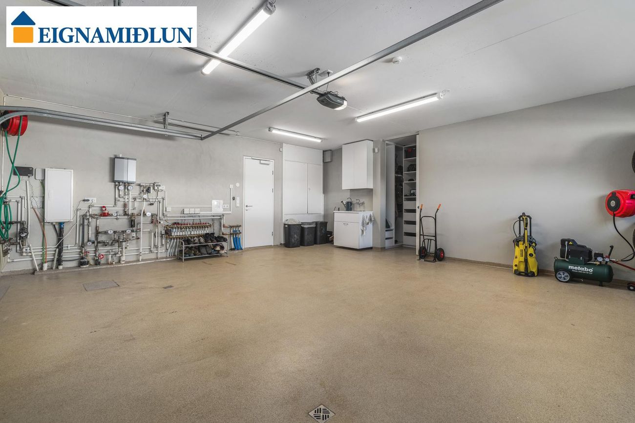Frá anddyri er inngengt í rúmgóðan bílskúr. Bílskúrinn er rúmgóður með rafmagnsdrifinni hurð. Það er geymsla inn af bílskúr með góðu skápaplássi. Heildarstærð bílskúrs m. geymslu er 59,2 fm.