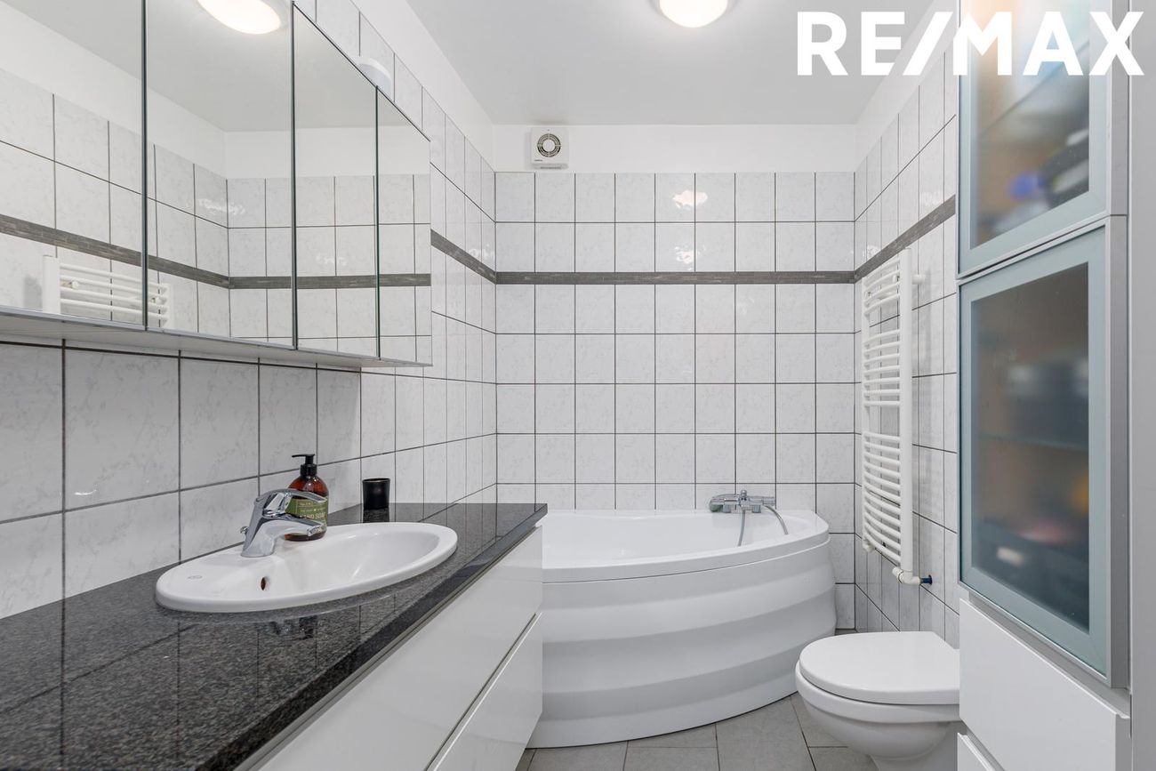 Flísalagt með hornbaðkar og sturtuklefa, hvít innrétting með granít borðplötu, upphengt salerni og handklæðaofn.