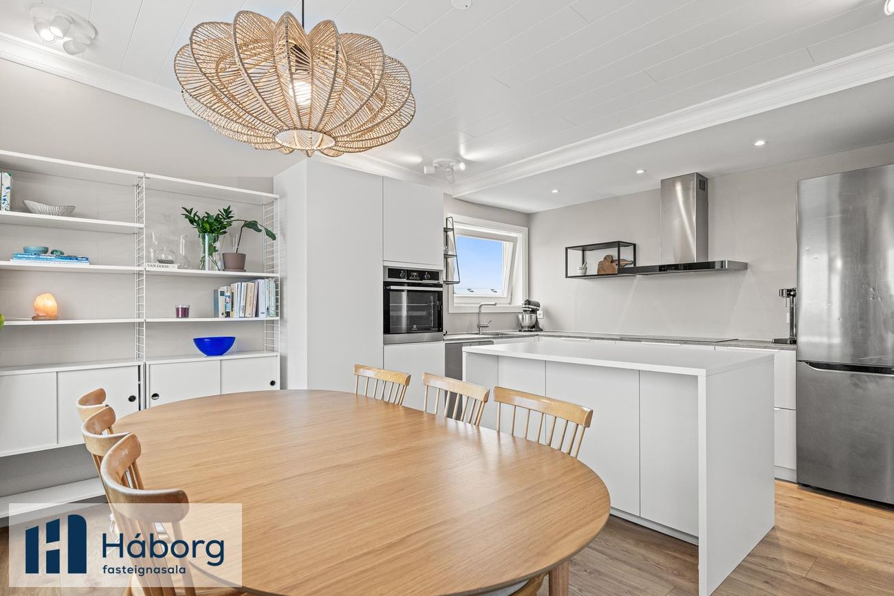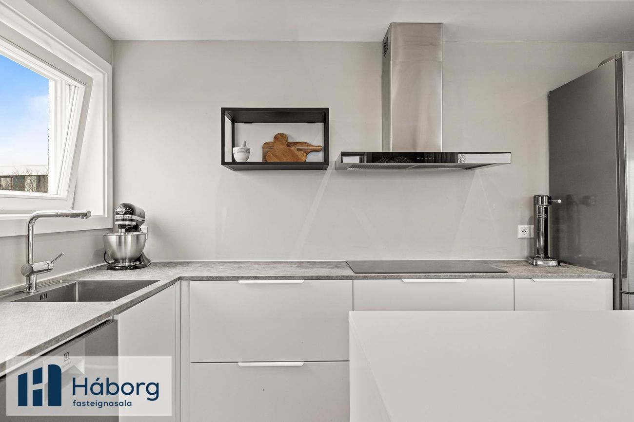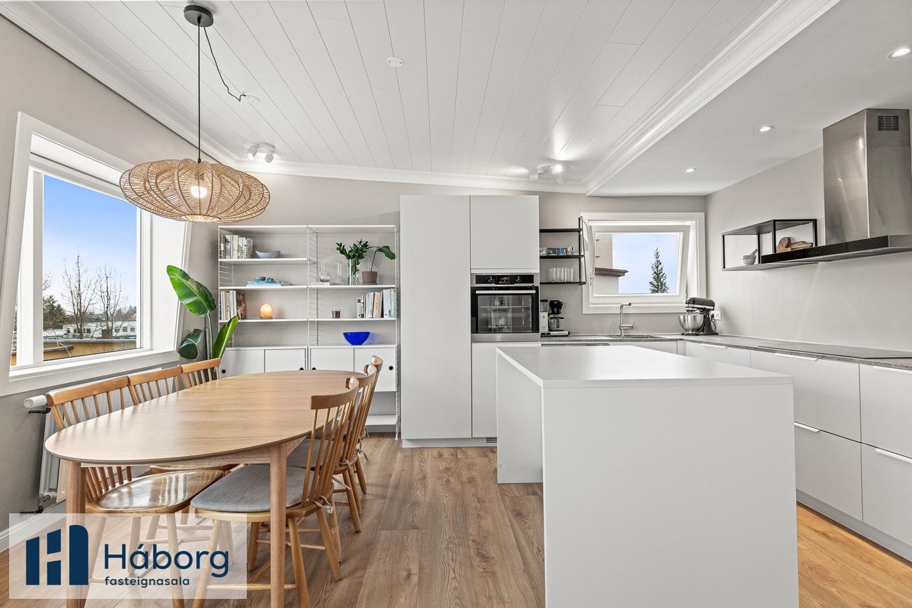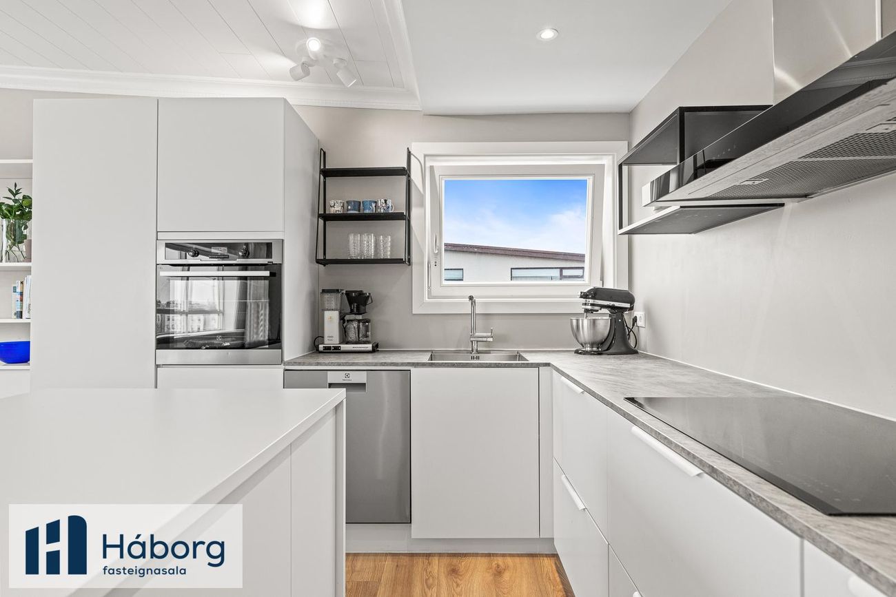 Eldhúsið er stílhreint með hvítum innréttingum en það var endurnýjað árið 2021 og það sama ár voru innihurðar, gólfefni og skápar á gangi og í hjónaherbergi endurnýjaðir.
