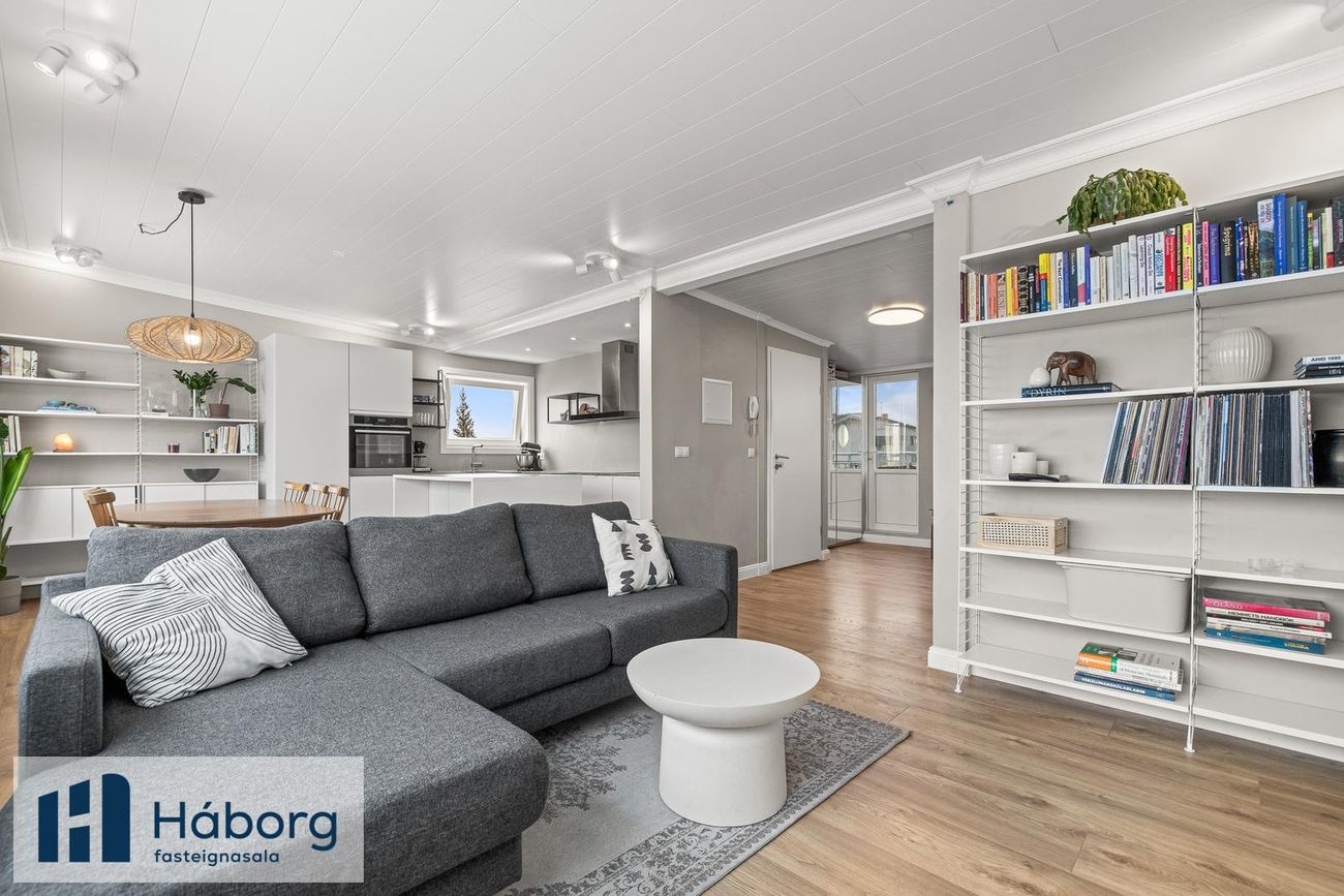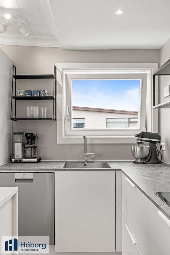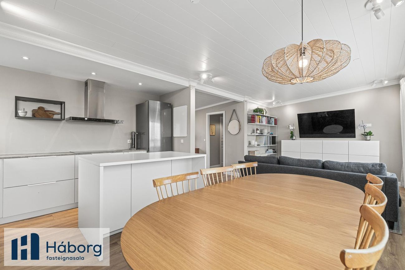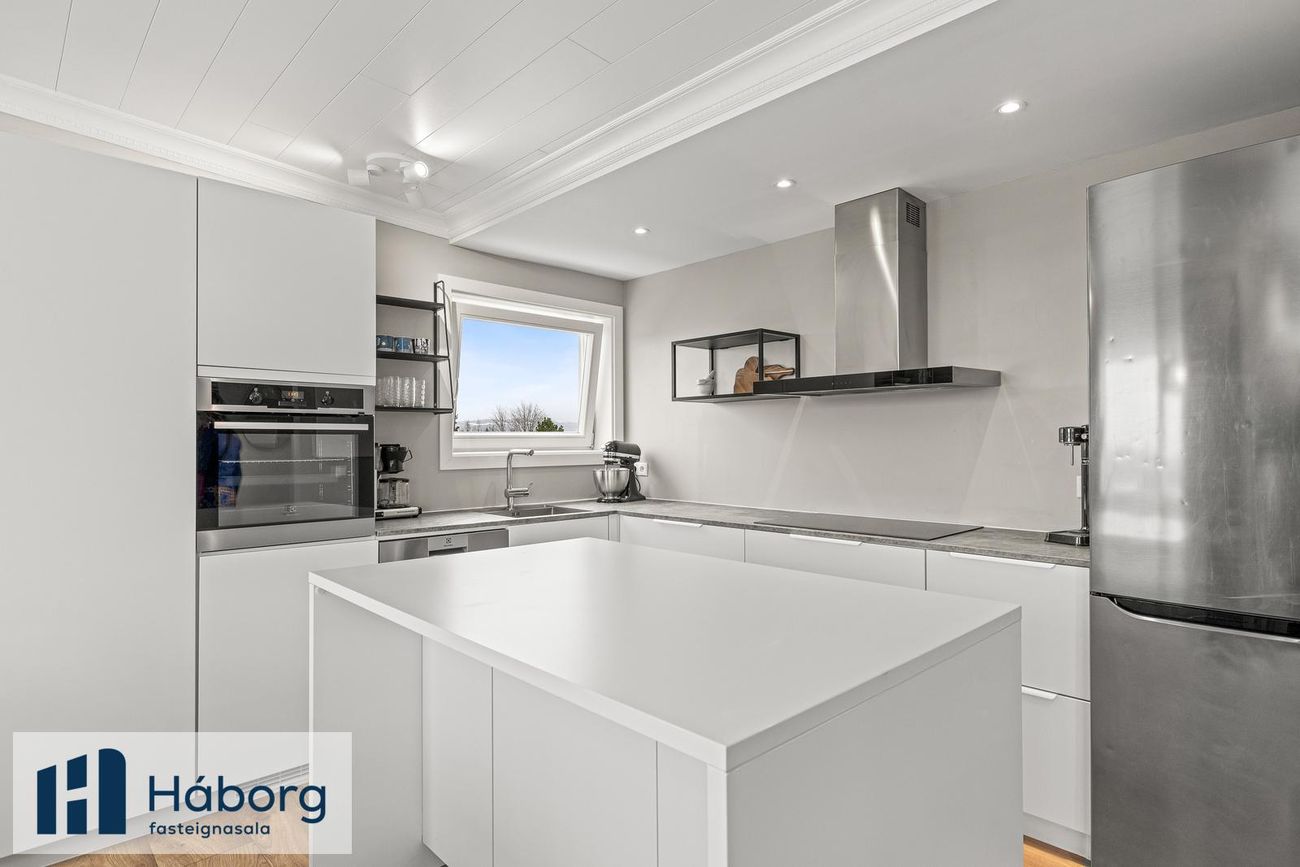 Eldhúsið er stílhreint með hvítum innréttingum en það var endurnýjað árið 2021 og það sama ár voru innihurðar, gólfefni og skápar á gangi og í hjónaherbergi endurnýjaðir.