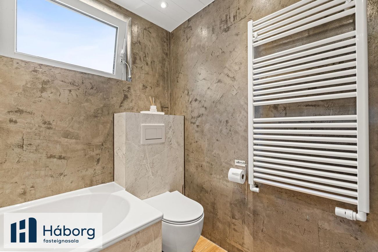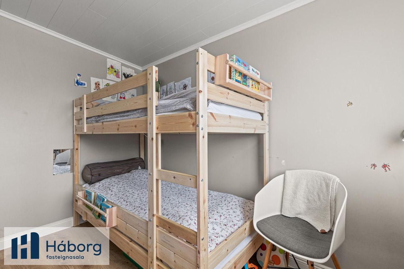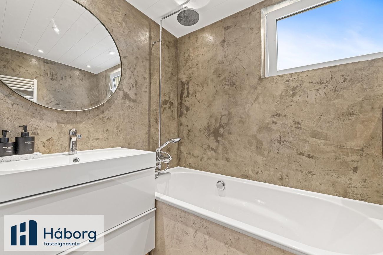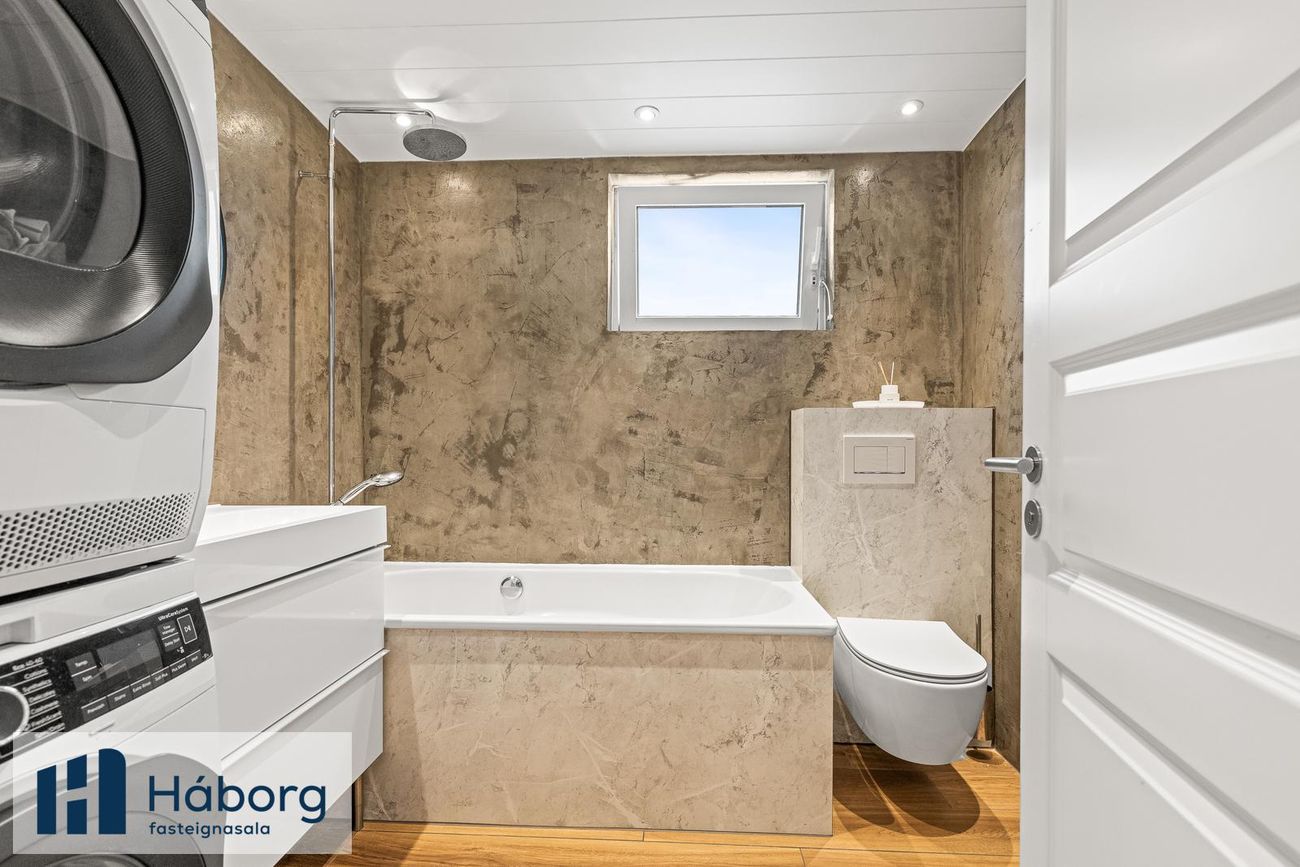 Fallegt harðparket er á öllum gólfum nema á baðgólfi þar sem eru parketflísar, en baðherbergið var glæsilega endurnýjað árið 2020 með gólfhita, baðkeri með sturtu í og tengi fyrir þvottavél og þurrkara ásamt handklæðaofni. Opnanlegur gluggi er á baðherberginu. Gangur með góðum skápum liggur úr alrýminu, en þar er baðherbergið ásamt þremur svefnherbergjum. Fyrst á vinstri hönd er gott barnaherbergi, næst er minna barnaherbergi sem nú er nýtt sem skrifstofa og loks hjónaherbergið er rúmgott með gluggum á tvo vegu með fallegu útsýni og góðu skápaplássi.