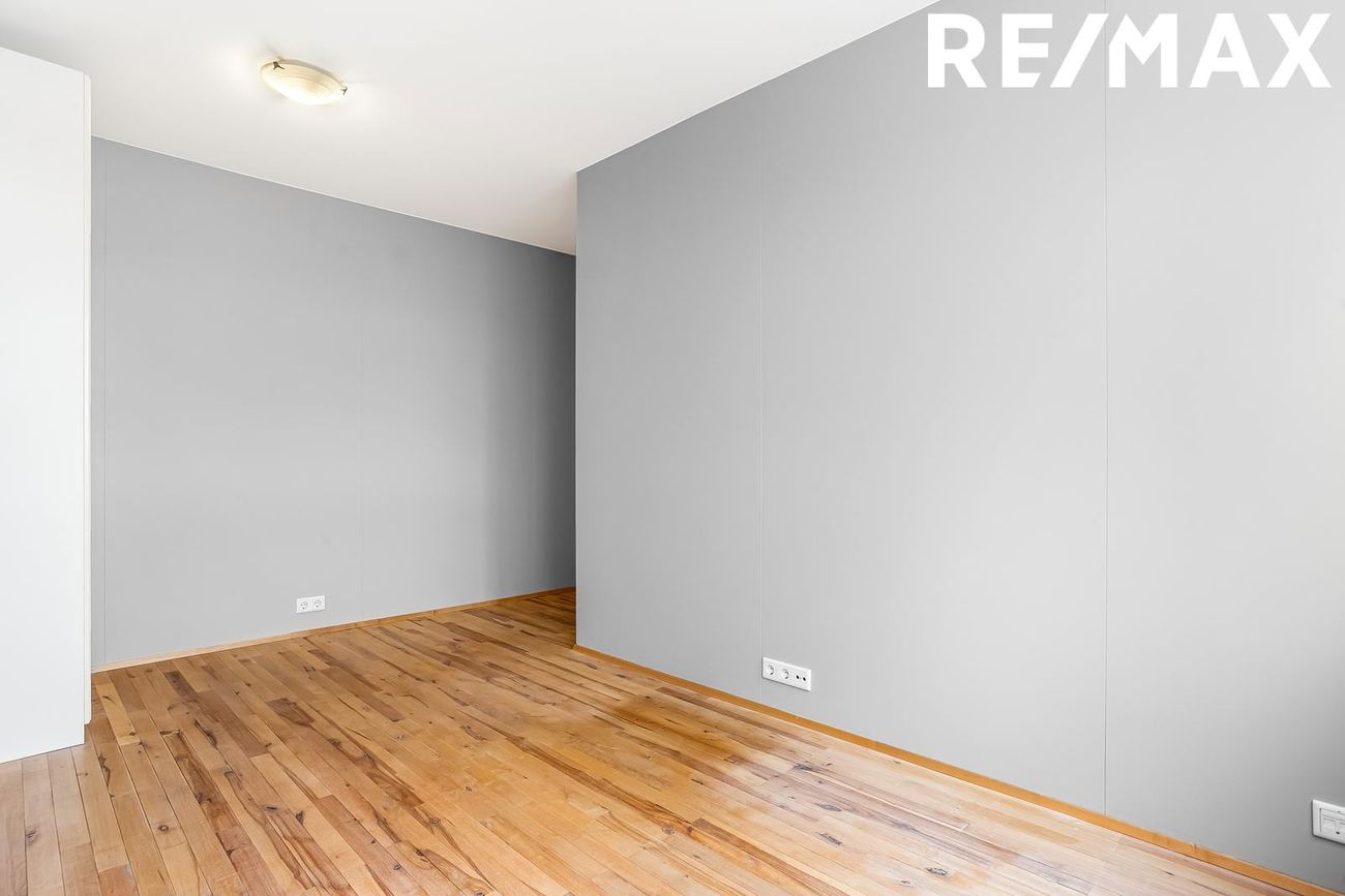 Svefnherbergi IIII: Með parketi á gólfi, gluggum til norðurs, búið er að opna herbergi sem áður var veggur.