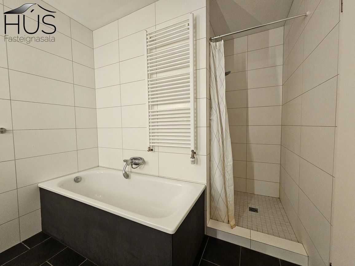 baðherbergi, baðkar, sturta og innrétting. Flísalagt