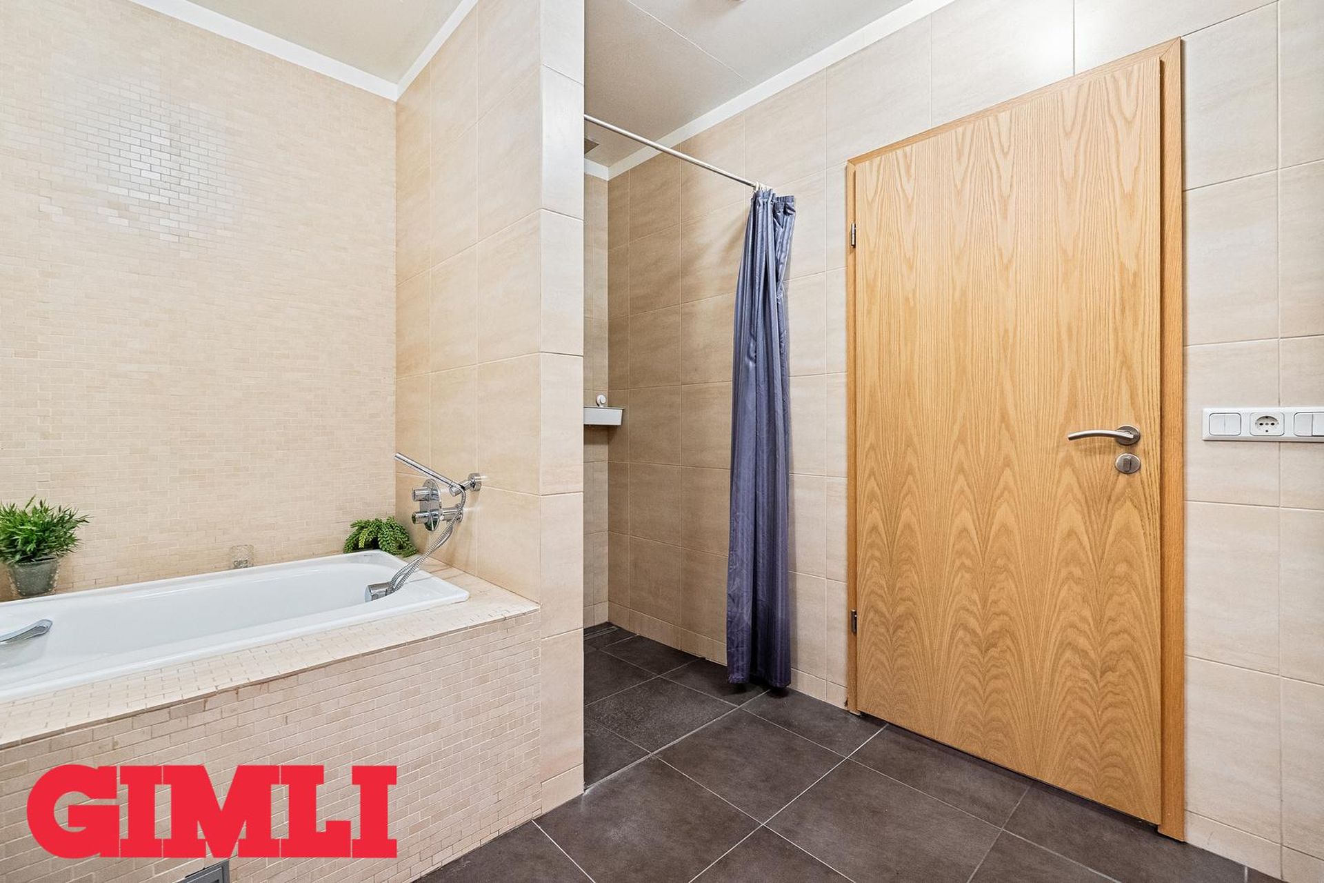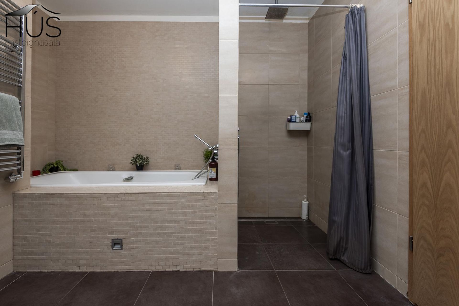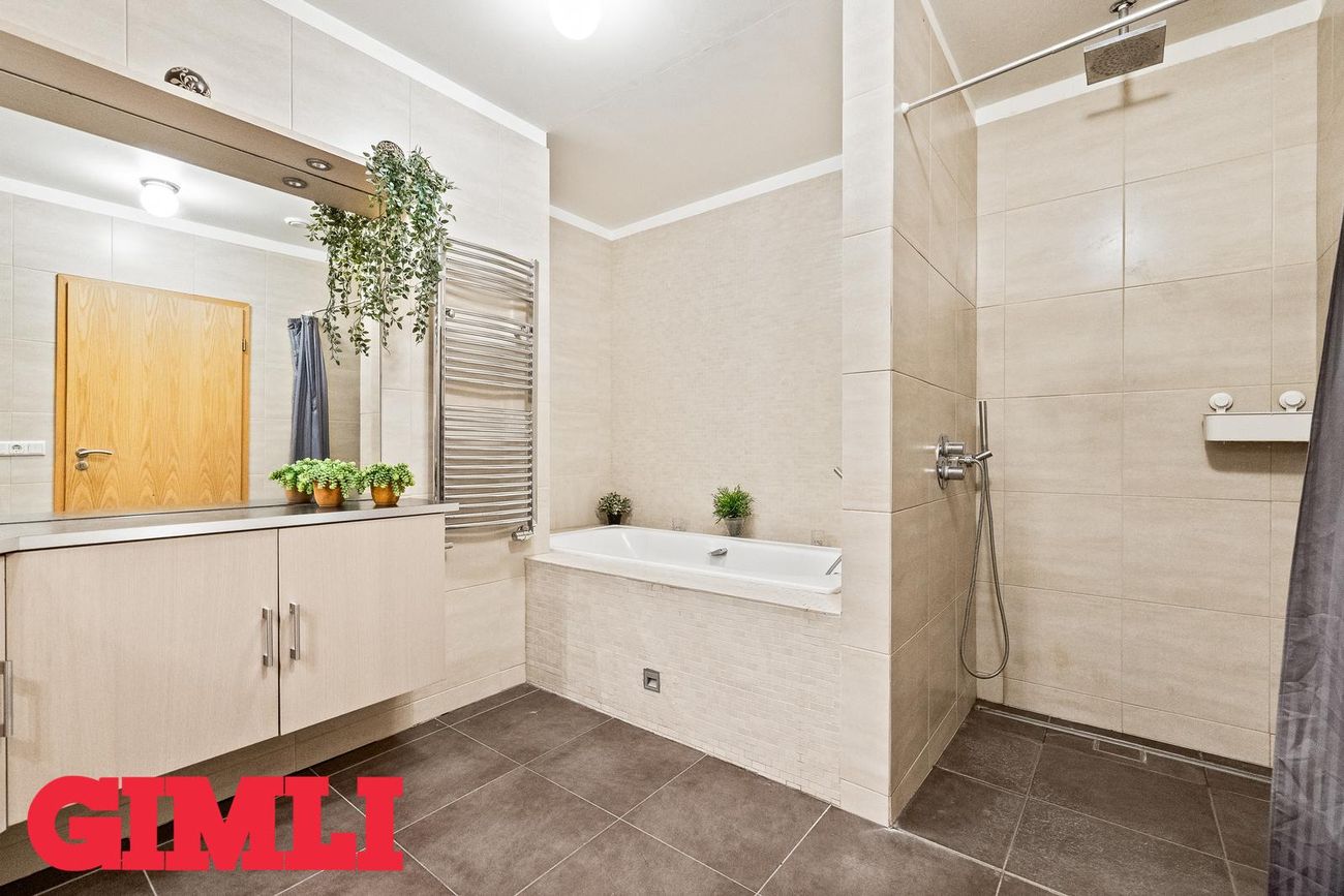 10fm baðherbergi með baðkari, stórri sturtu, handlaug, upphengdu salerni og handklæðaofni. Flísalagt í hólf og gólf.