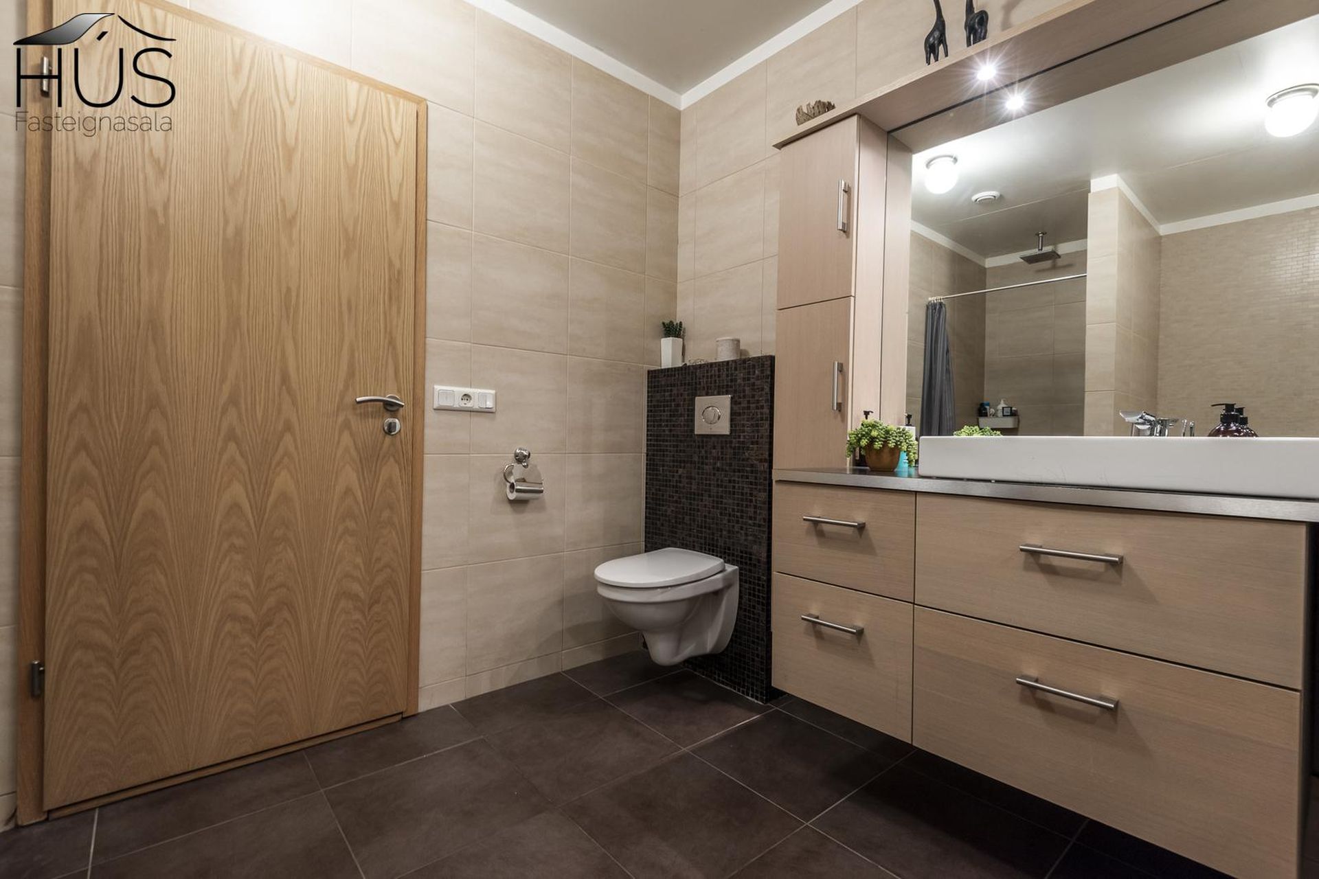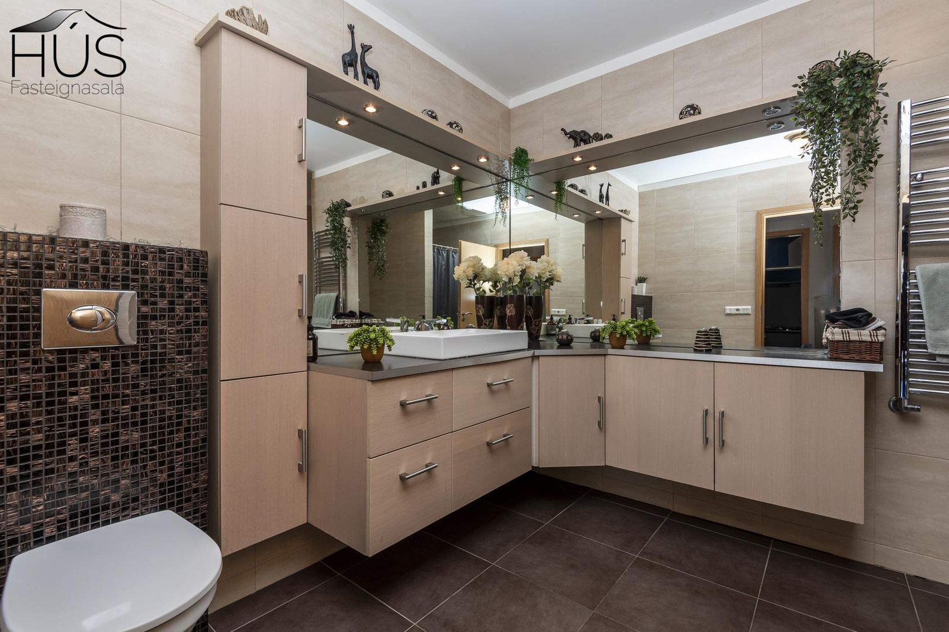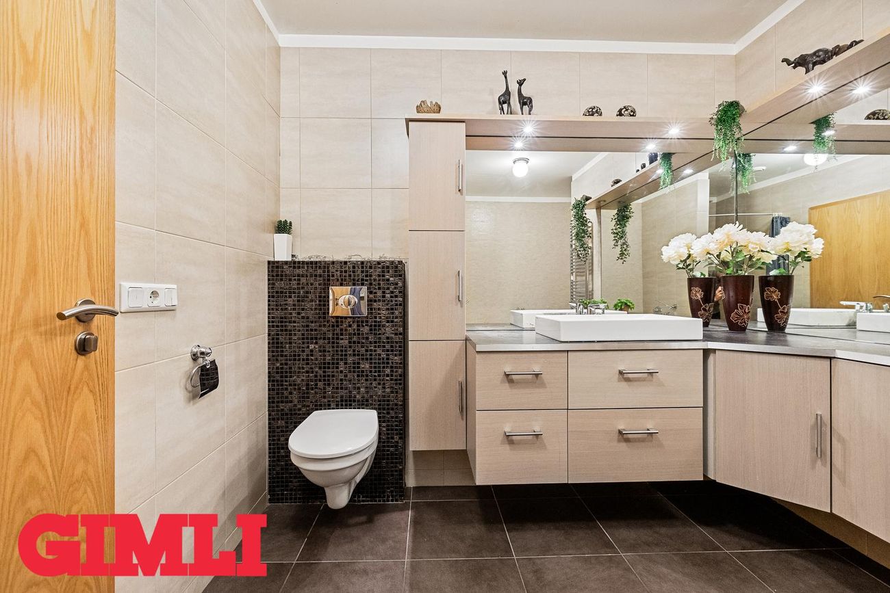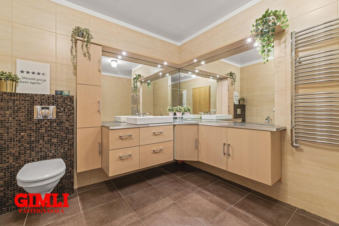 10fm baðherbergi með baðkari, stórri sturtu, handlaug, upphengdu salerni og handklæðaofni. Flísalagt í hólf og gólf.