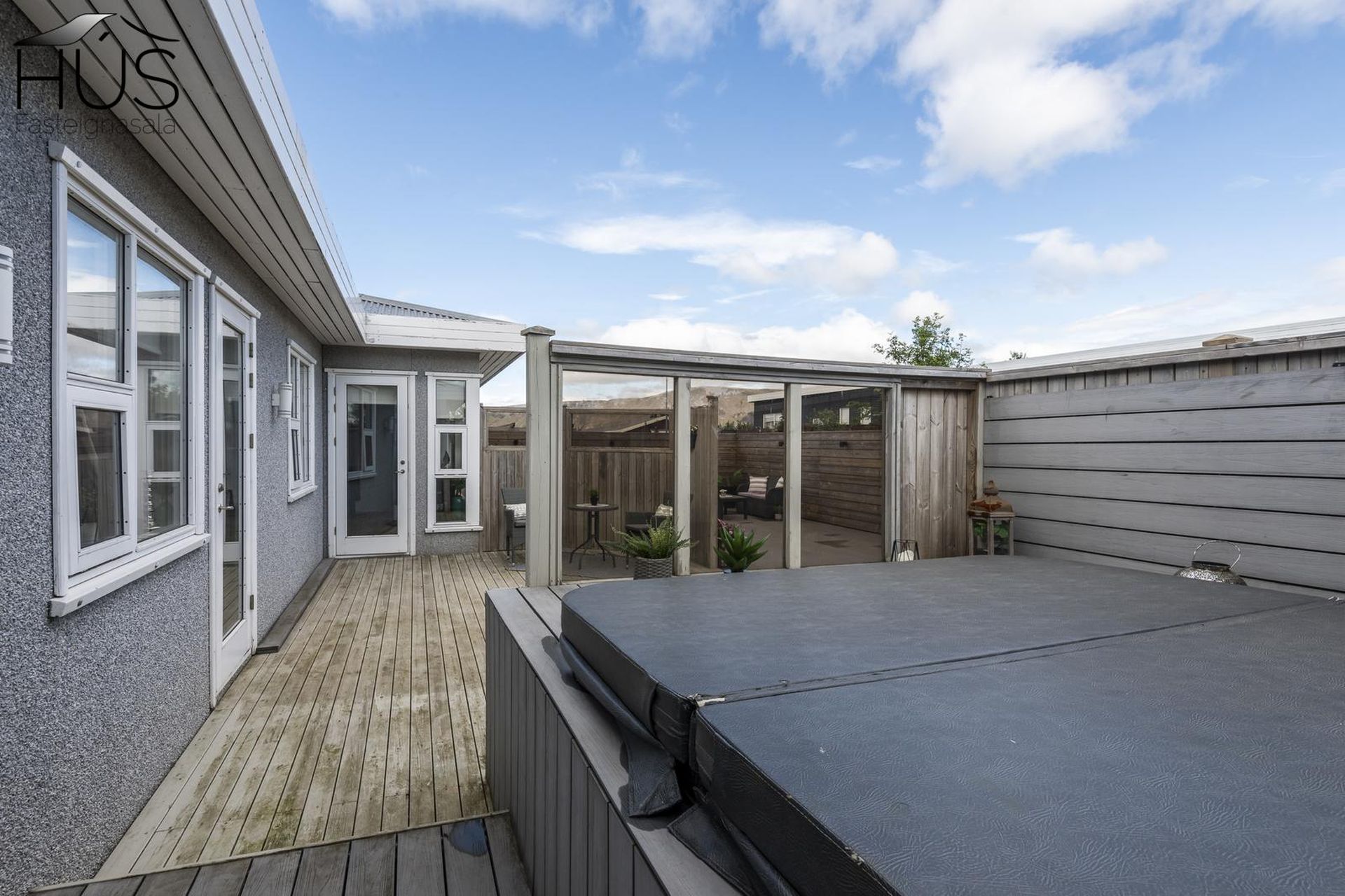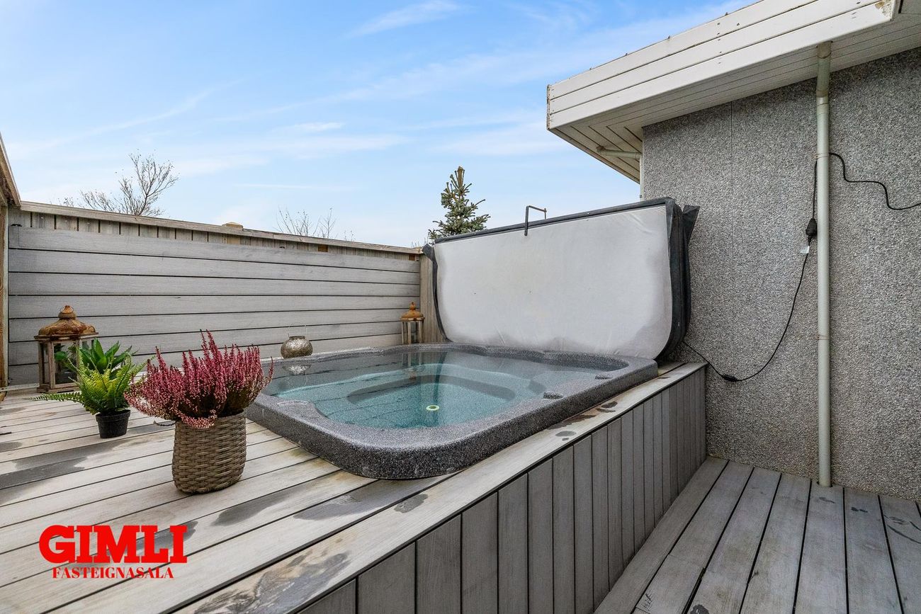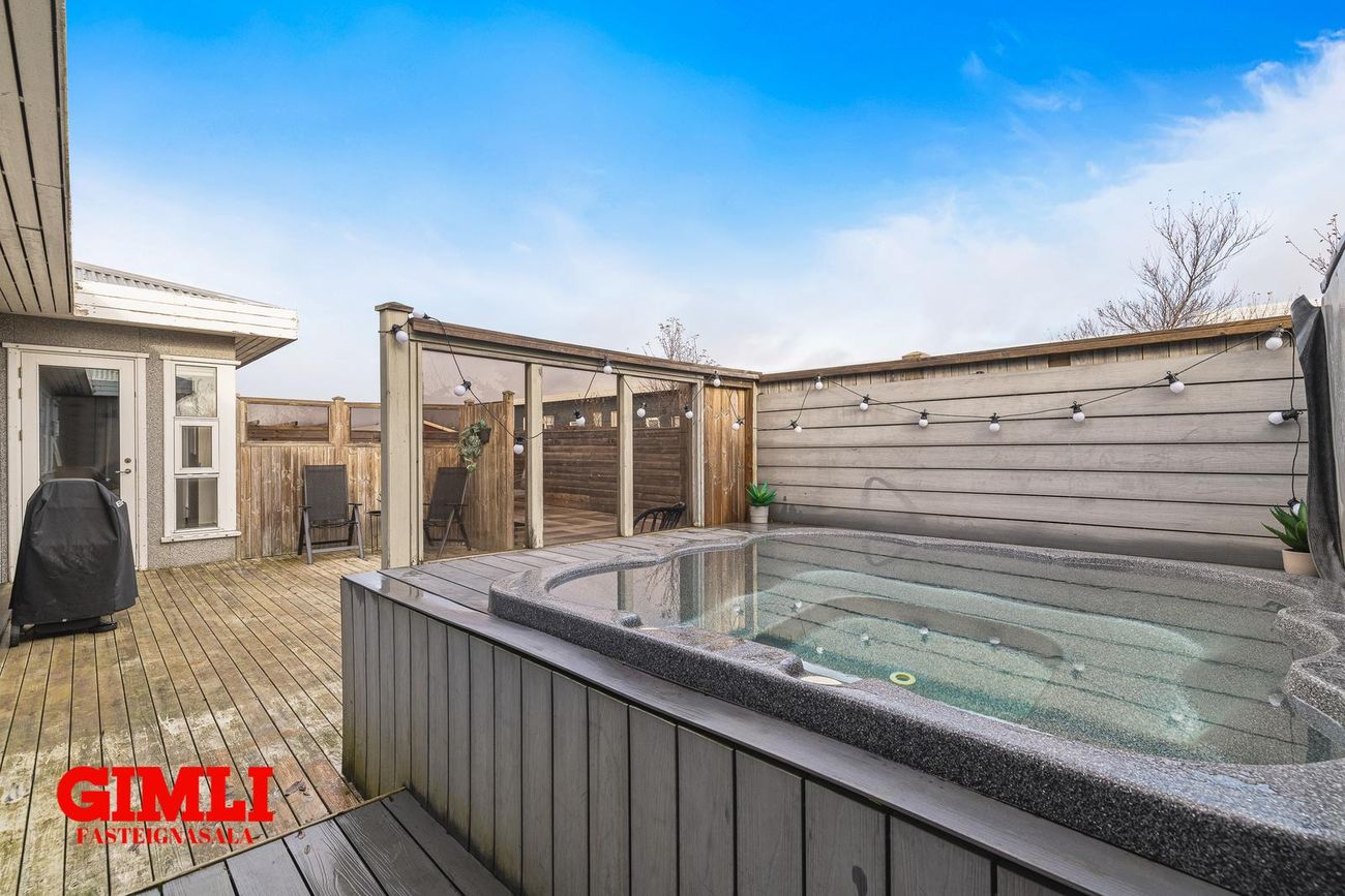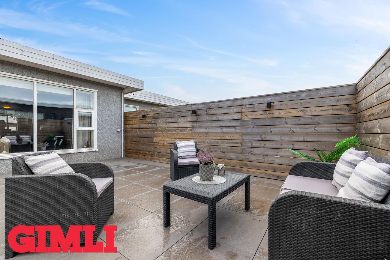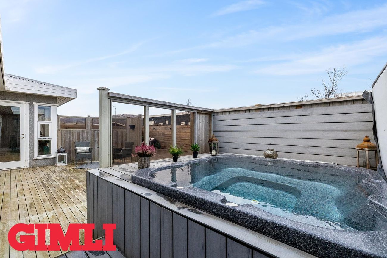 Stórt afgirt útisvæði (100fm) með útiflísum, heitum potti og innbyggðri lýsingu. Steytt verönd framan við hús með skjólveggjum.