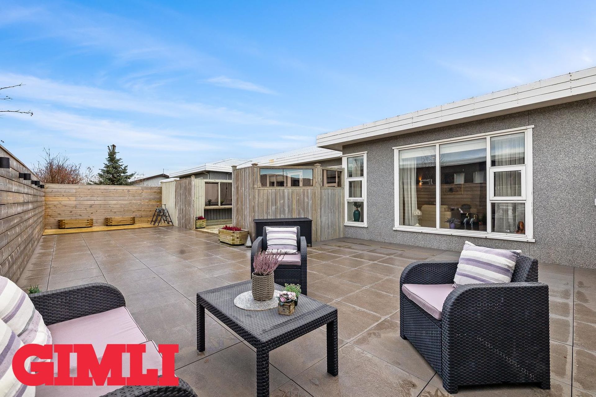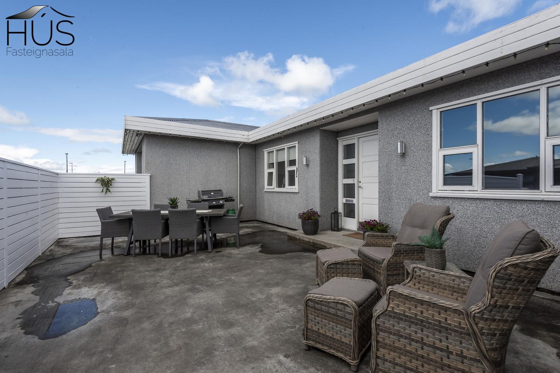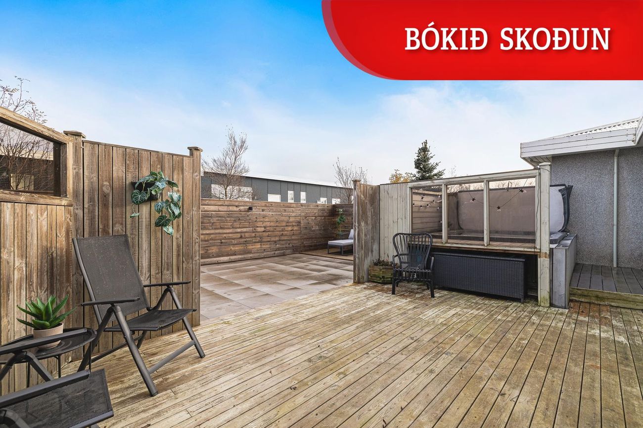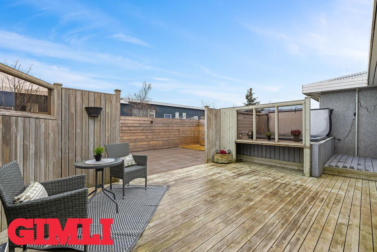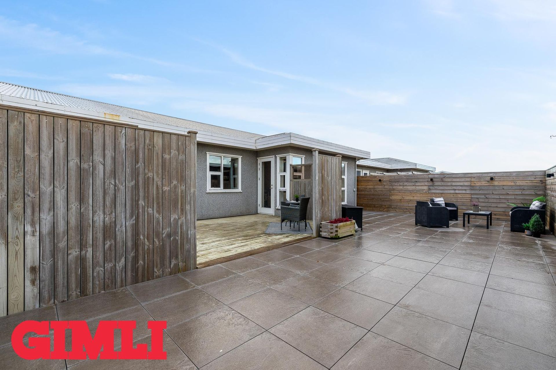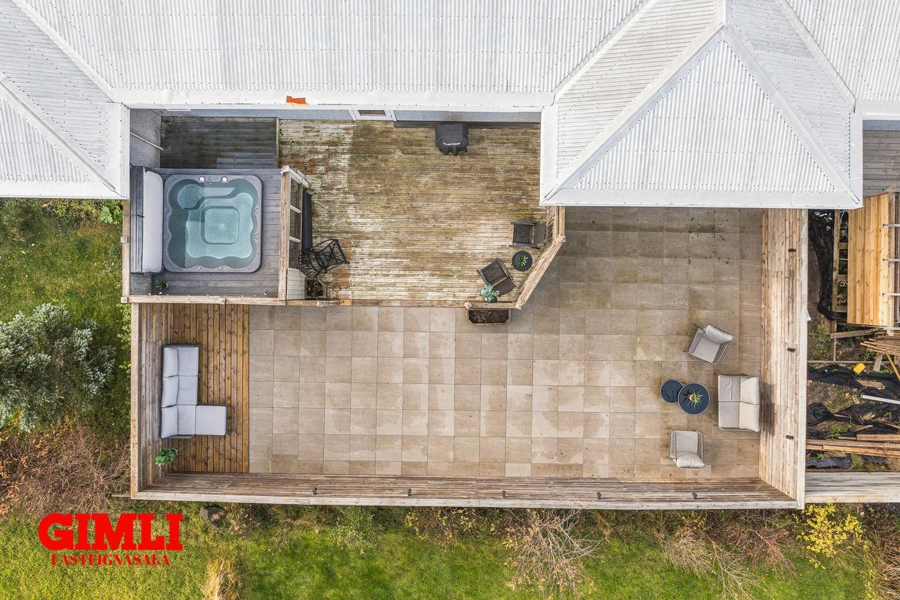 Stórt afgirt útisvæði (100fm) með útiflísum, heitum potti og innbyggðri lýsingu. Steytt verönd framan við hús með skjólveggjum.