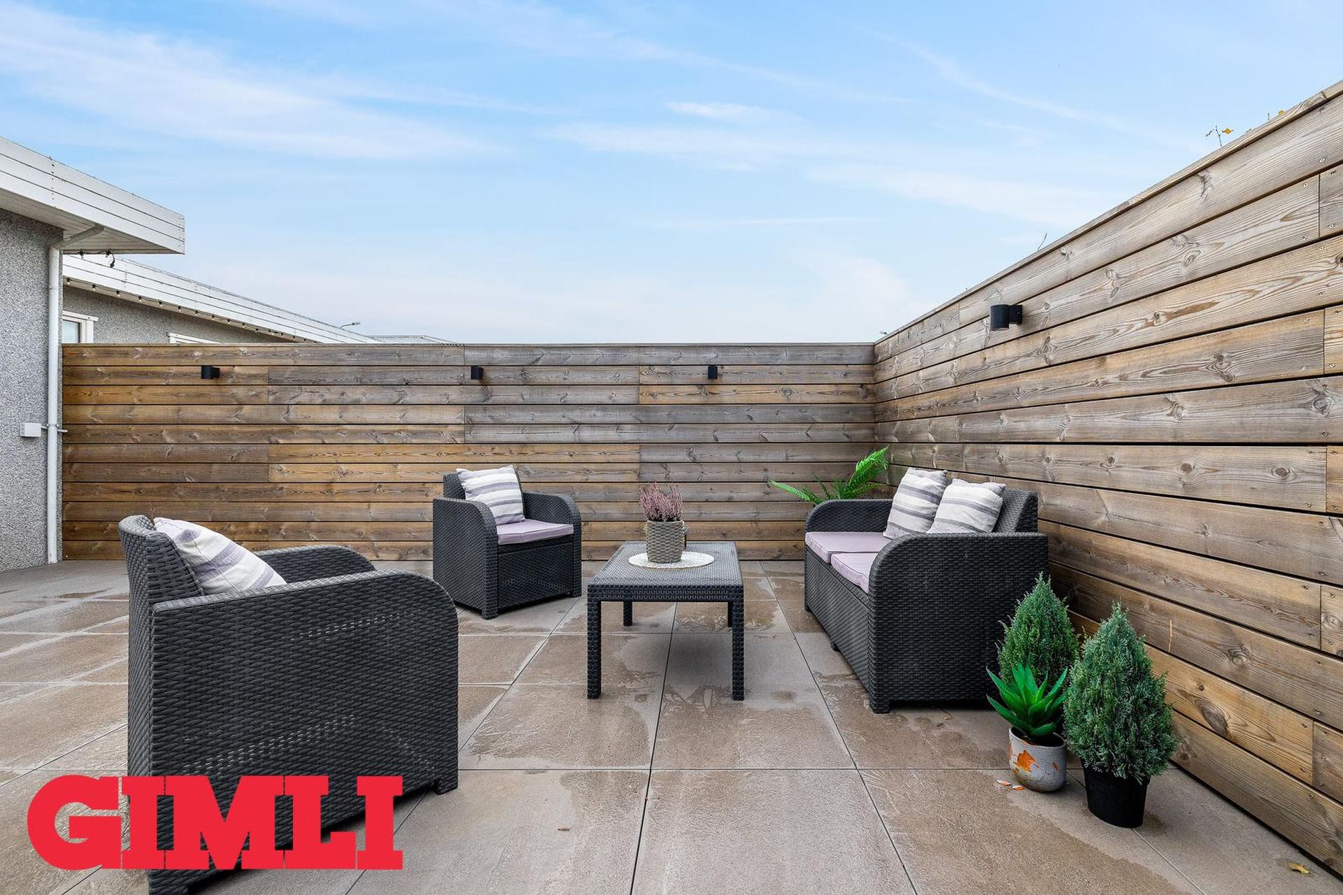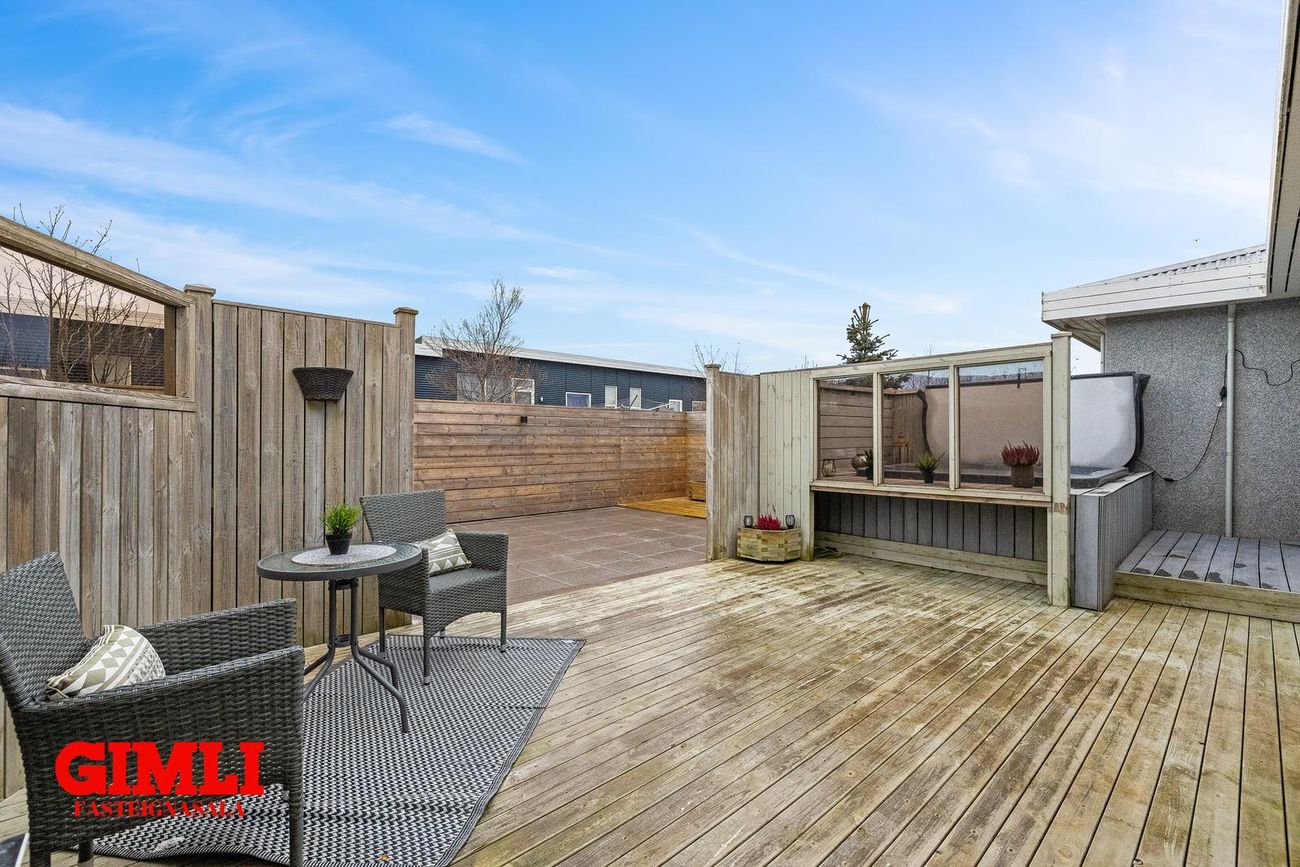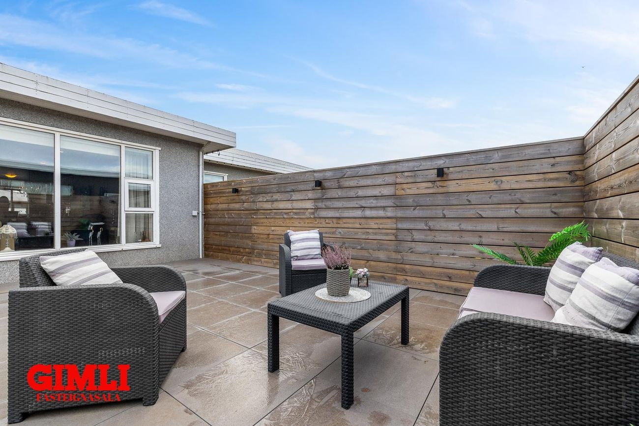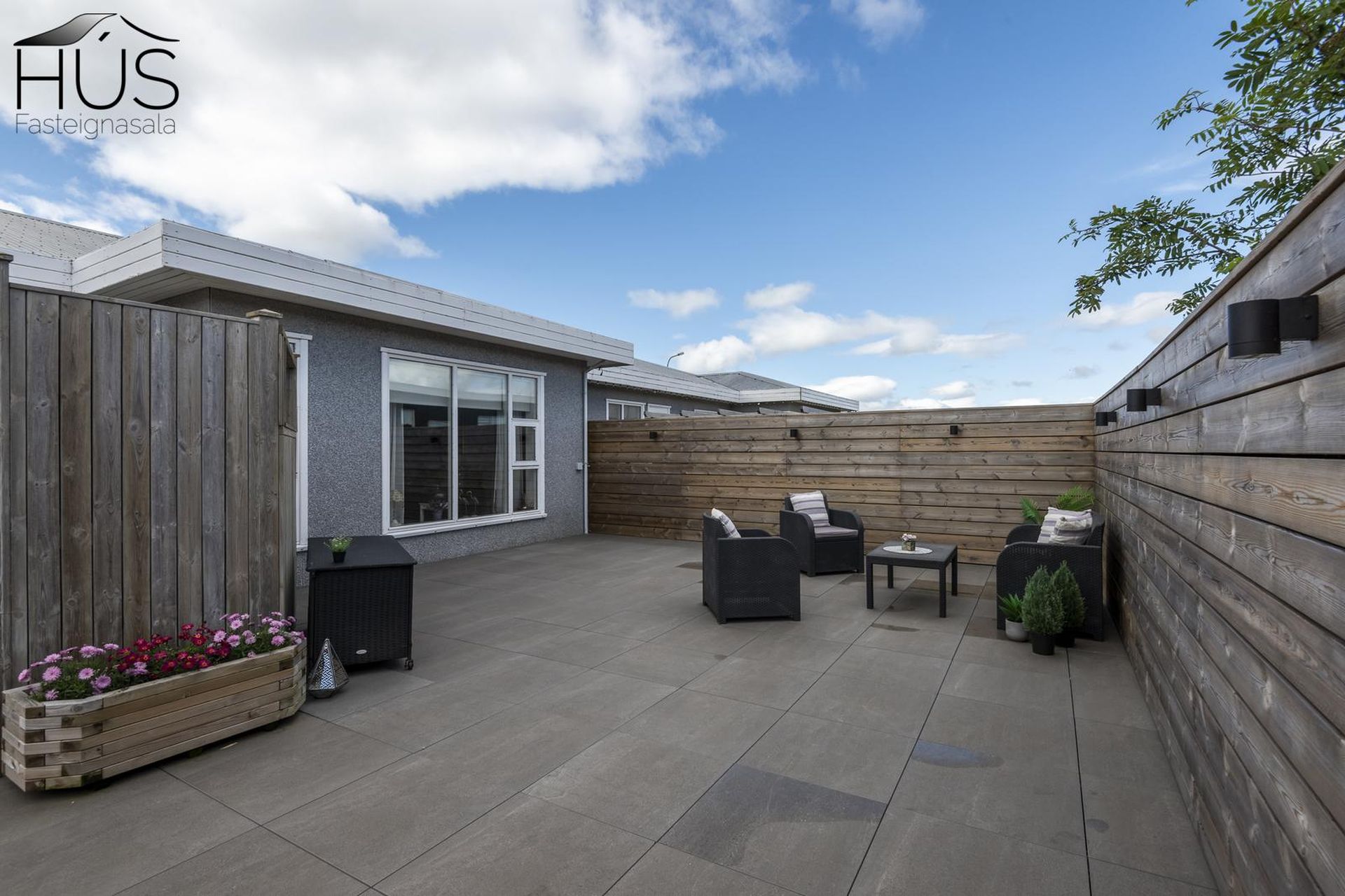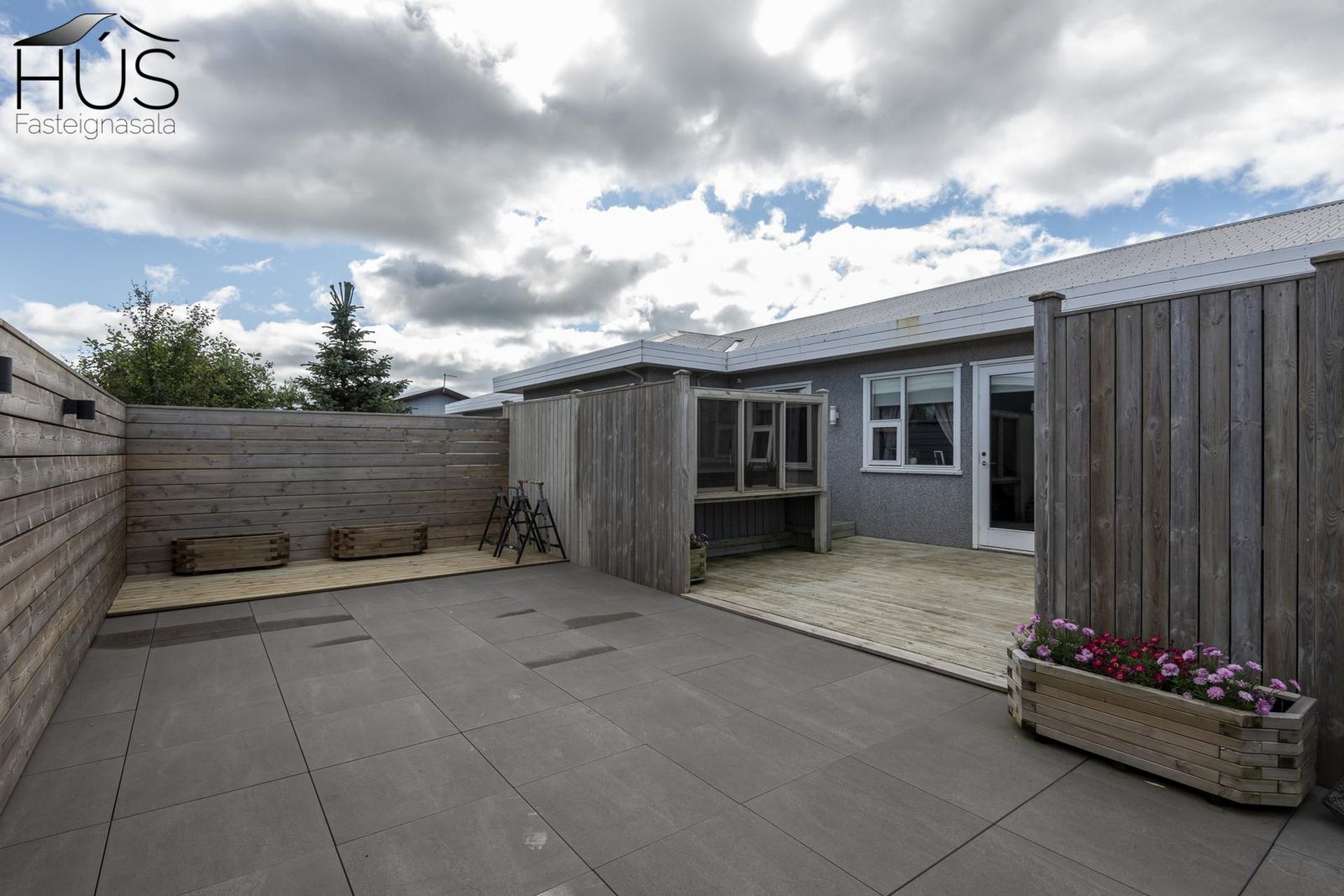 Stórt afgirt útisvæði (100fm) með útiflísum, heitum potti og innbyggðri lýsingu. Steytt verönd framan við hús með skjólveggjum.