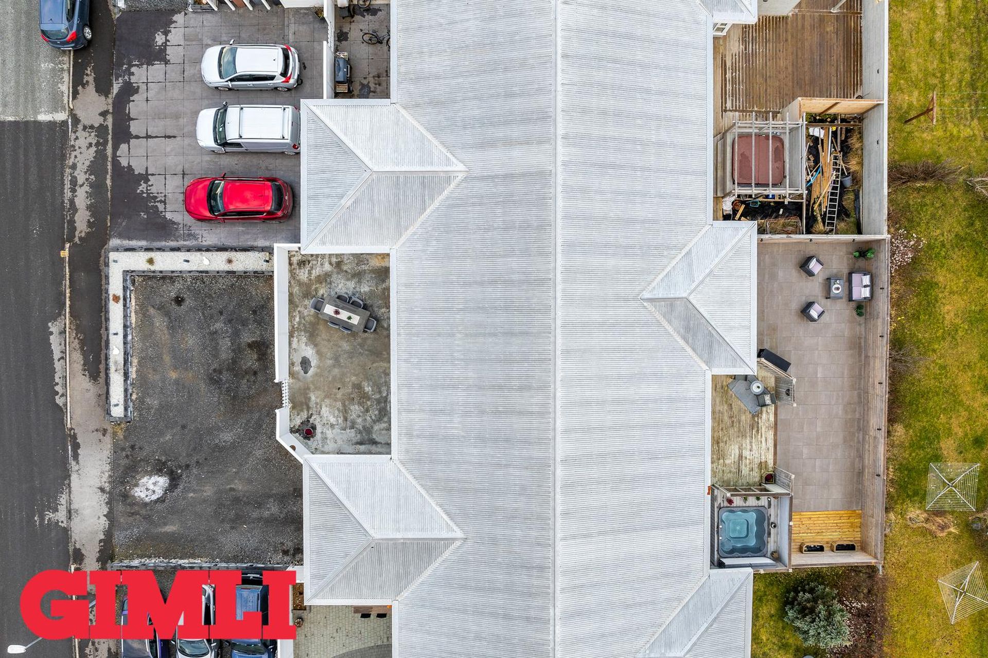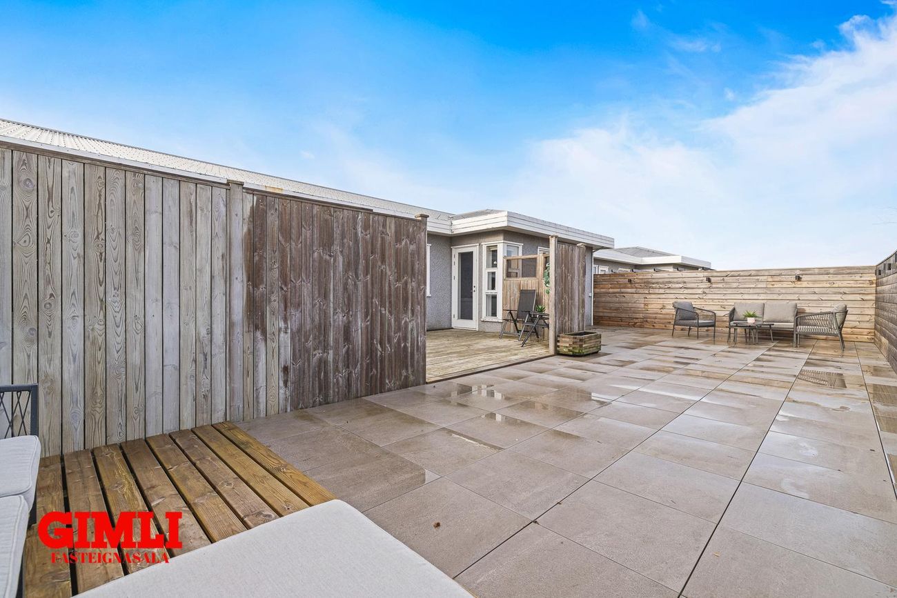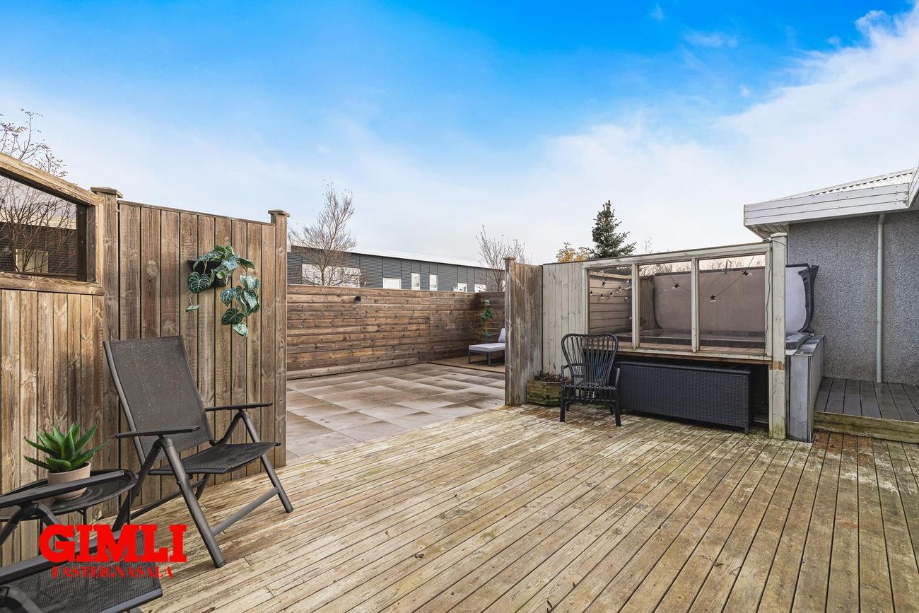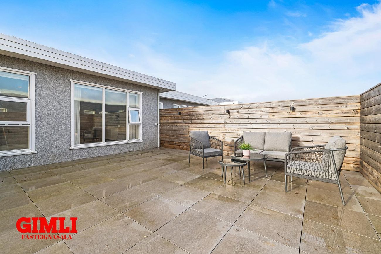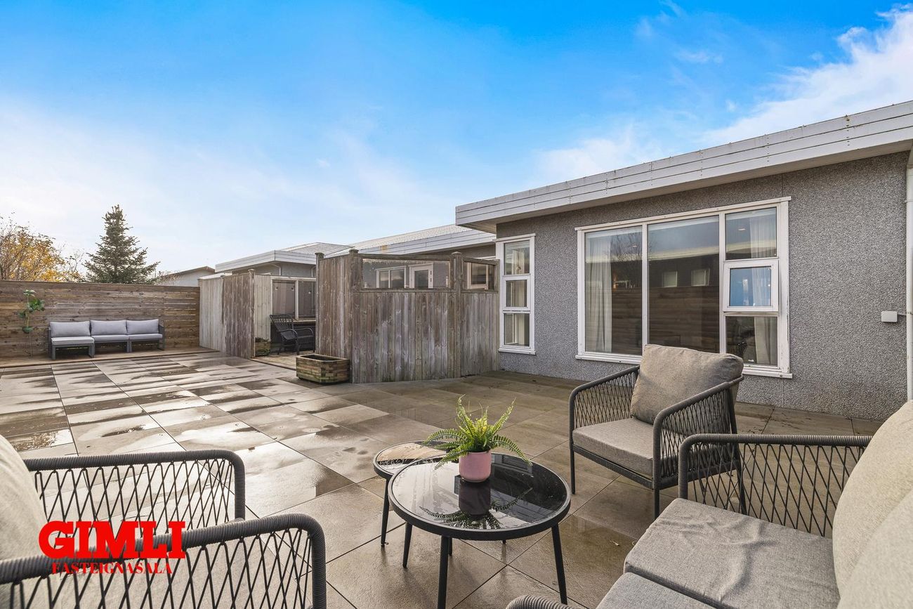 Stórt afgirt útisvæði (100fm) með útiflísum, heitum potti og innbyggðri lýsingu. Steytt verönd framan við hús með skjólveggjum.