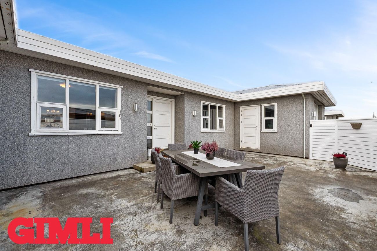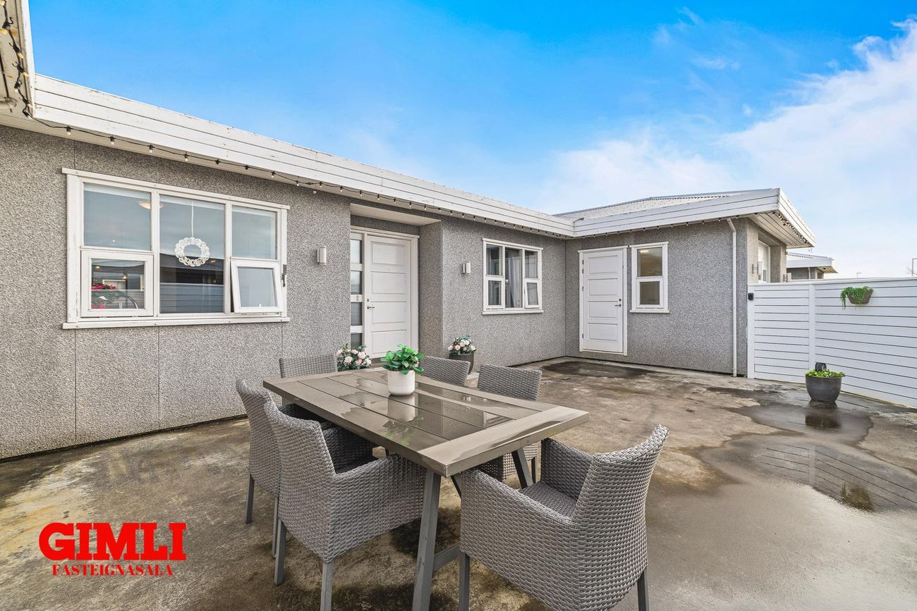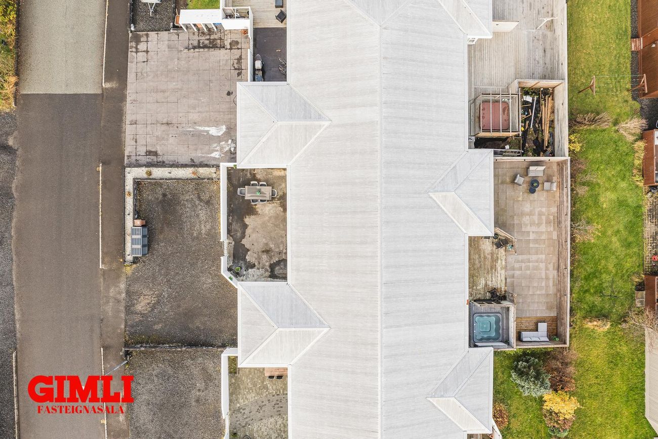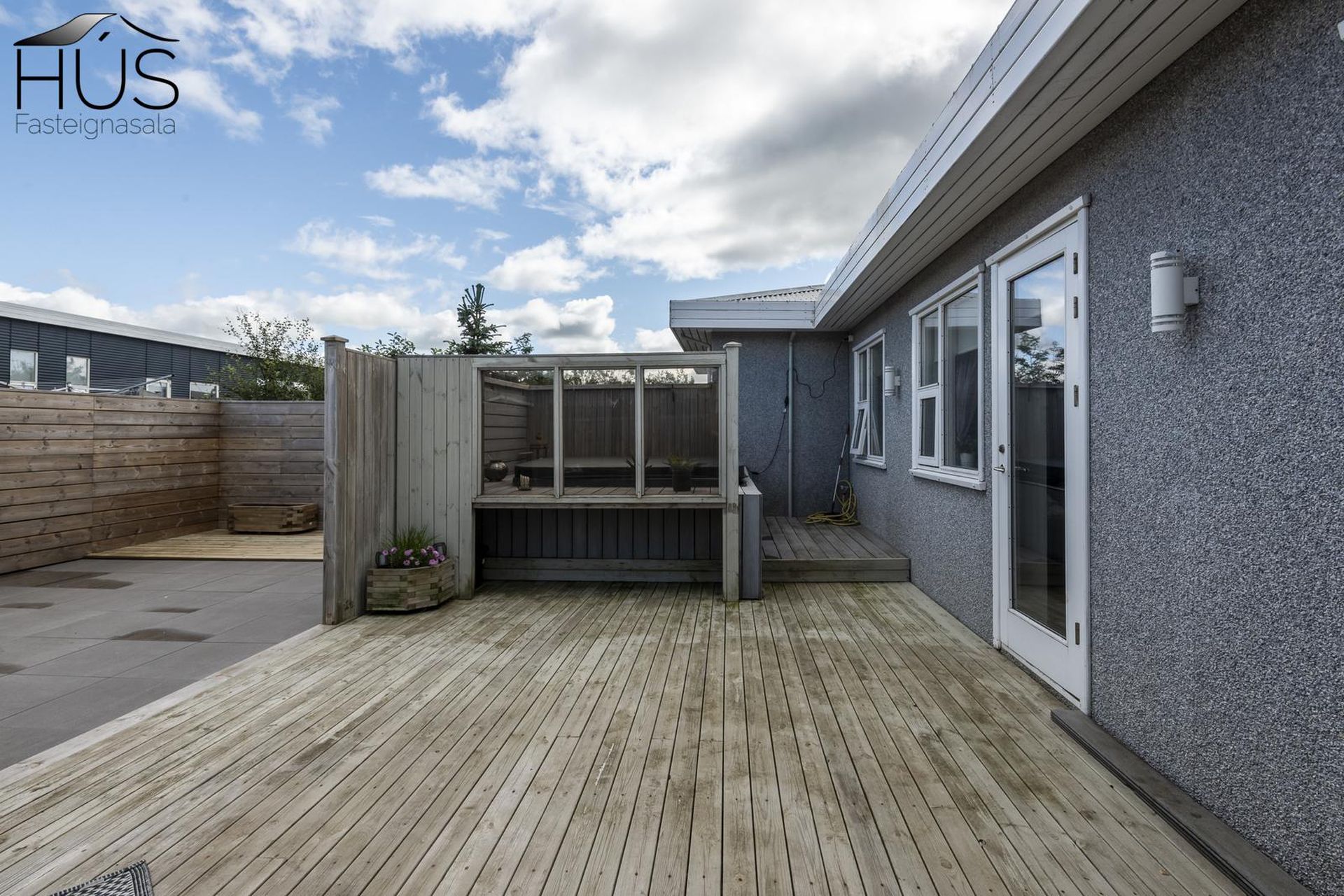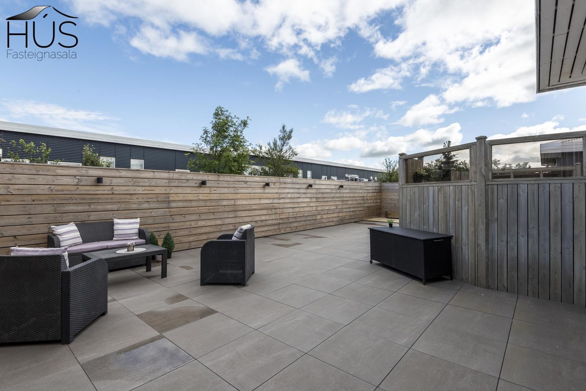 Stórt afgirt útisvæði (100fm) með útiflísum, heitum potti og innbyggðri lýsingu. Steytt verönd framan við hús með skjólveggjum.