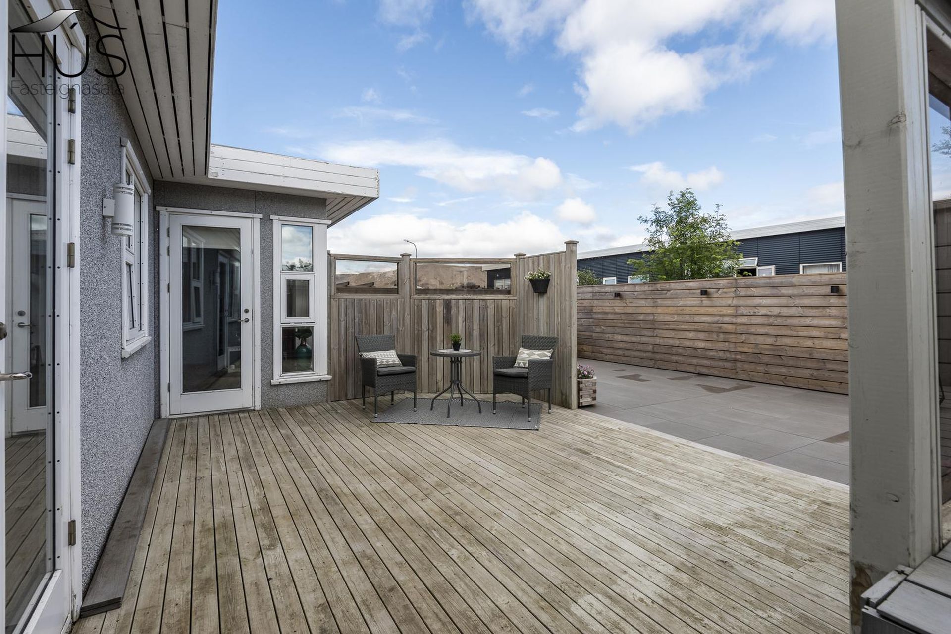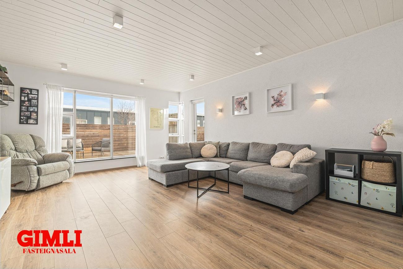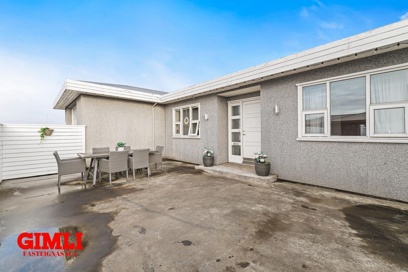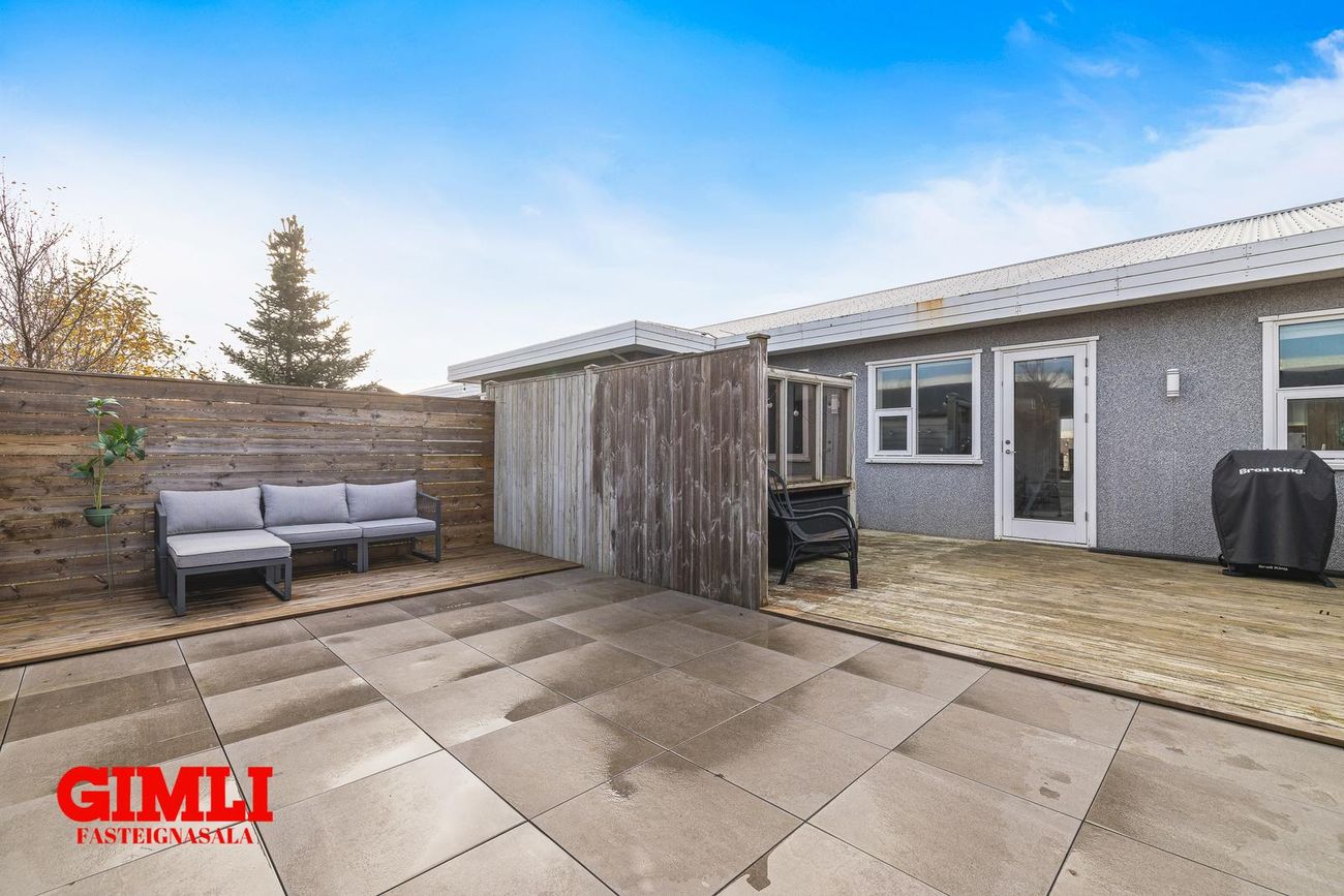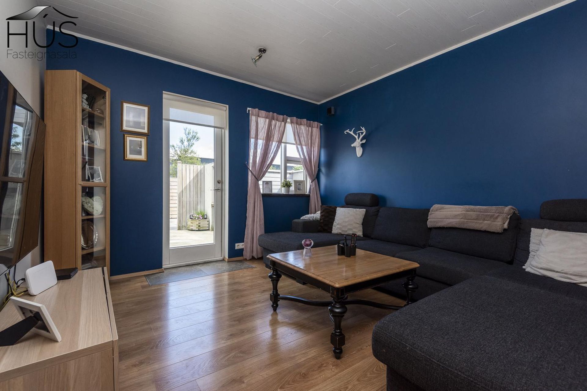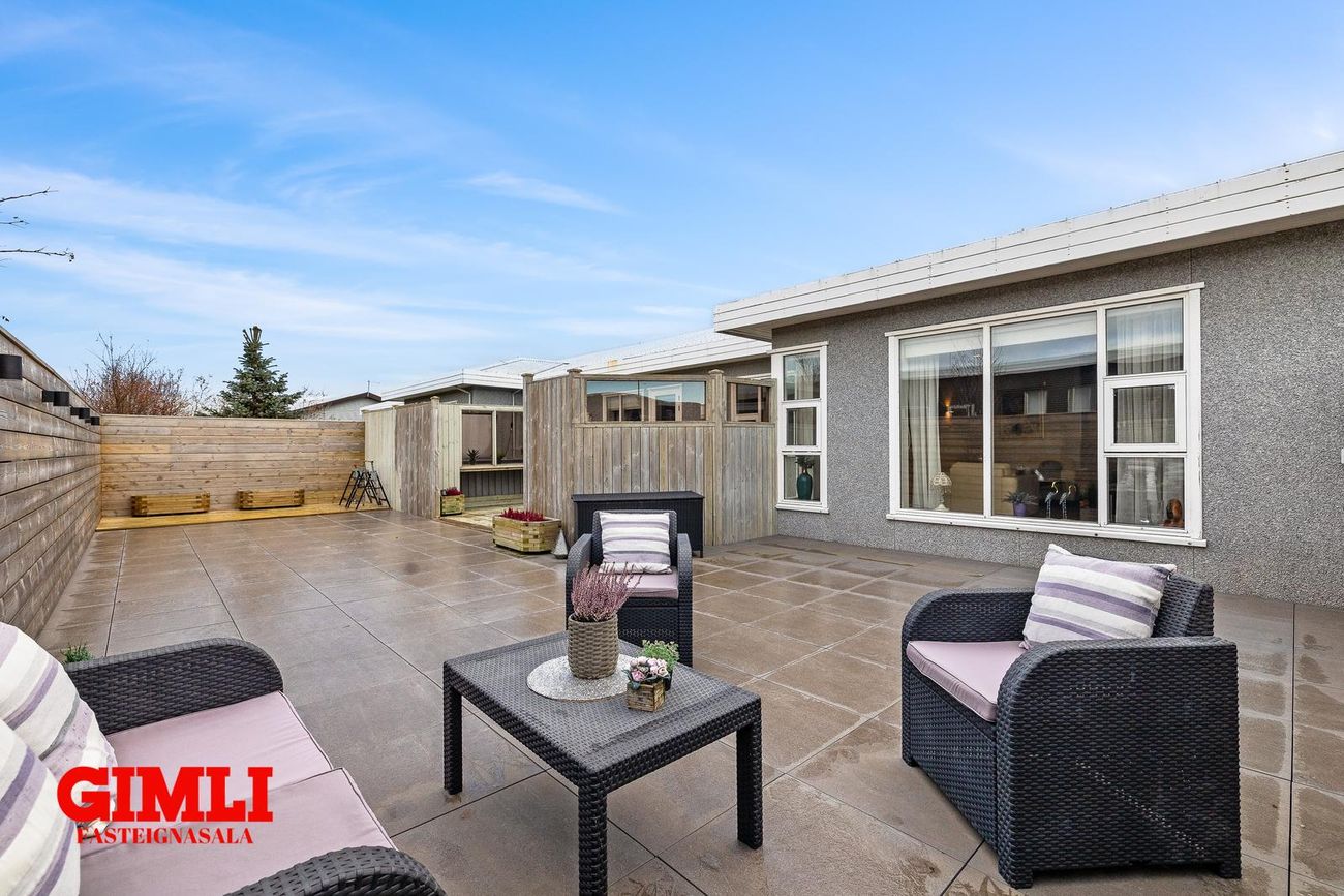 Stórt afgirt útisvæði (100fm) með útiflísum, heitum potti og innbyggðri lýsingu. Steytt verönd framan við hús með skjólveggjum.