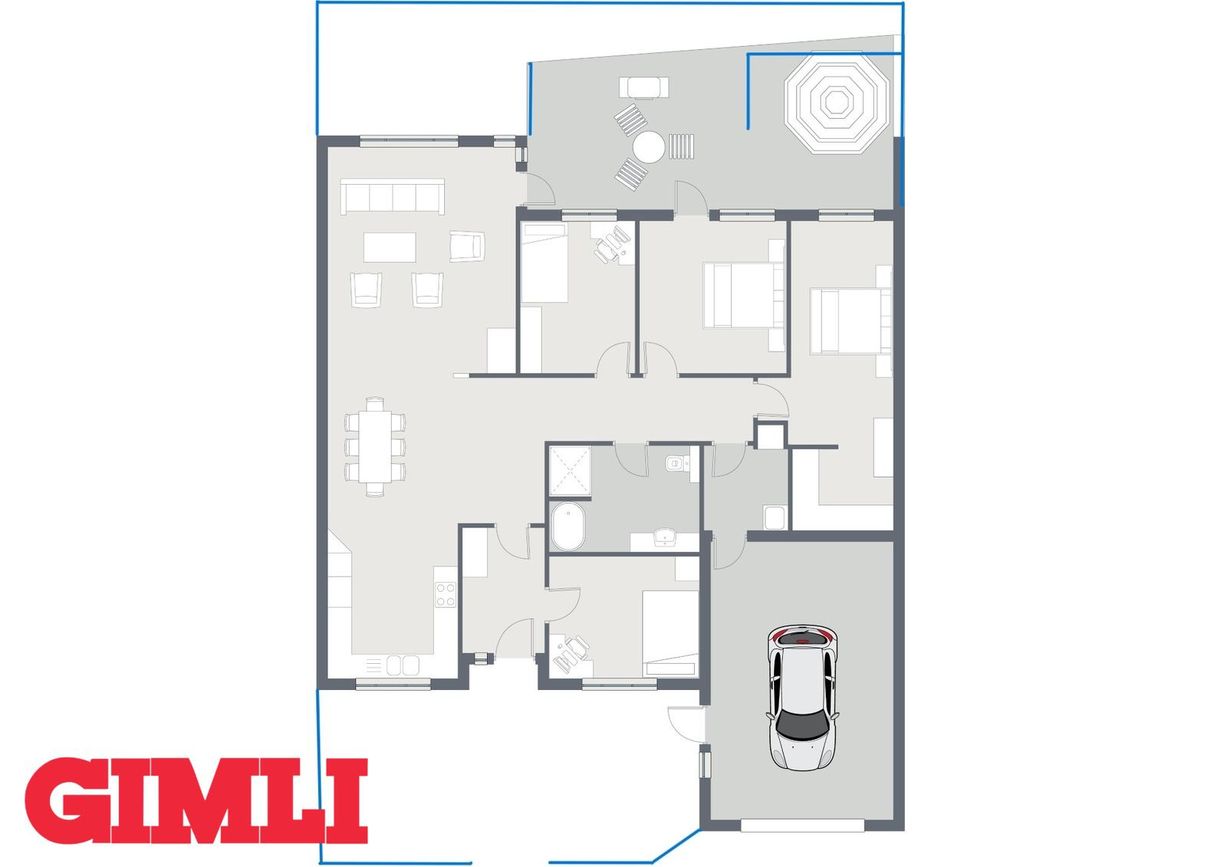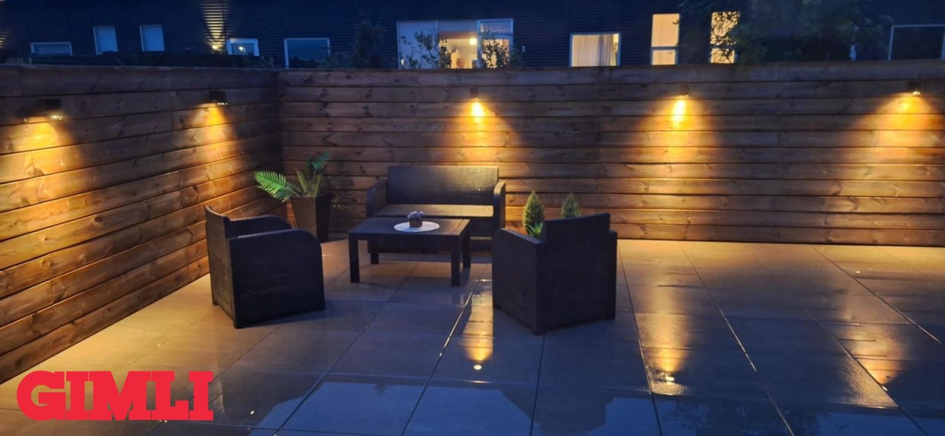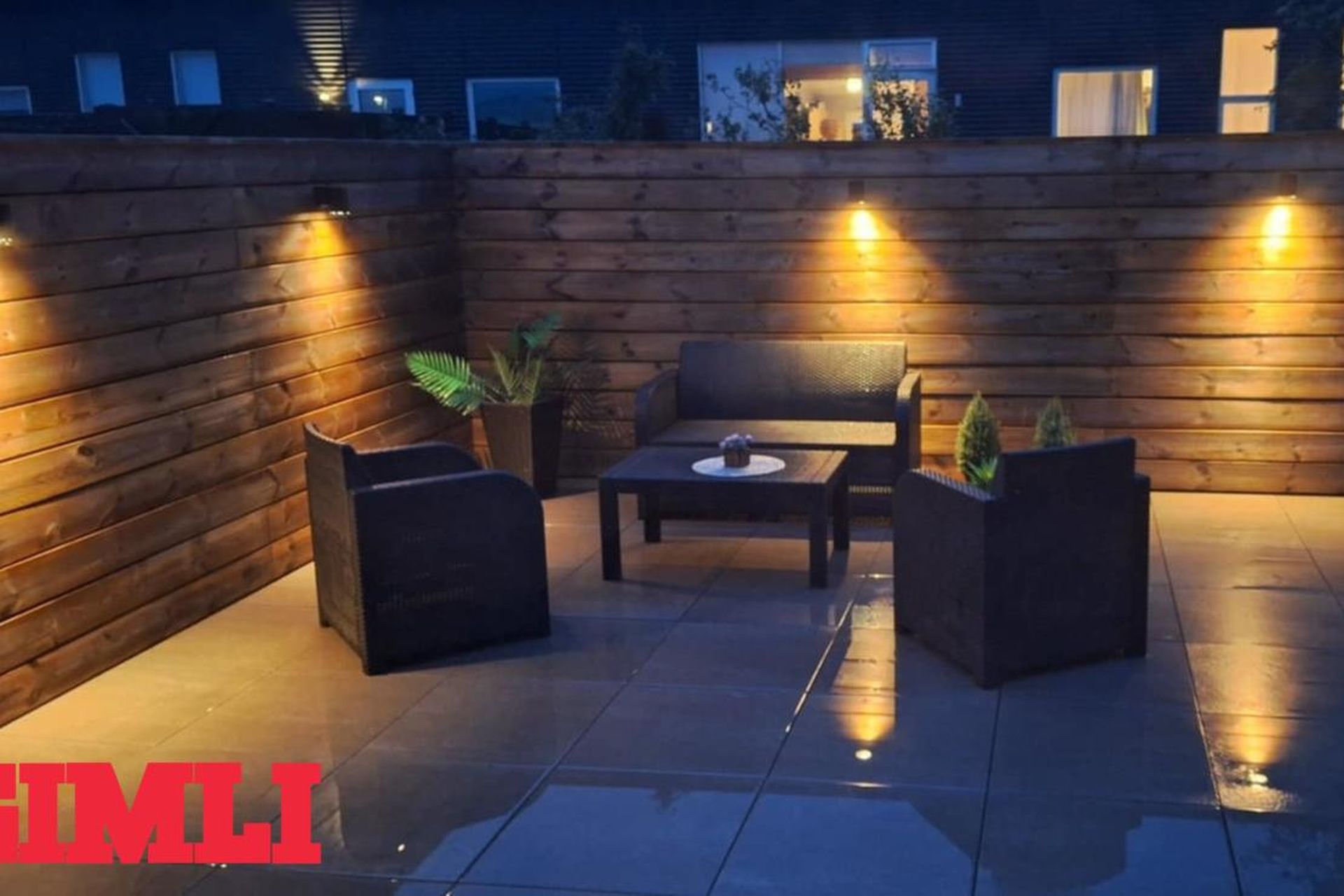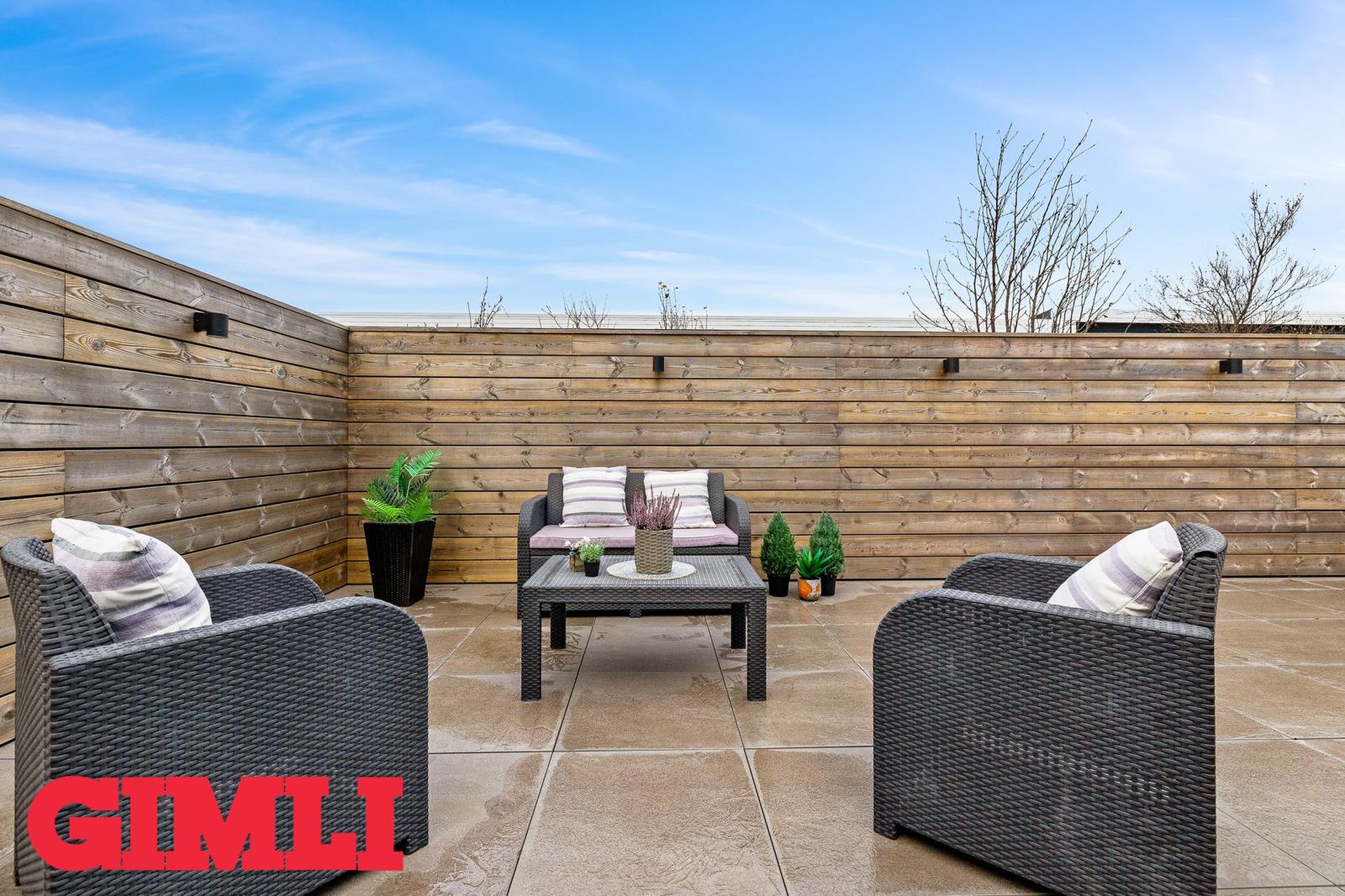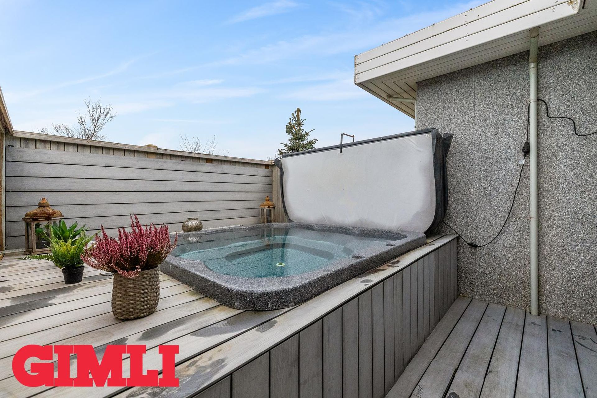 Stórt afgirt útisvæði (100fm) með útiflísum, heitum potti og innbyggðri lýsingu. Steytt verönd framan við hús með skjólveggjum.