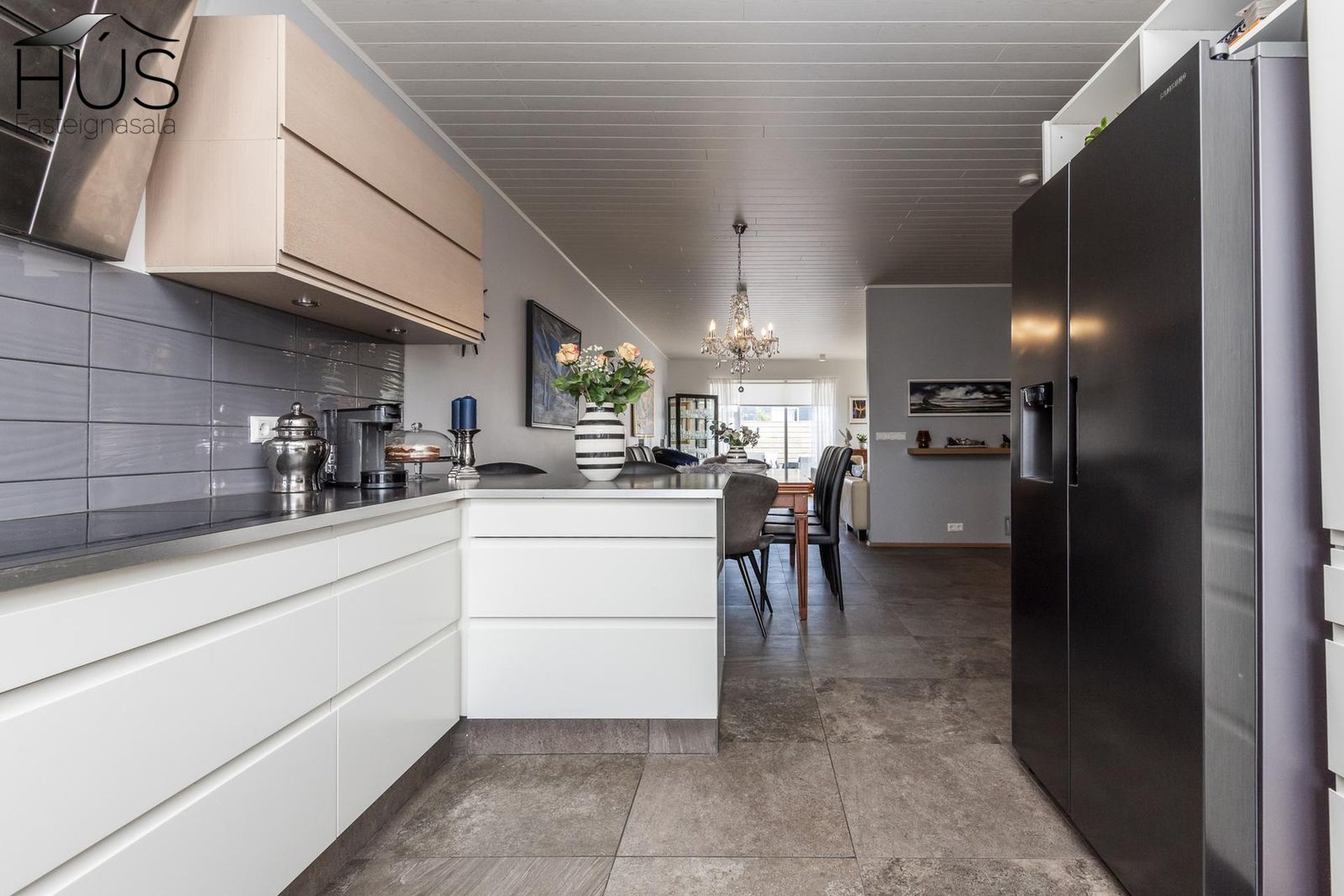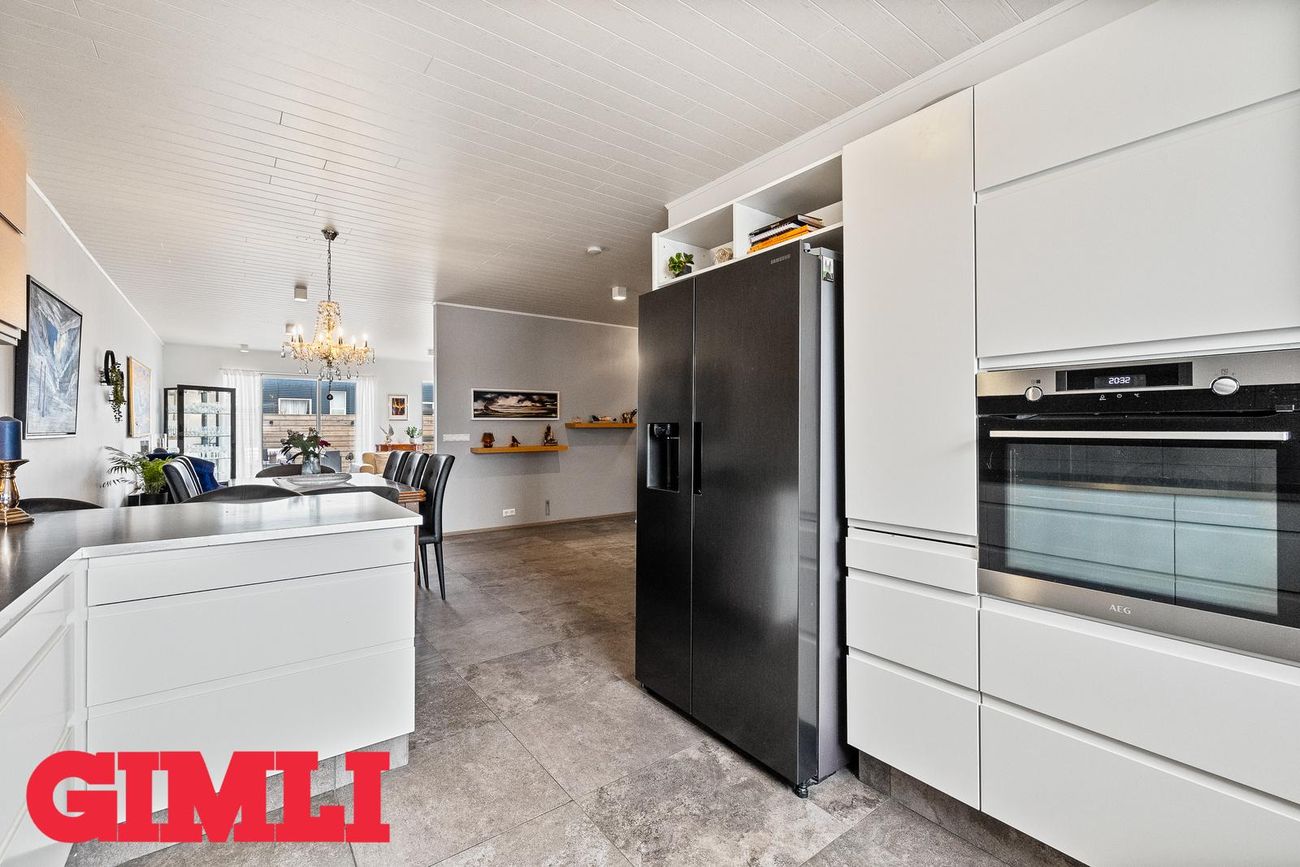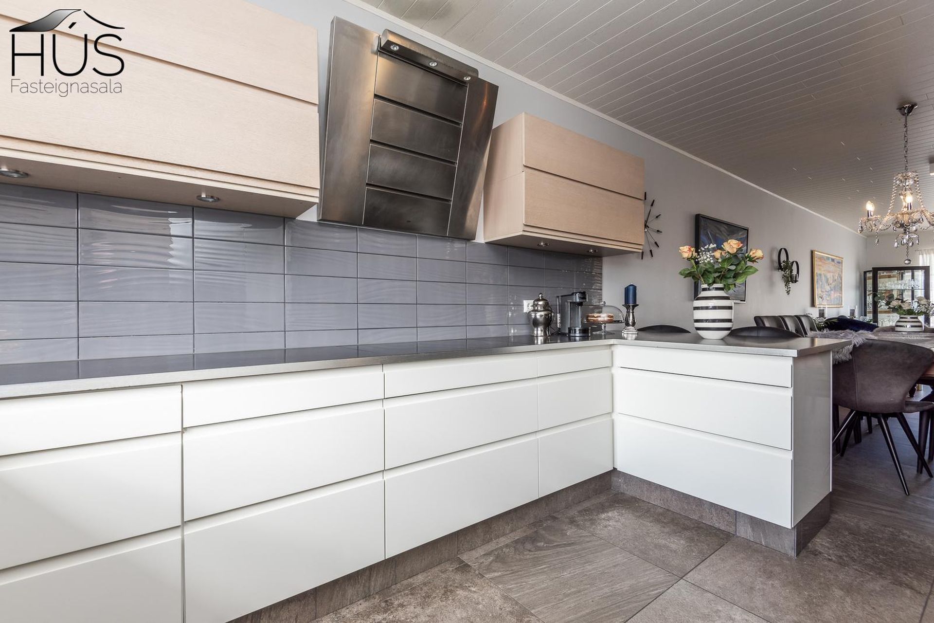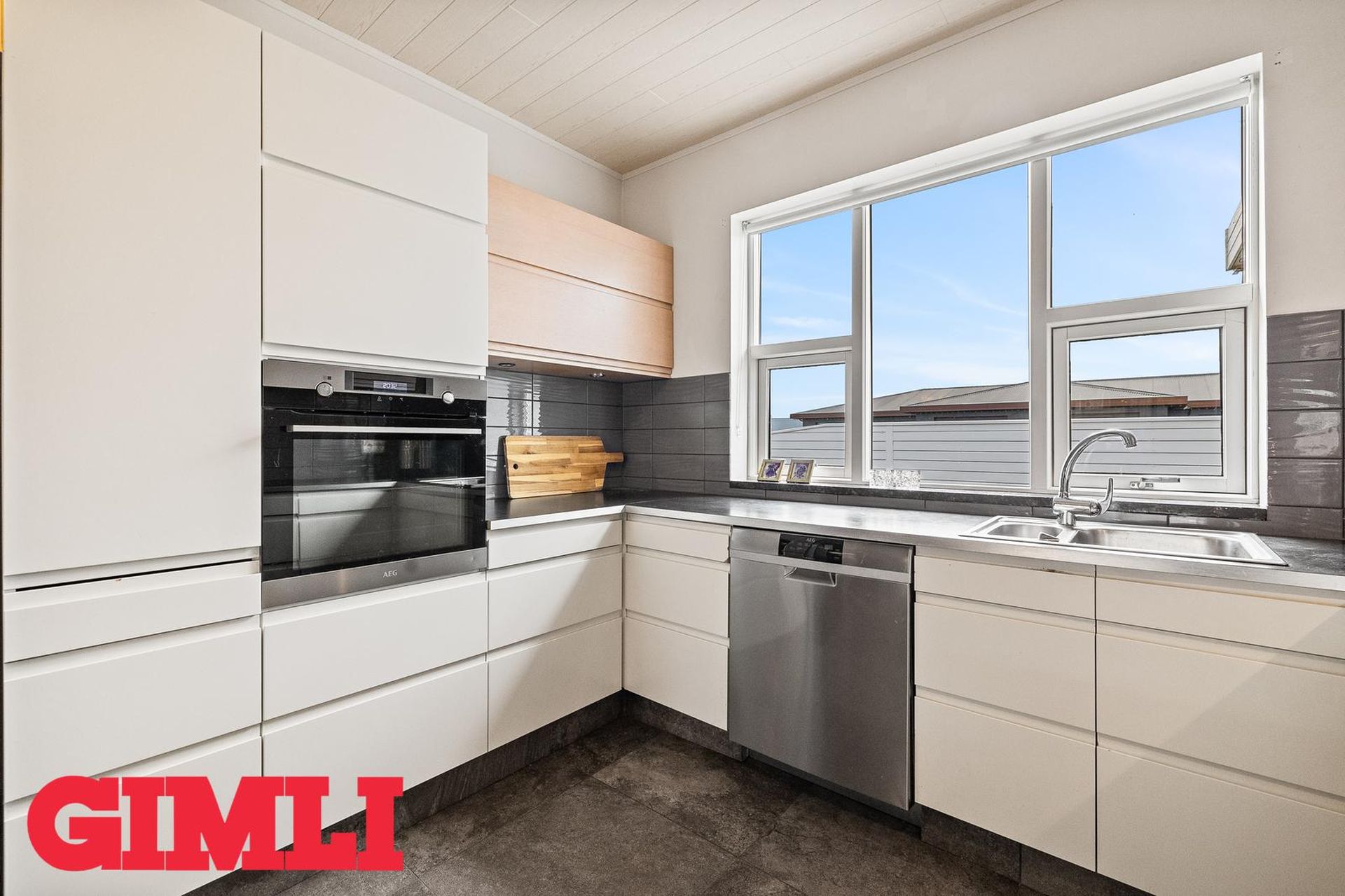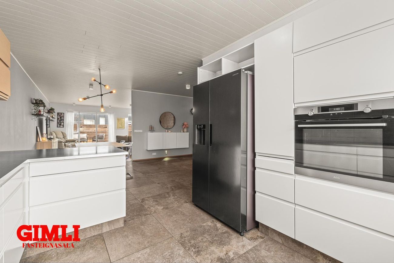 12fm opið eldhús með hvítum innréttingum frá HTH, flísalögðum gólfum, innbyggðum ofni og háfur frá AEG. Helluborð og flísalögð yfirborð milli borðplötu og skápa.