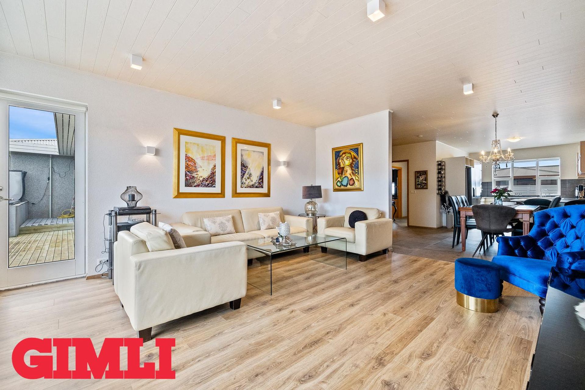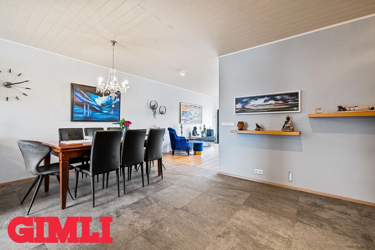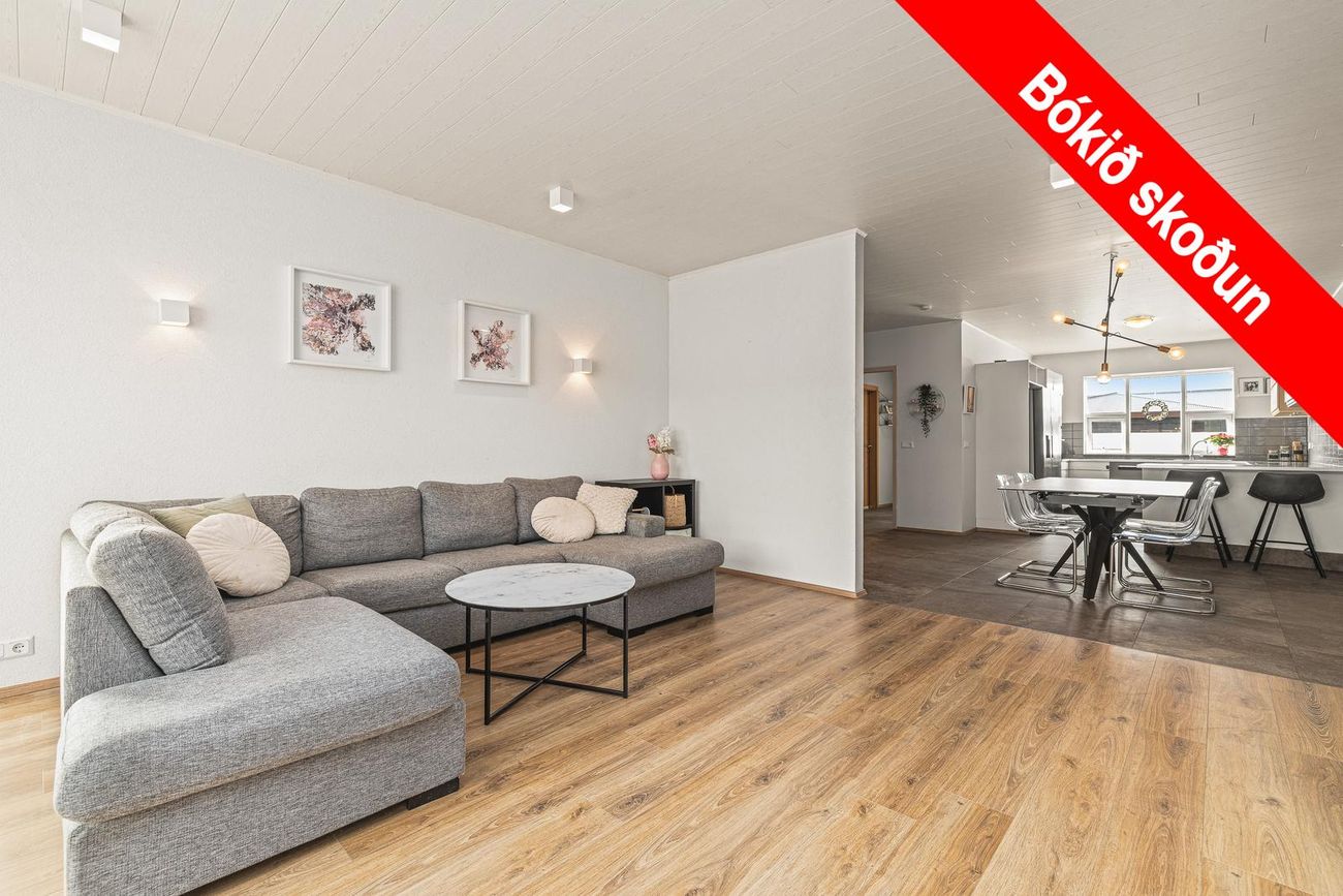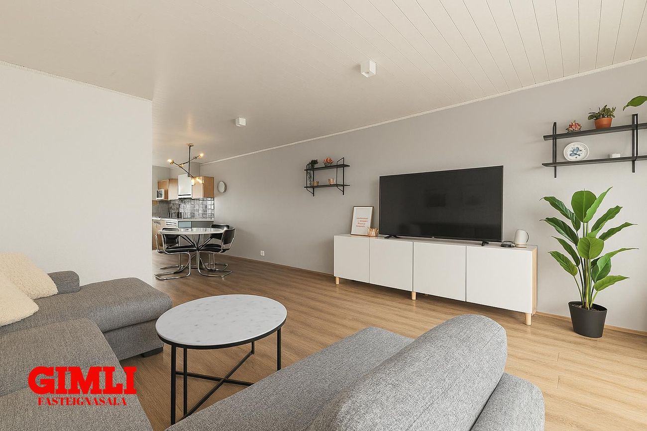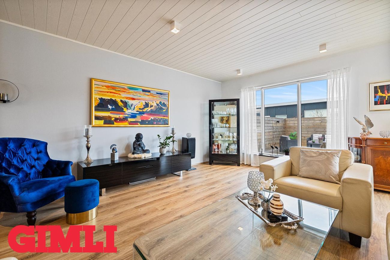 38fm stofa og borðstofa í opnu alrými með útgöngu í verönd. Björt rými með beinum tengingu við eldhús.