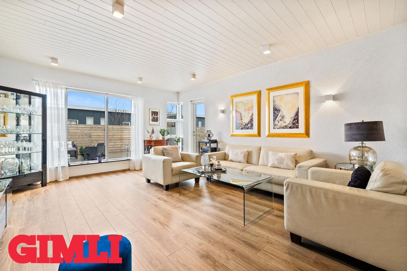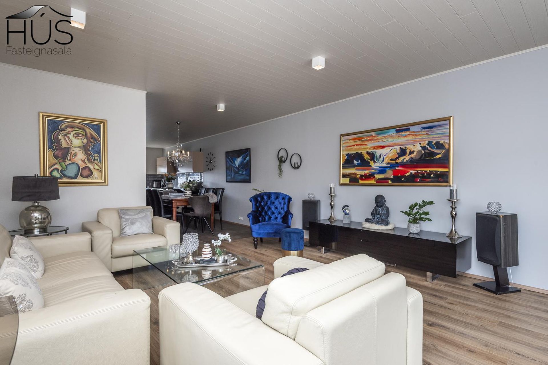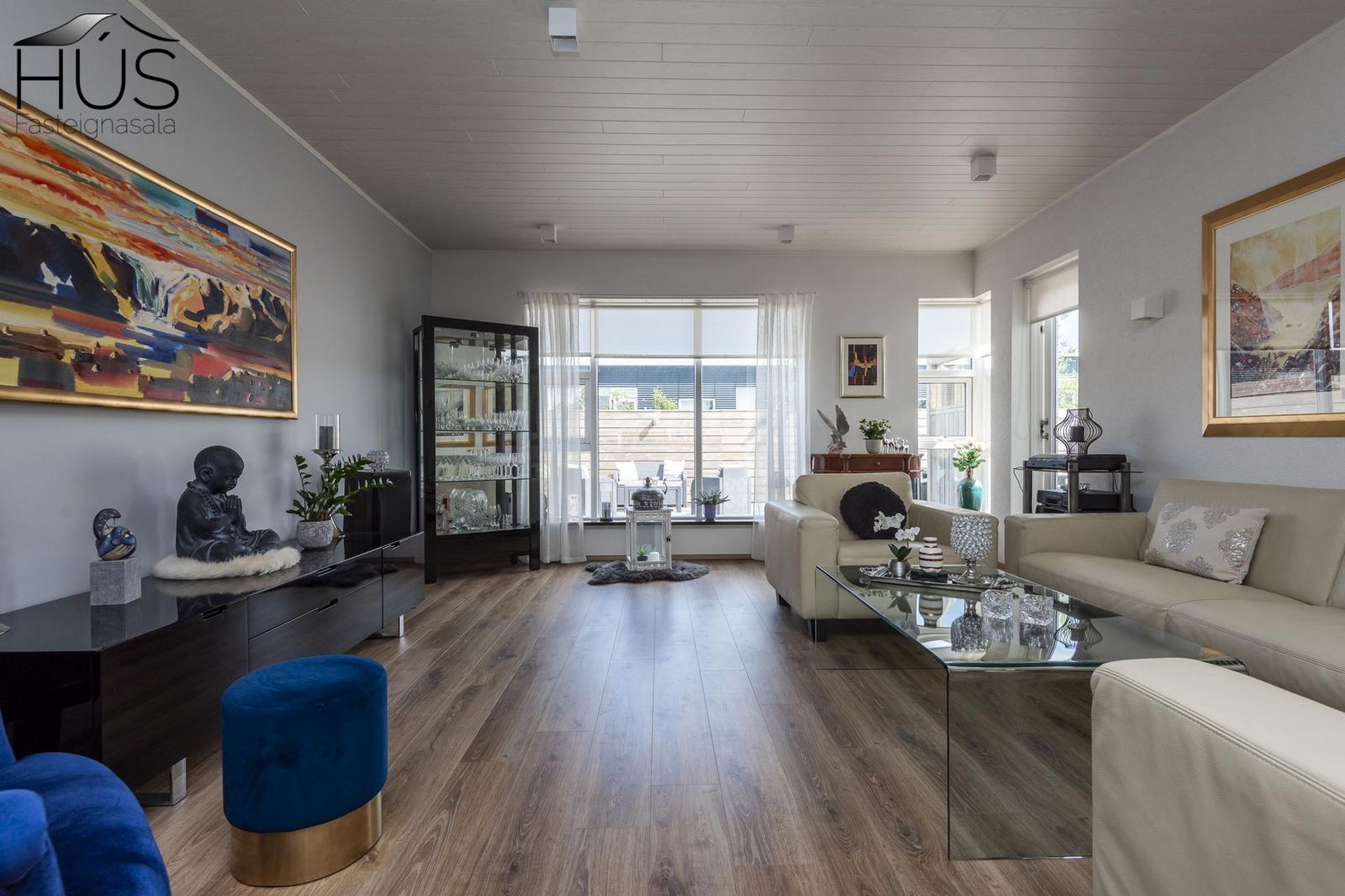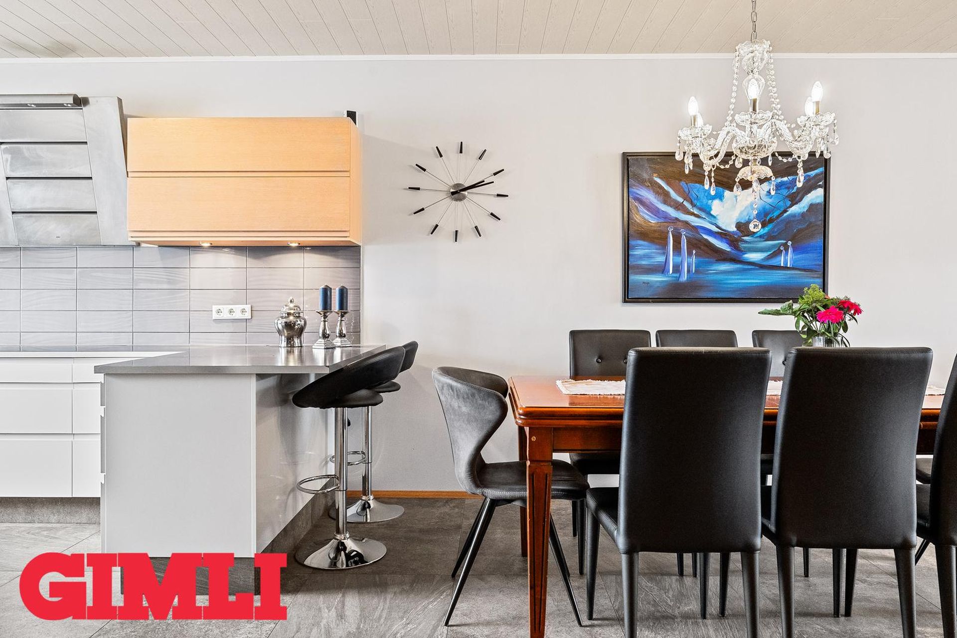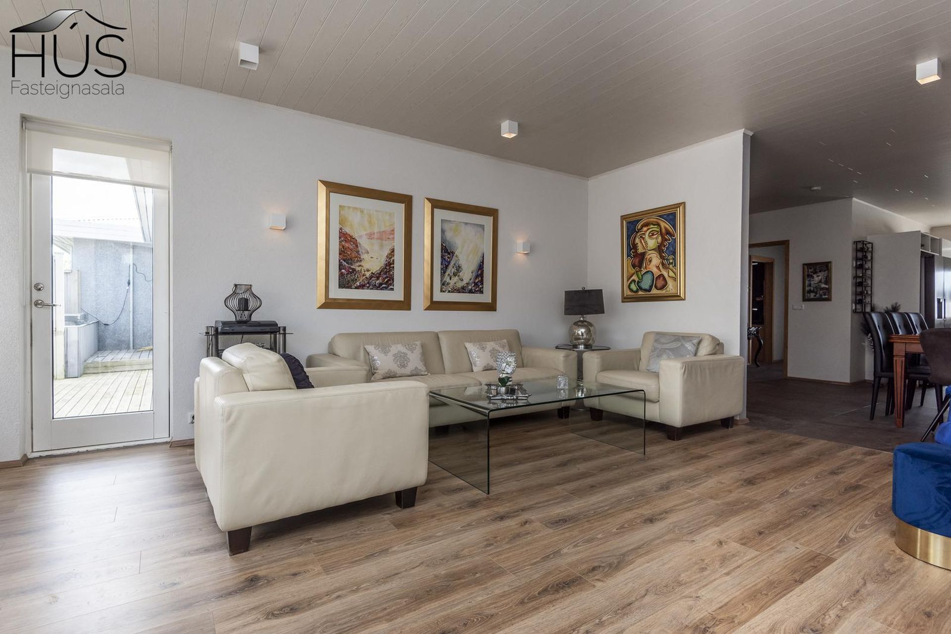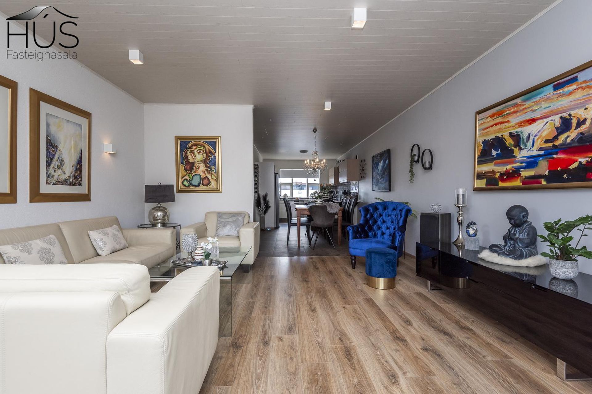 38fm stofa og borðstofa í opnu alrými með útgöngu í verönd. Björt rými með beinum tengingu við eldhús.