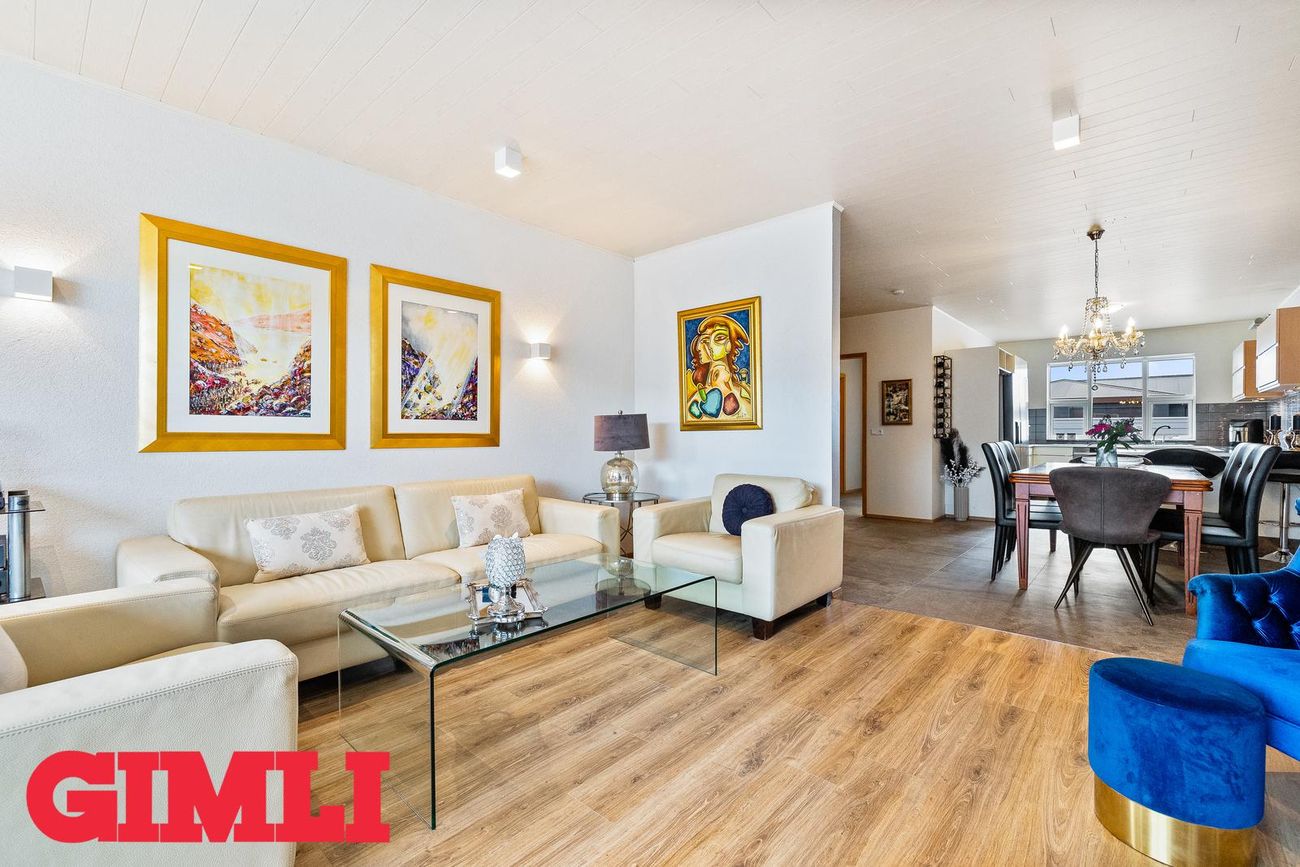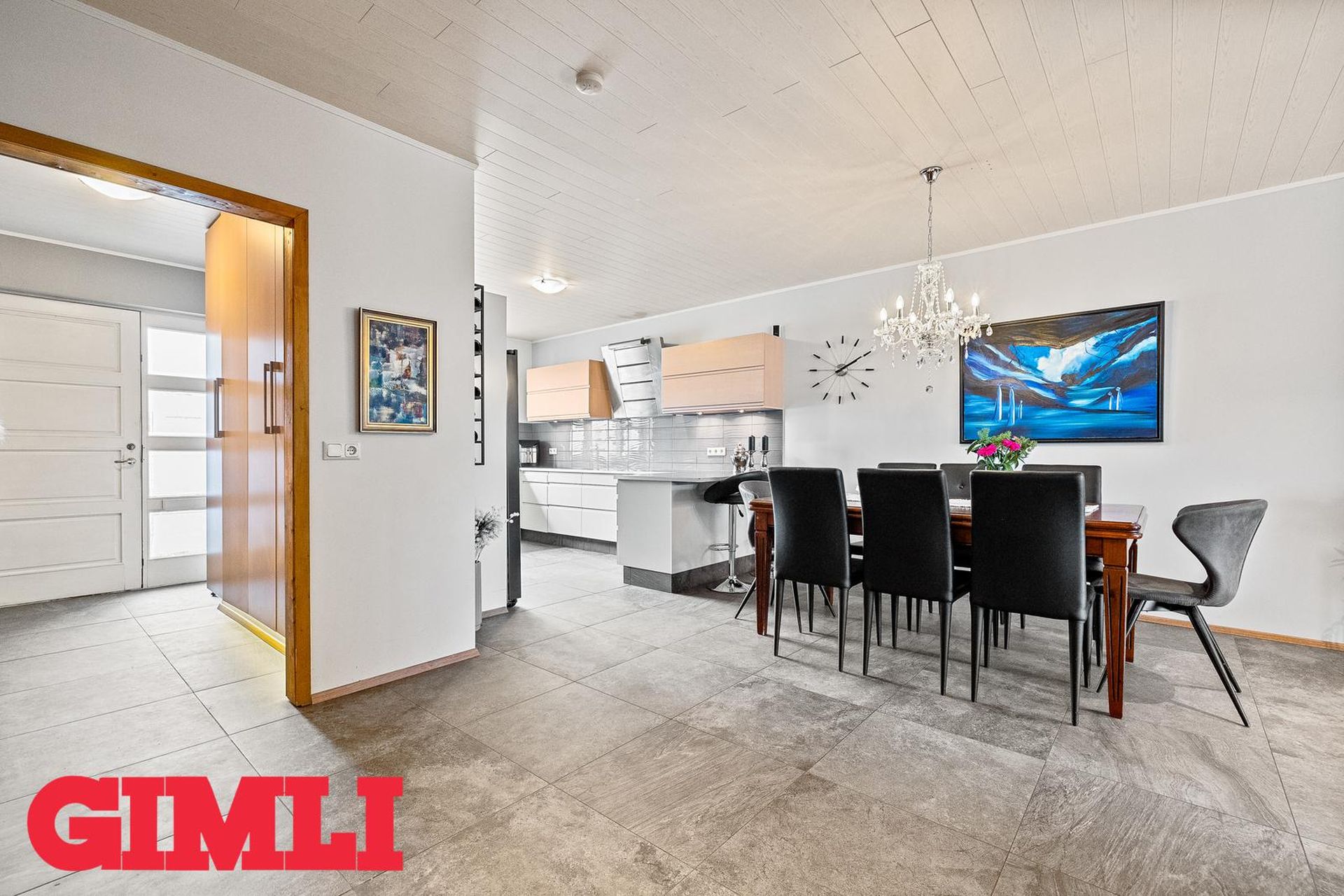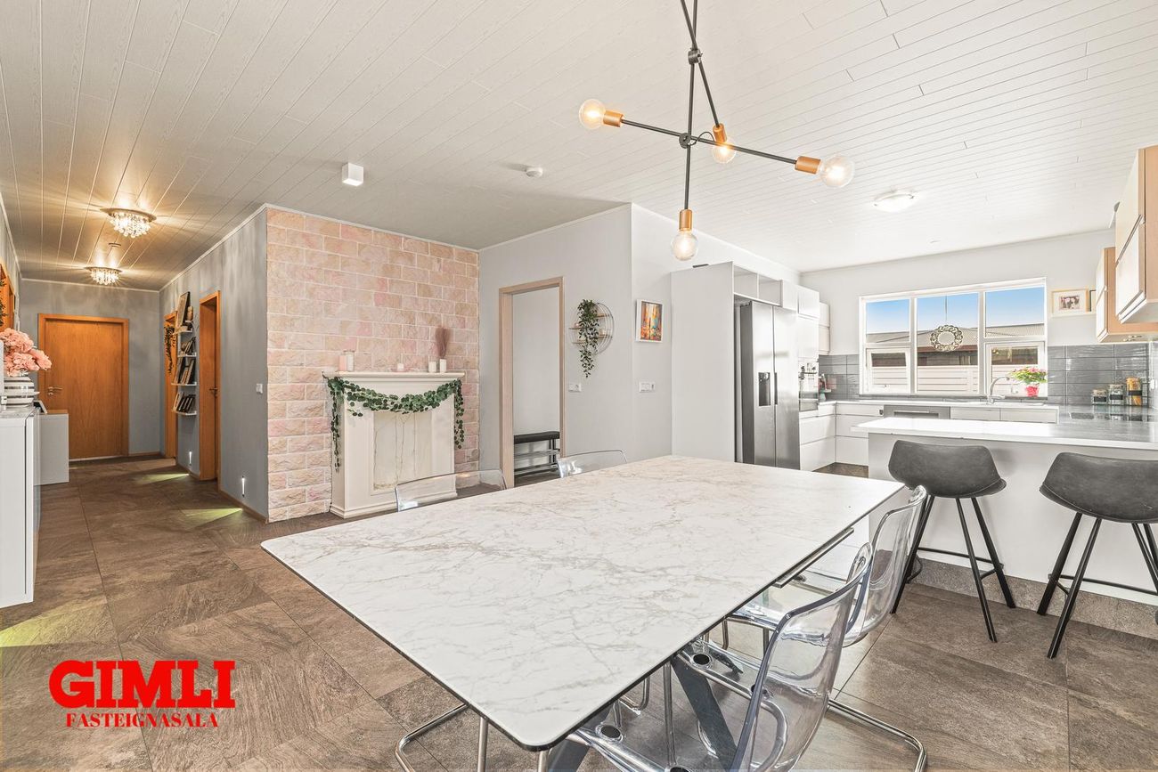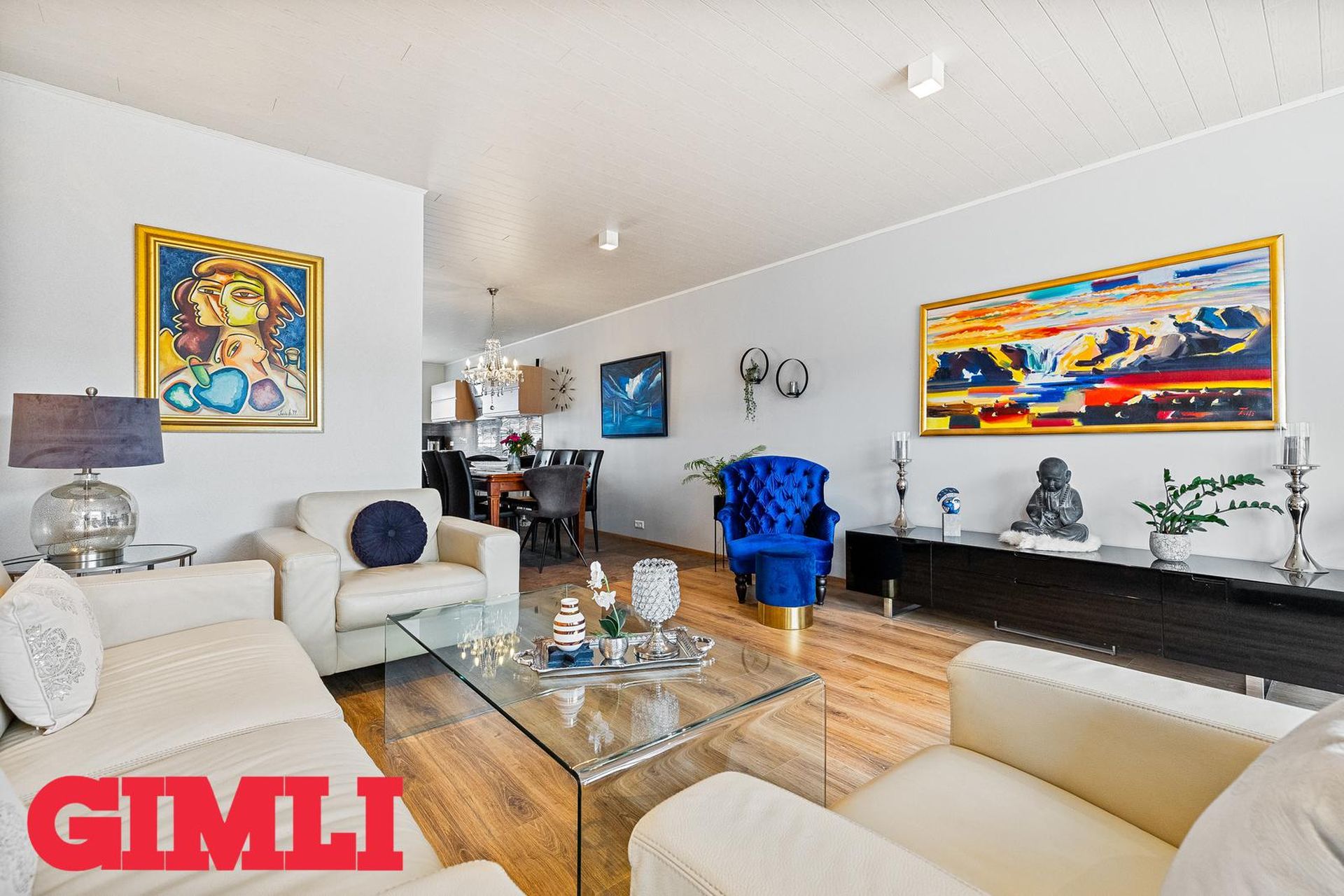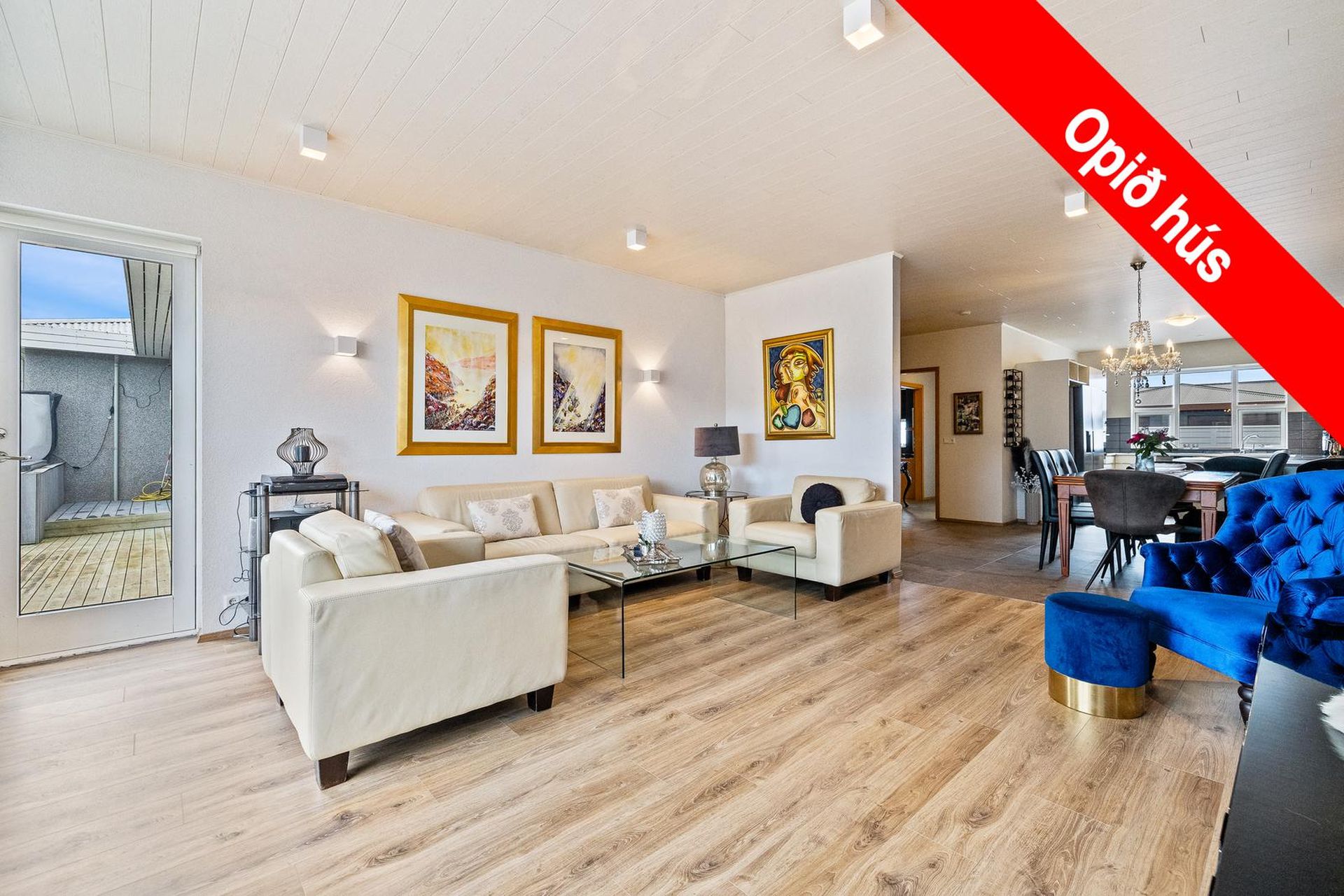 38fm stofa og borðstofa í opnu alrými með útgöngu í verönd. Björt rými með beinum tengingu við eldhús.