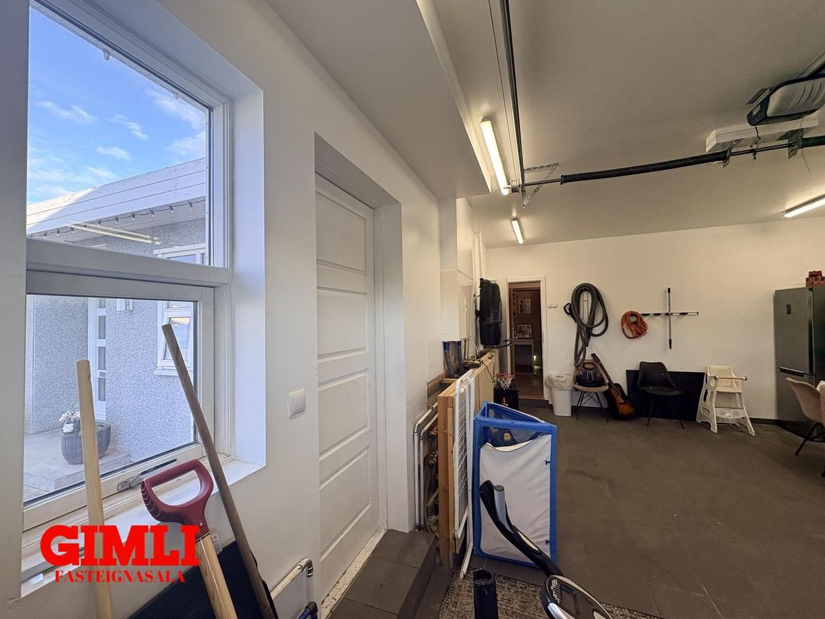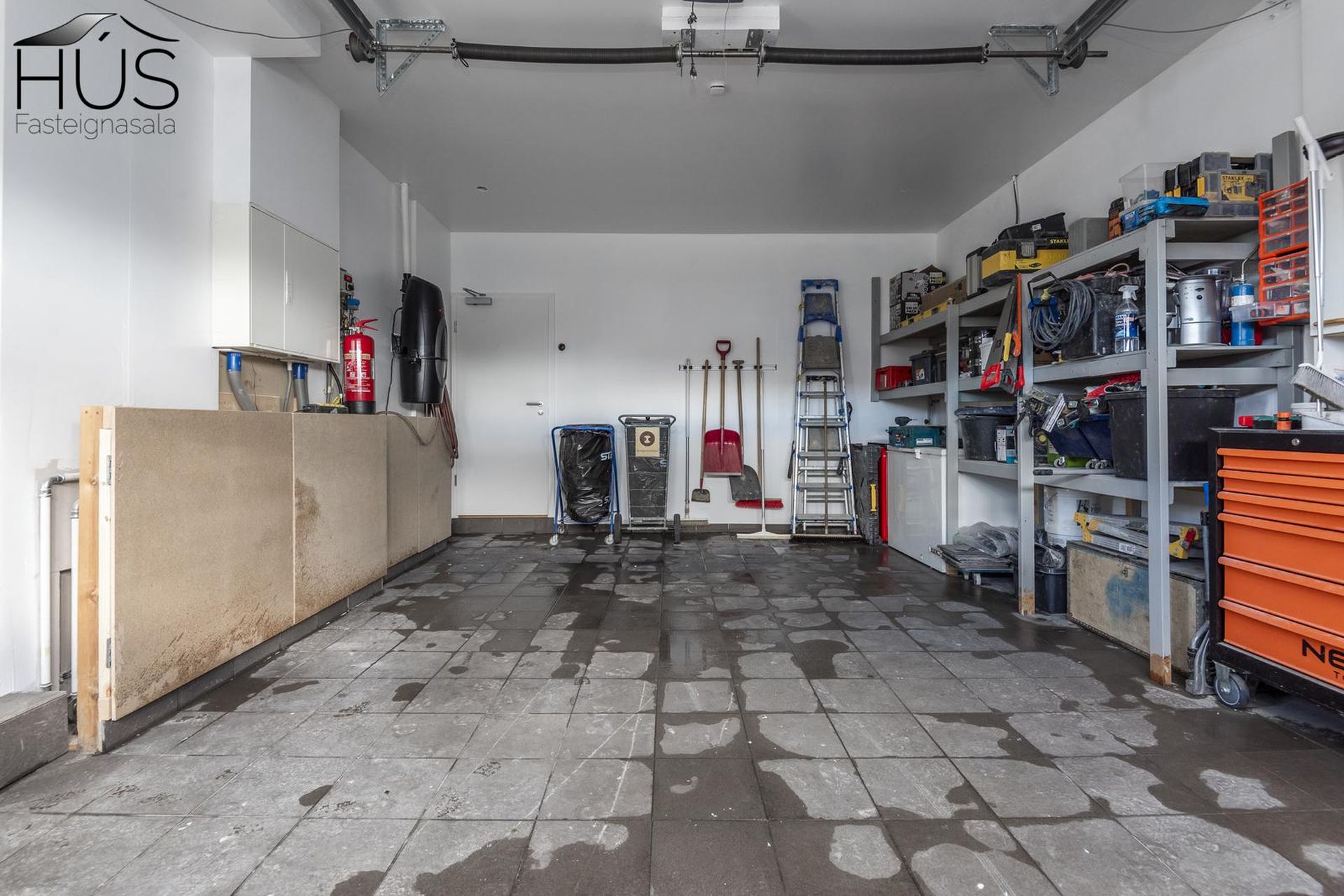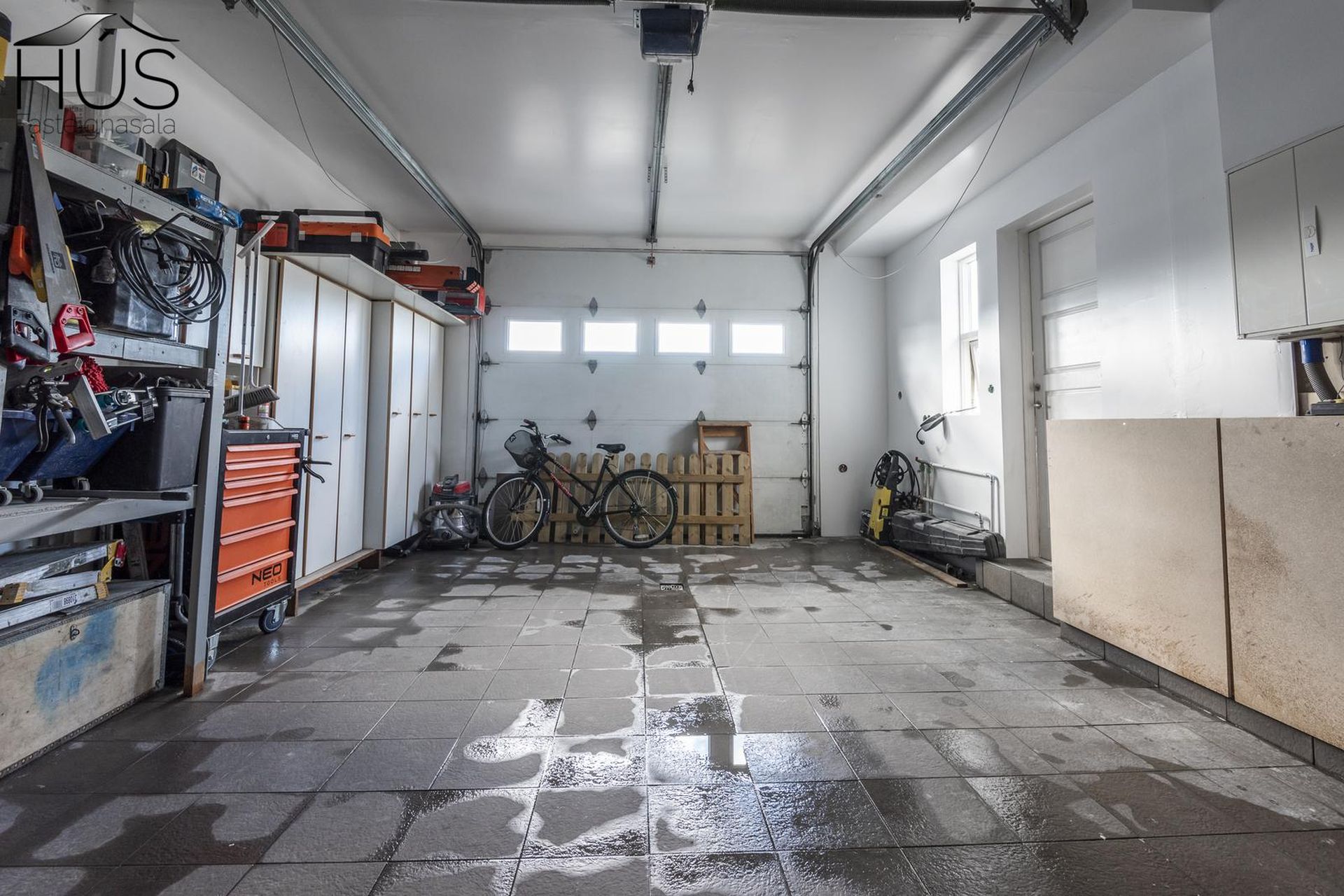 30,8fm bílskúr með sjálfvirkri hurð, þriggja fasa rafmagni og flísalögðu gólfi með gólfhita.