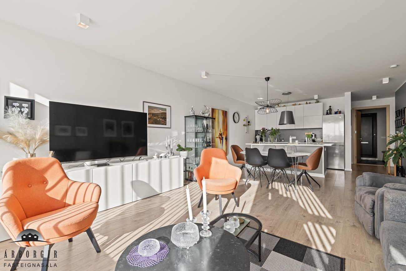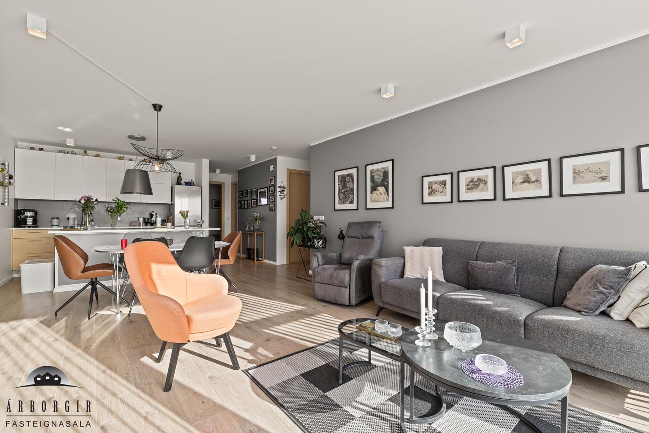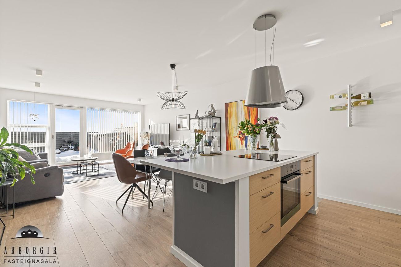 Stofa og eldhús eru í opnu rými, parket er á gólfi, snyrtileg innrétting er í eldhúsi og í stofu er útgengt á góðan sólpall.