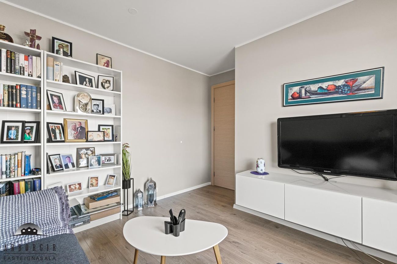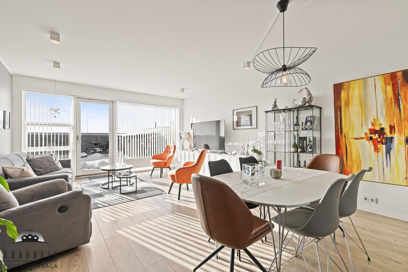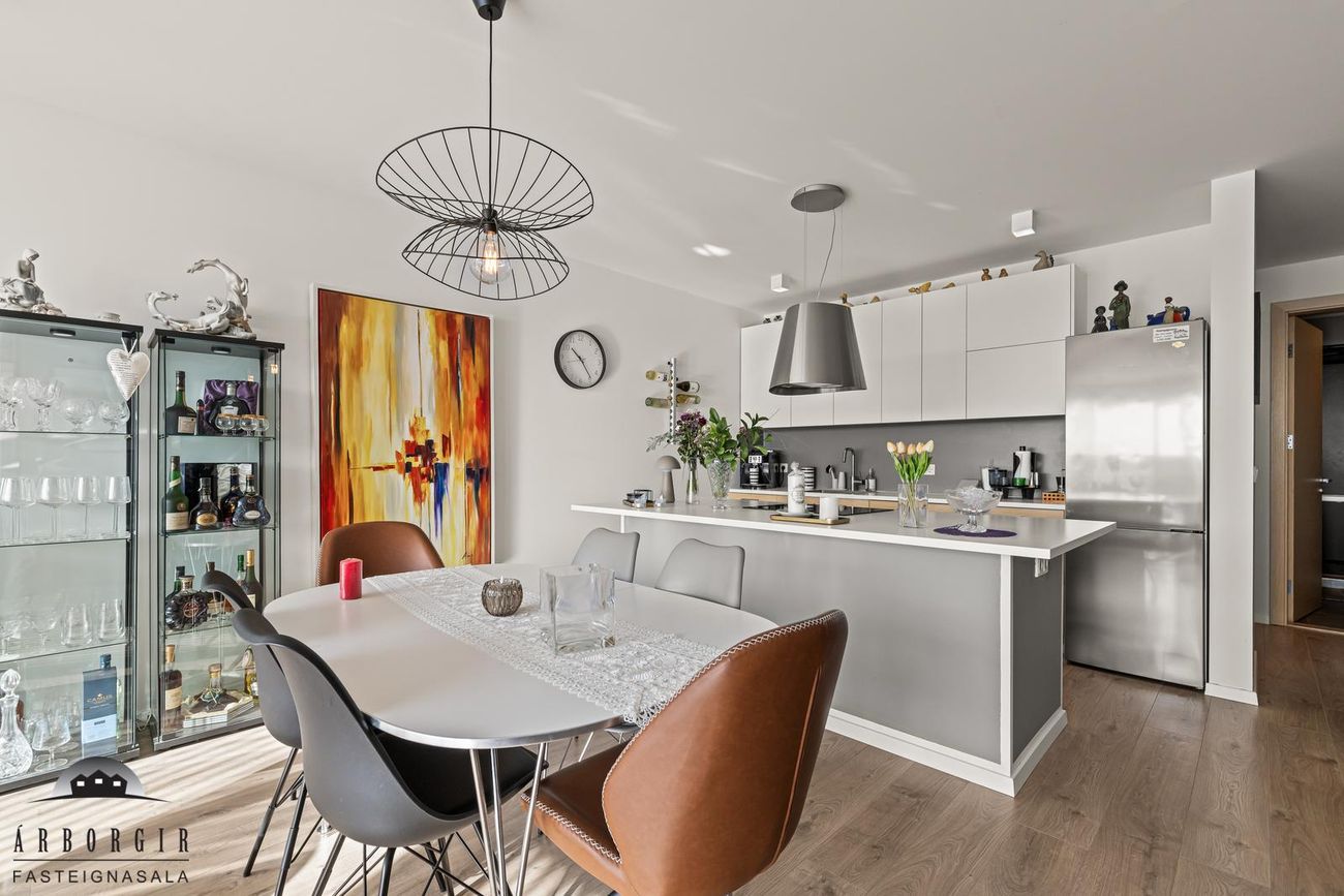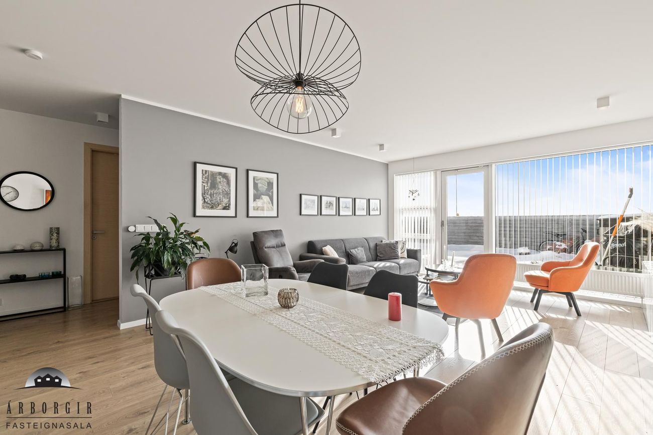 Stofa og eldhús eru í opnu rými, parket er á gólfi, snyrtileg innrétting er í eldhúsi og í stofu er útgengt á góðan sólpall.