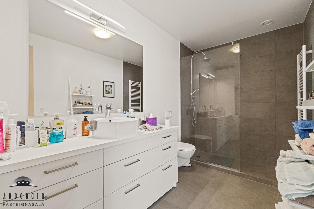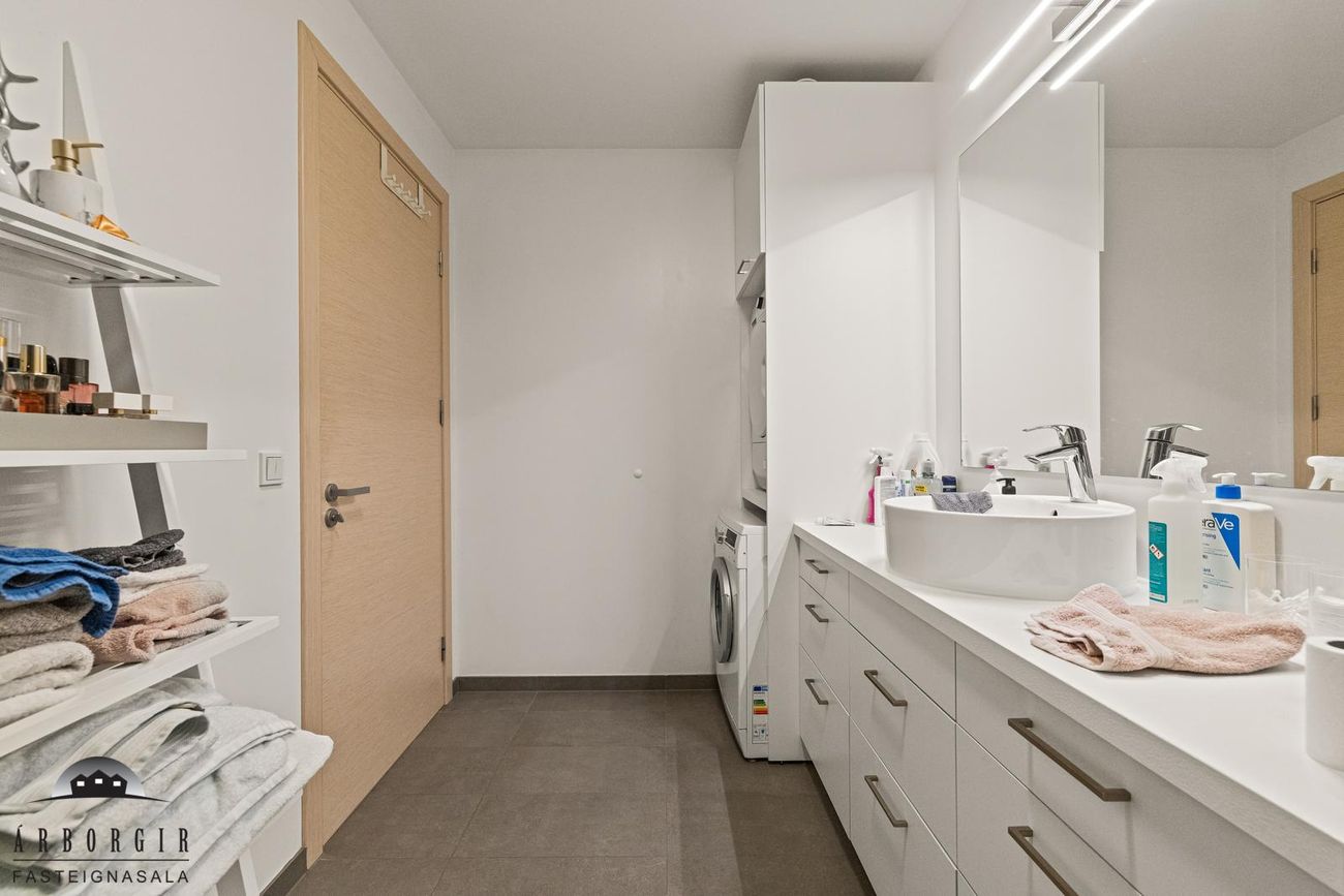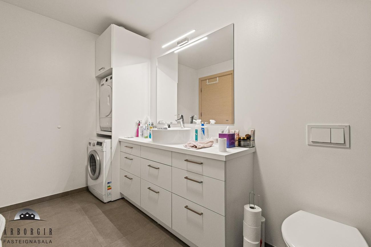 Baðherbergi er flísalagt bæði gólf og hluti veggja, þar er gólfsturta og innrétting með aðstöðu fyrir þvottavél og þurrkara.