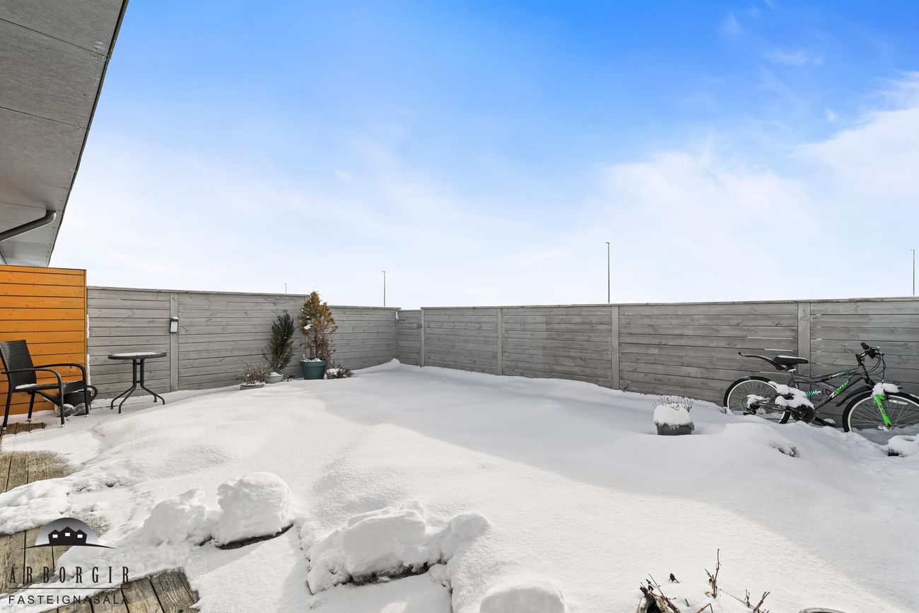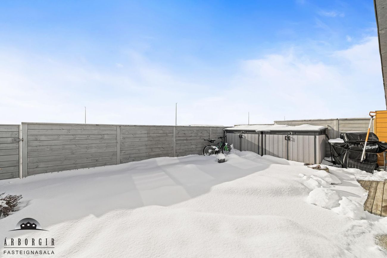 Góður sólpallur með skjólveggjum er á baklóð sem snýr til suðurs.Geymsla er flísalögð.