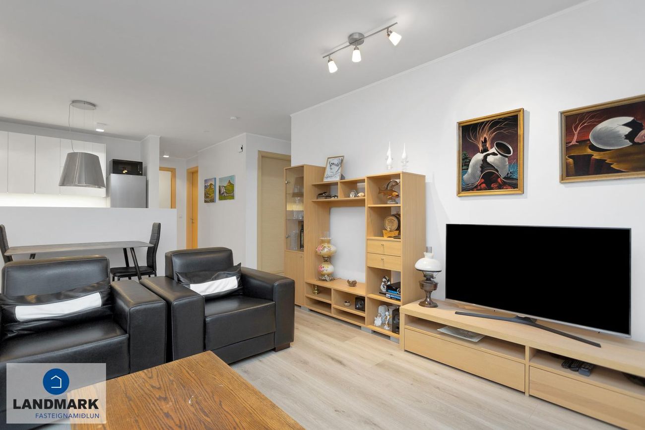 Vel skipulagð íbúð með gólfsíðum gluggum, harðparket og flísagólf. Staðsett á endalóð með rúmgóðu svæði í kringum hús.