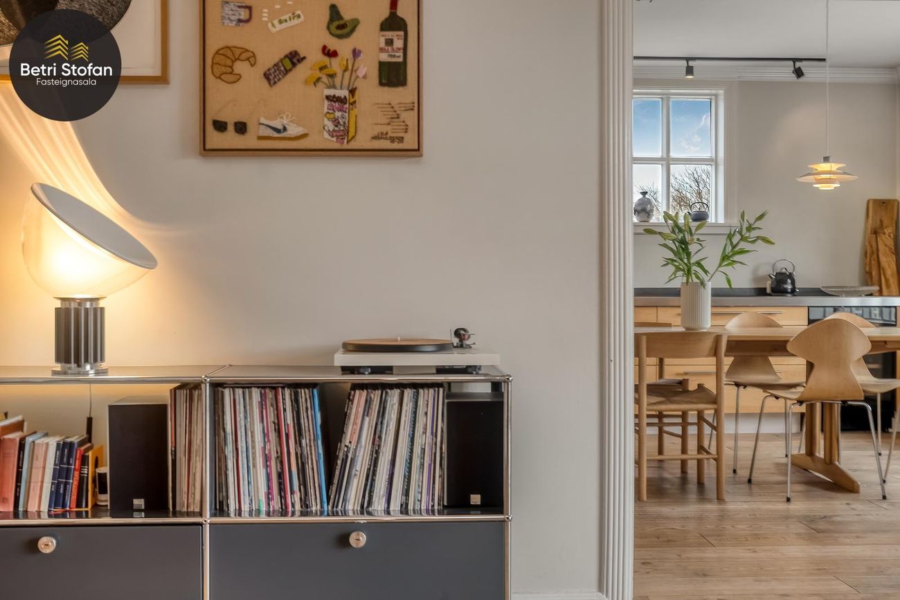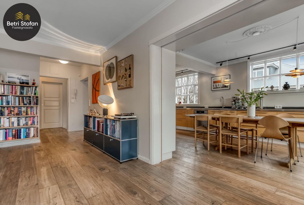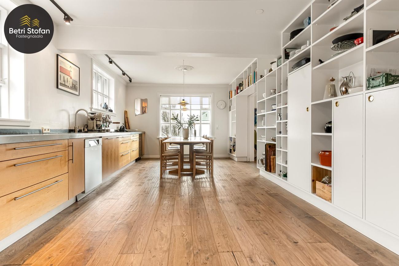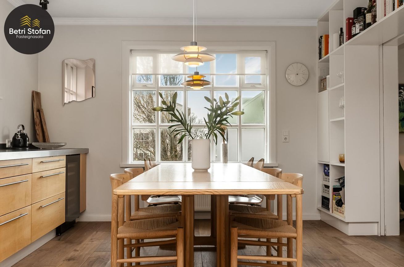 Eldhús og borðstofa - opnu rými, c.a. 30 fm. Endurnýjuð eldhúsinnrétting frá Axis, með miklu skápa- og borðplássi. Stór franskur gluggi í enda borðstofunnar. Sérsmíðaðar hillur þekja heilan vegg.