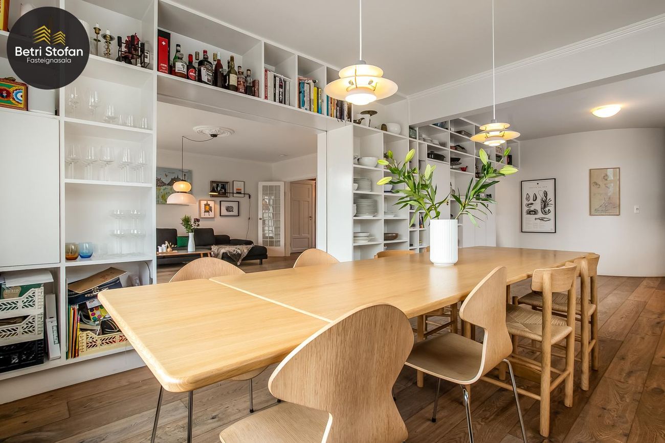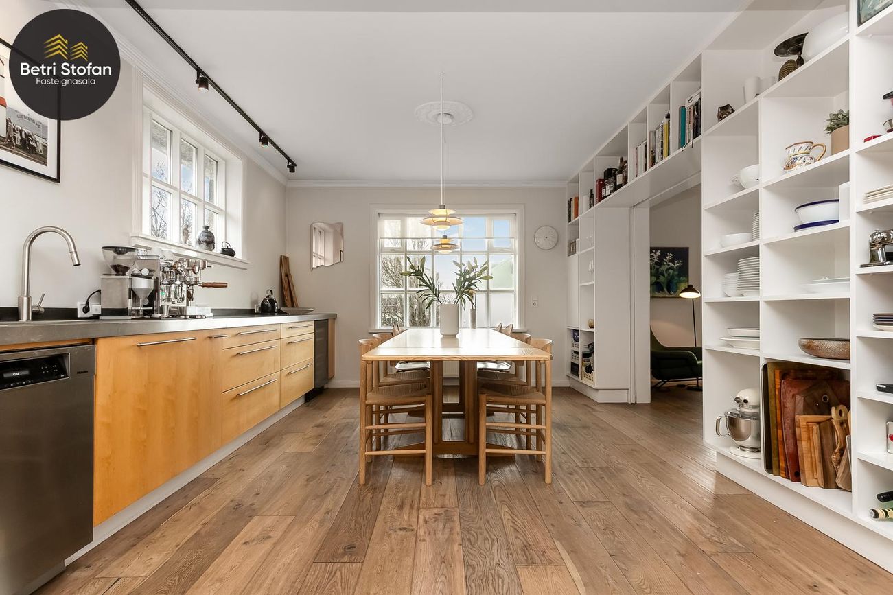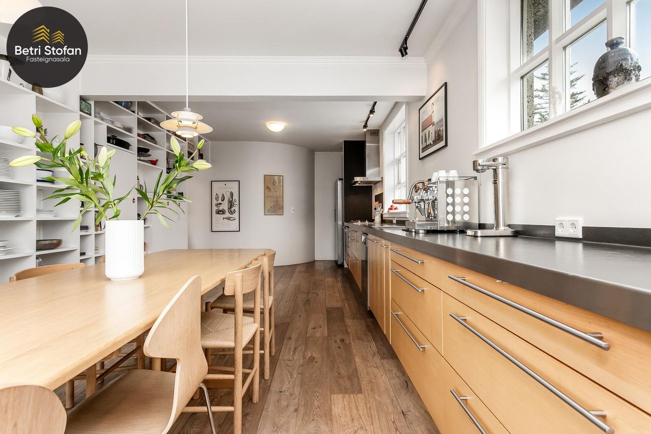 Eldhús og borðstofa - opnu rými, c.a. 30 fm. Endurnýjuð eldhúsinnrétting frá Axis, með miklu skápa- og borðplássi. Stór franskur gluggi í enda borðstofunnar. Sérsmíðaðar hillur þekja heilan vegg.