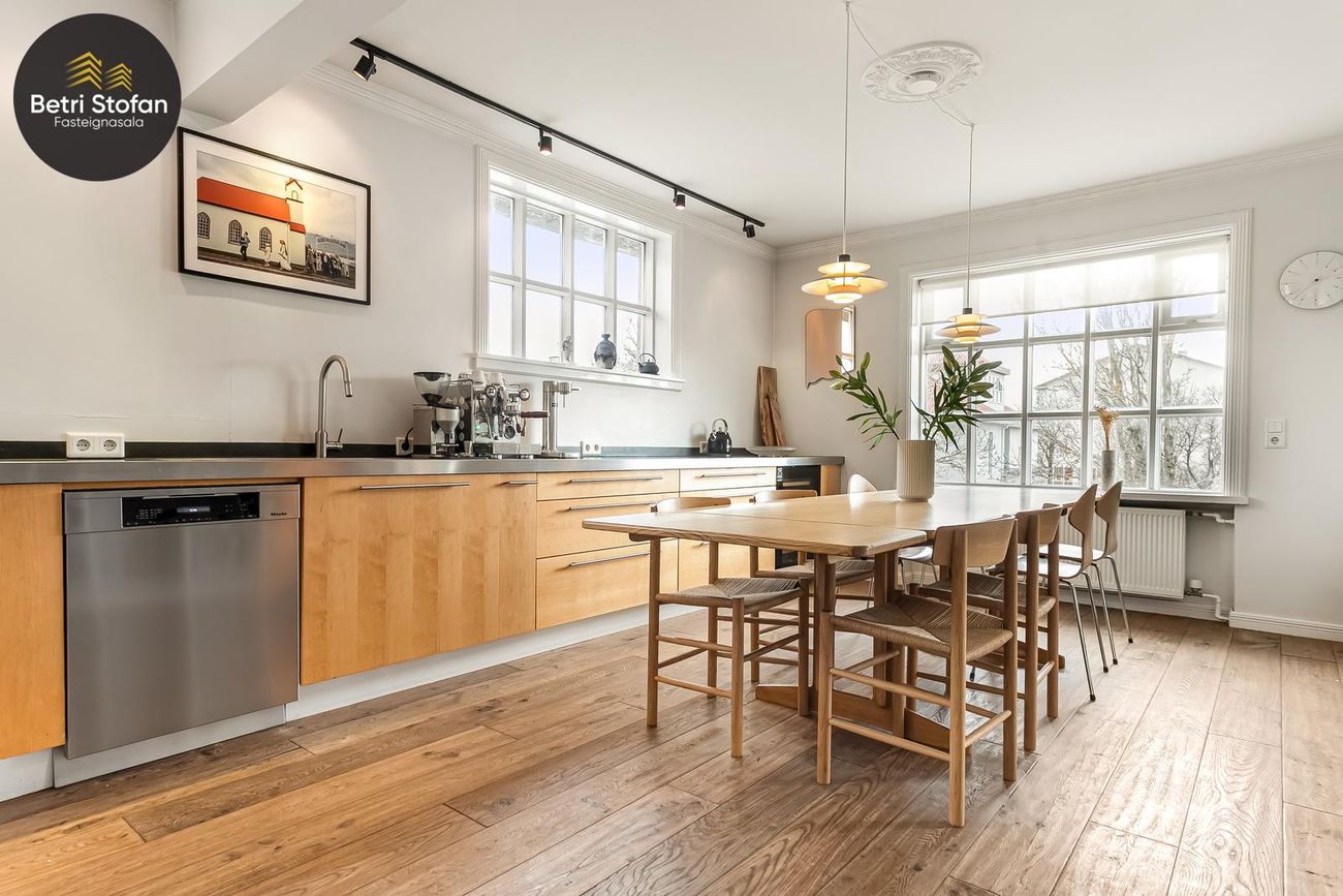 Glæsileg 227,3 fm efri sérhæð og ris ásamt bílskúr í húsinu við Grenimel 7 í Vesturbænum. Hæðin skiptist í forstofu, þvottahús, stigahús, stigapall, stofu með útgengi á svalir til suðurs, eldhús/borðstofa, arinstofa, svefnherbergisgangur, 2-3 svefnherbergi, þar af eitt með útgengi á suðursvalir og baðherbergi. Fallegir franskir gluggar og skrautlistar í loftum. Í risi er rúmgóð stofa/eldhús, tvö svefnherbergi, baðherbergi með tengi fyrir þvottavél og geymsla/fataherbergi.