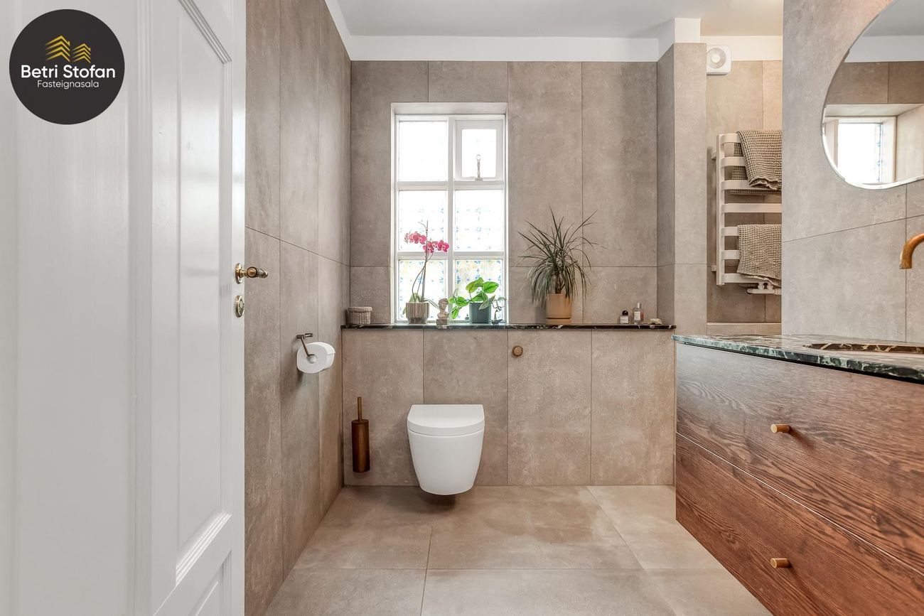 Baðherbergi - endurnýjað á vandaðan og smekklegan hátt með glugga, flísalagt í hólf og gólf, sturta, upphengt wc. Blöndunartæki frá Vola og marmari á baðherbergisinnréttingu.