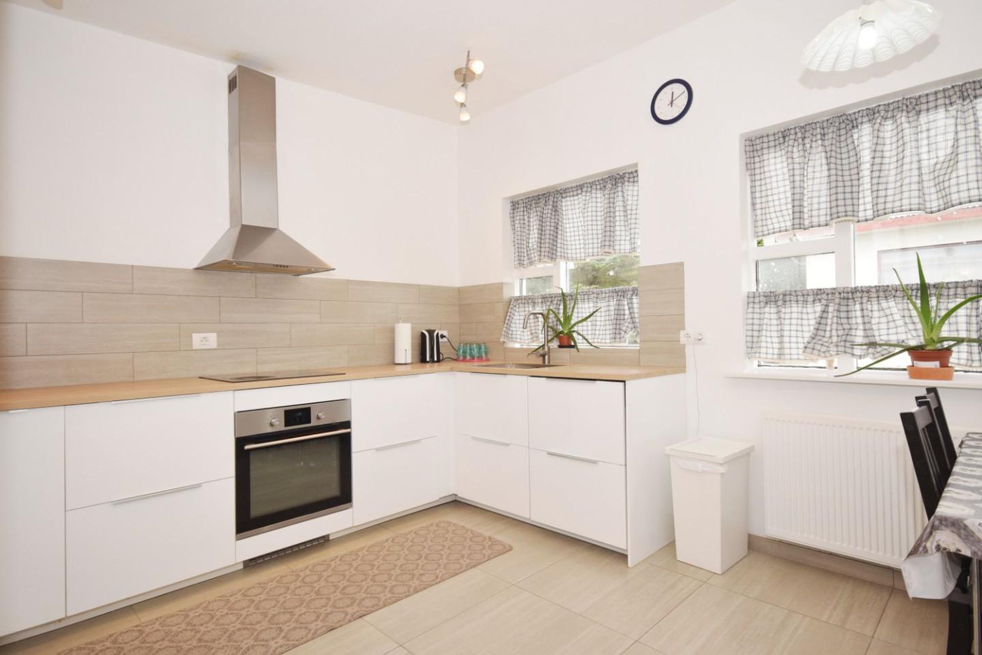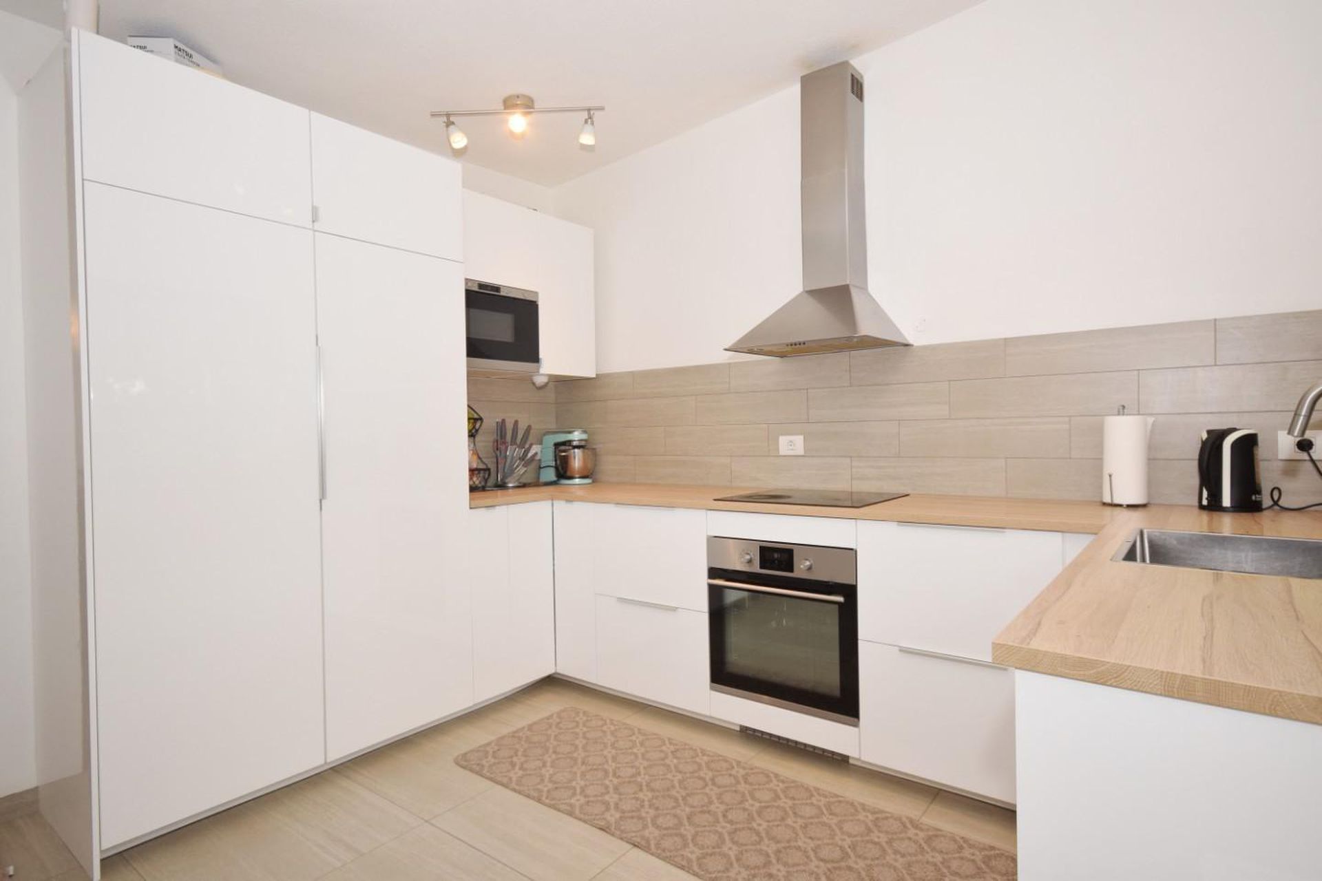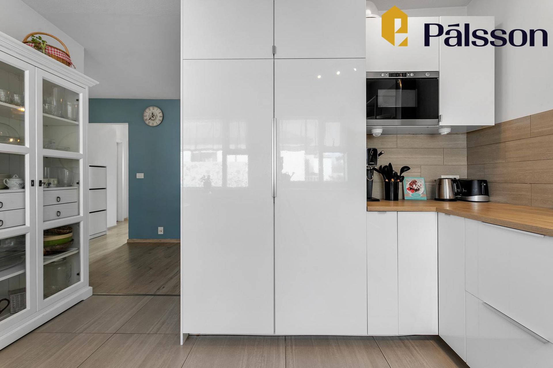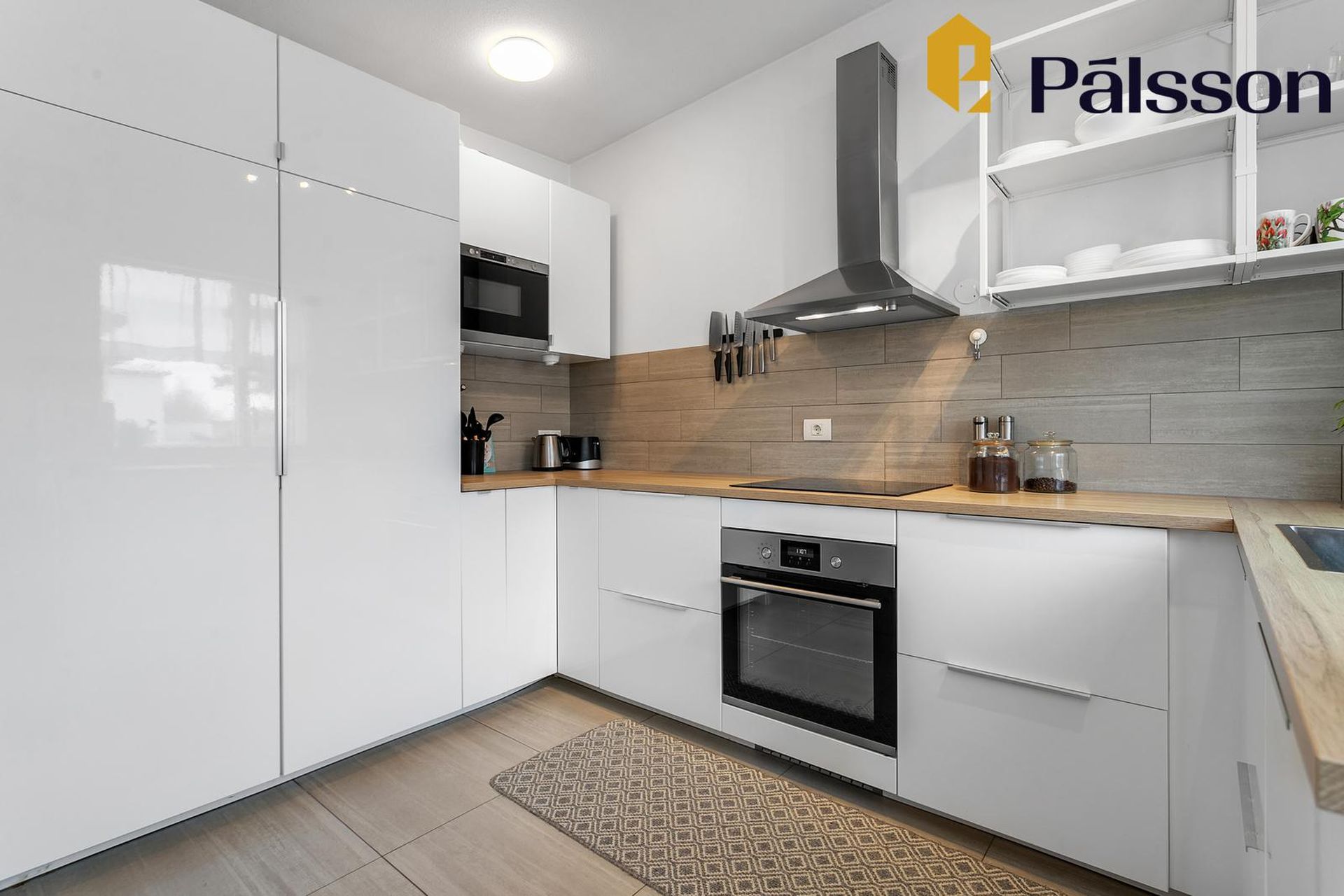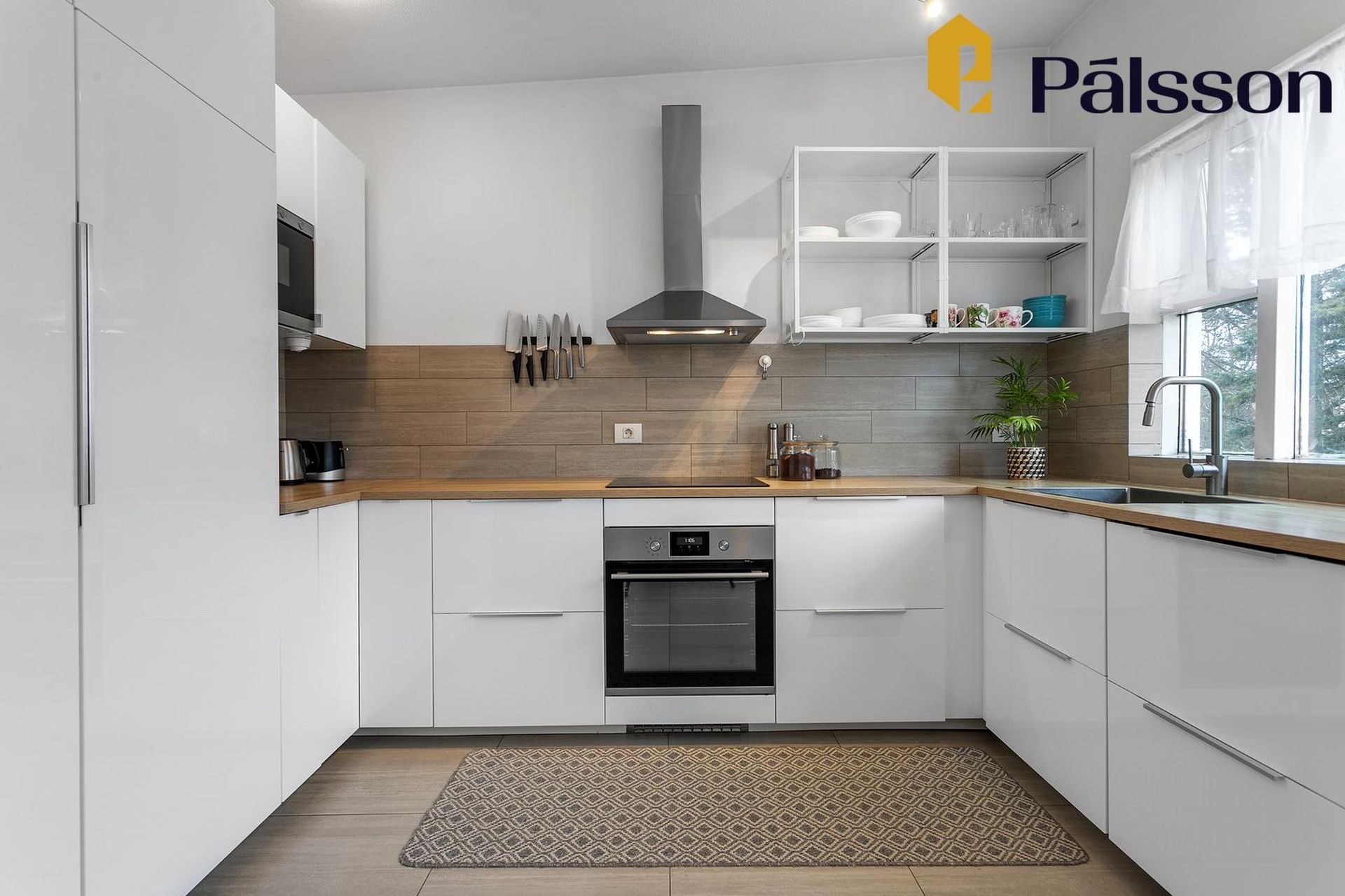 Eldhús: Er með nýlegri U-laga, hvítri innréttingu með flísum á milli skápa, kósý borðkrók, spanhelluborði, viftu, bakaraofni og innbyggðum ísskáp með frysti.