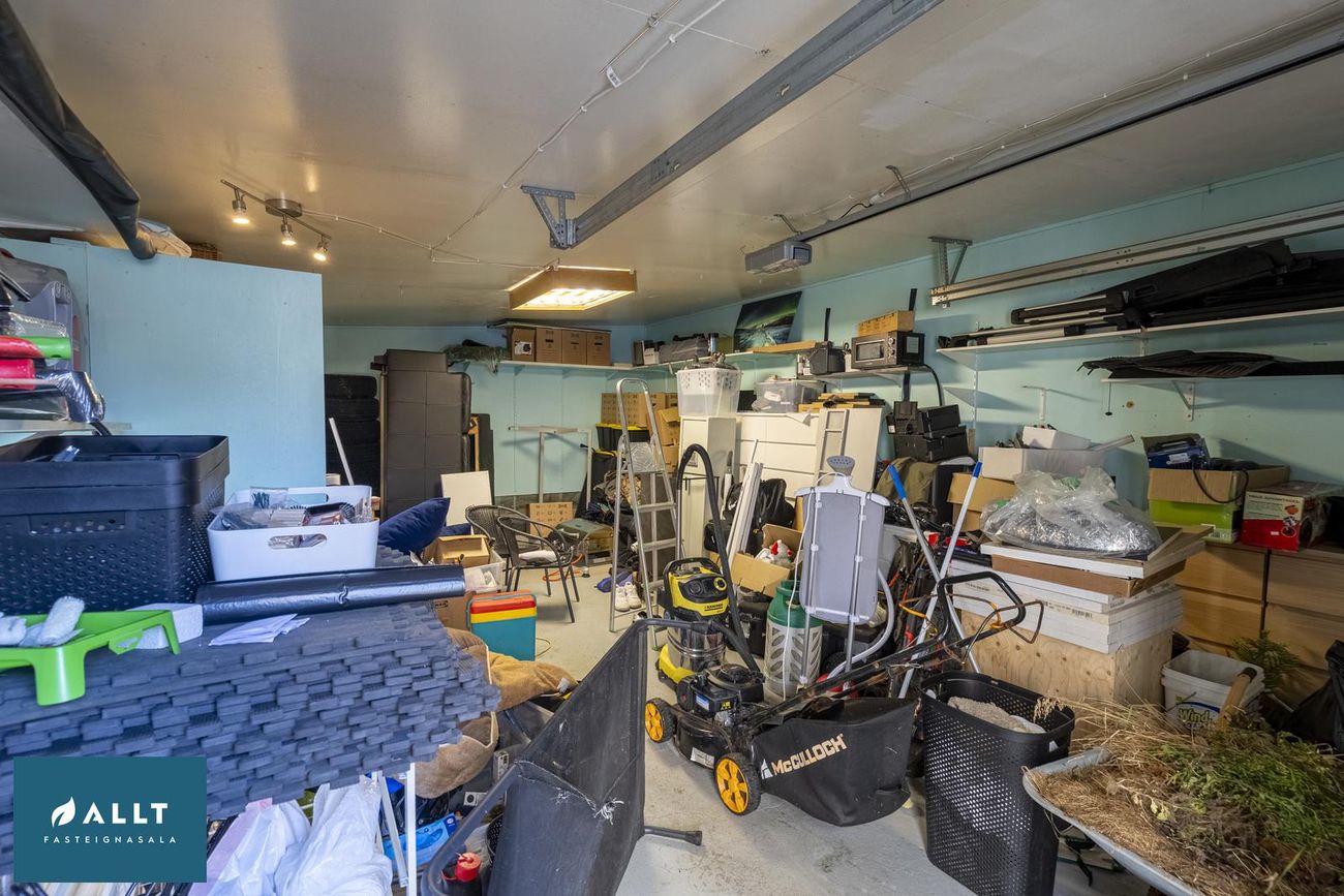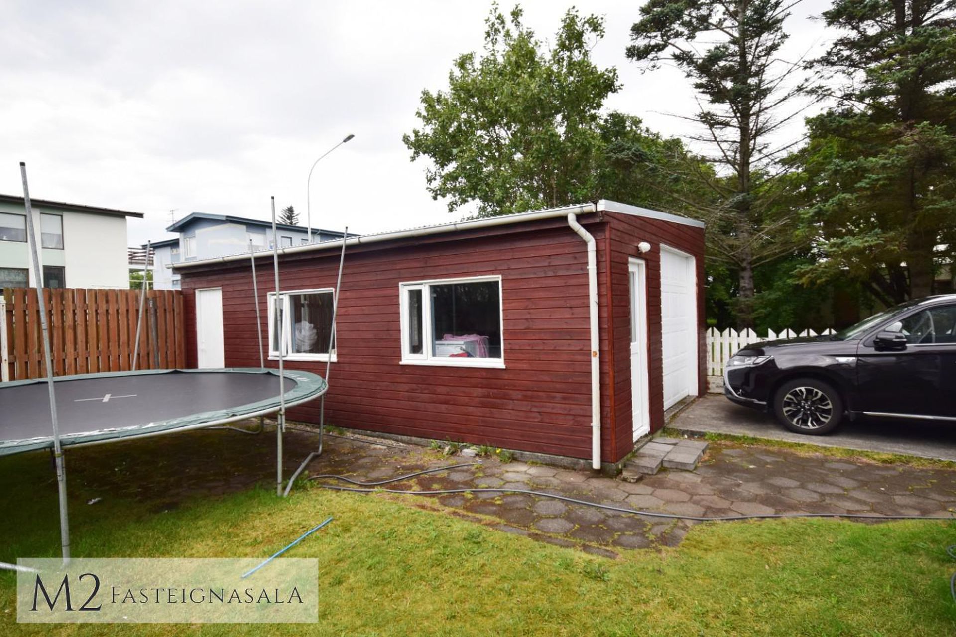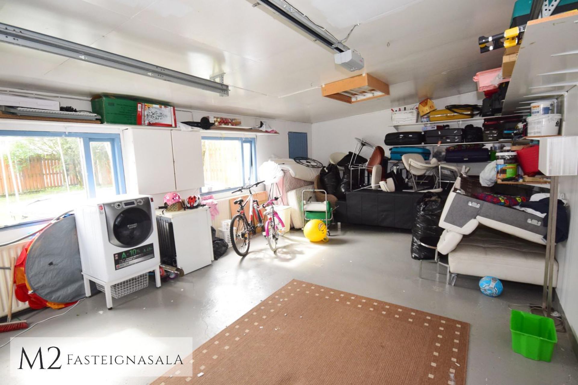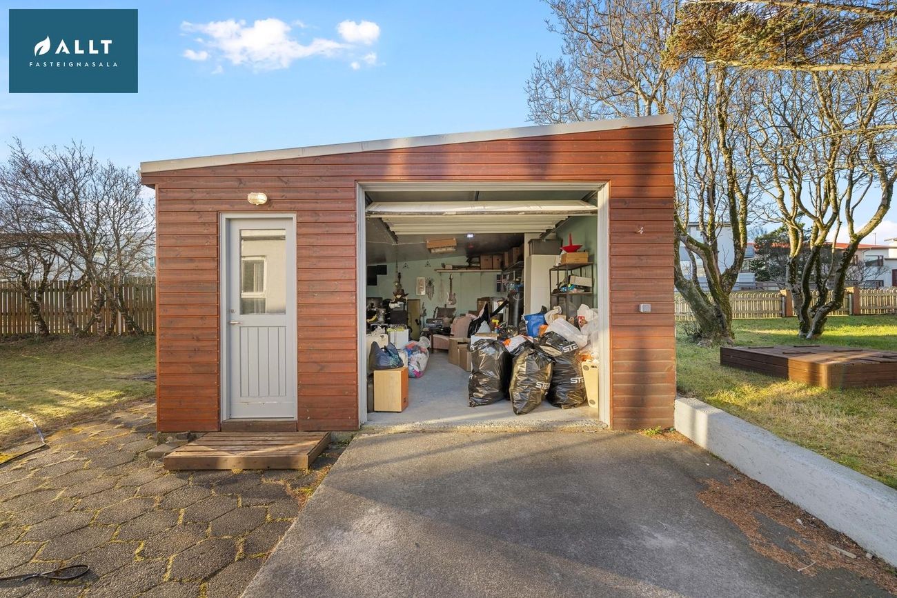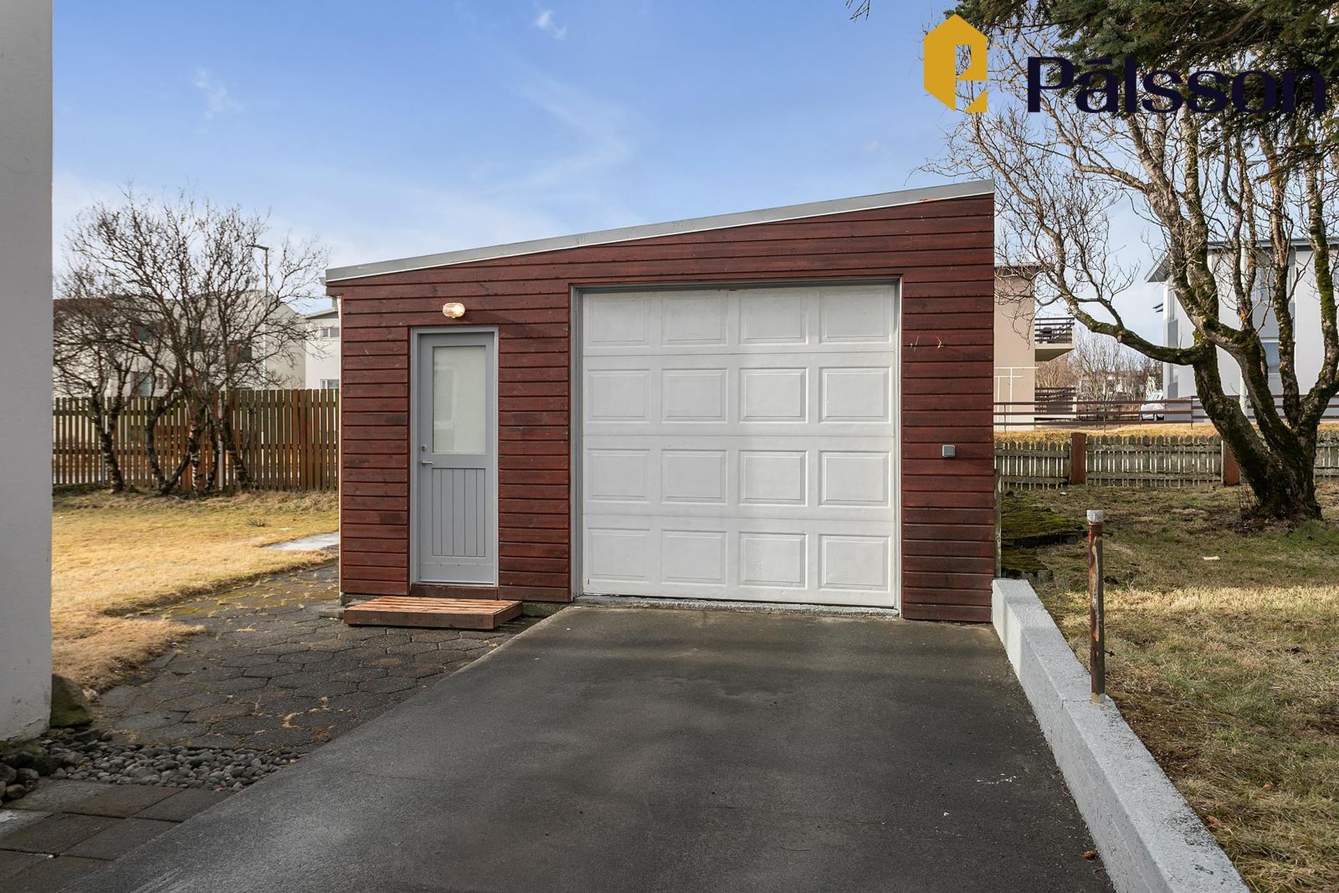 Bílskúrinn (40,0 fm) er frístandandi og úr timbri með timburklæðningu, góðum gluggum til suðurs með opnanlegu fagi og steyptri heimkeyrslu. Hann er með rafdrifinni bílskúrshurð með fjarstýringu, sér inngangshurð, máluðu gólfi, rafmagni, hita og rennandi köldu vatni ásamt sérafnotum af bílastæði fyrir framan bílskúrinn.