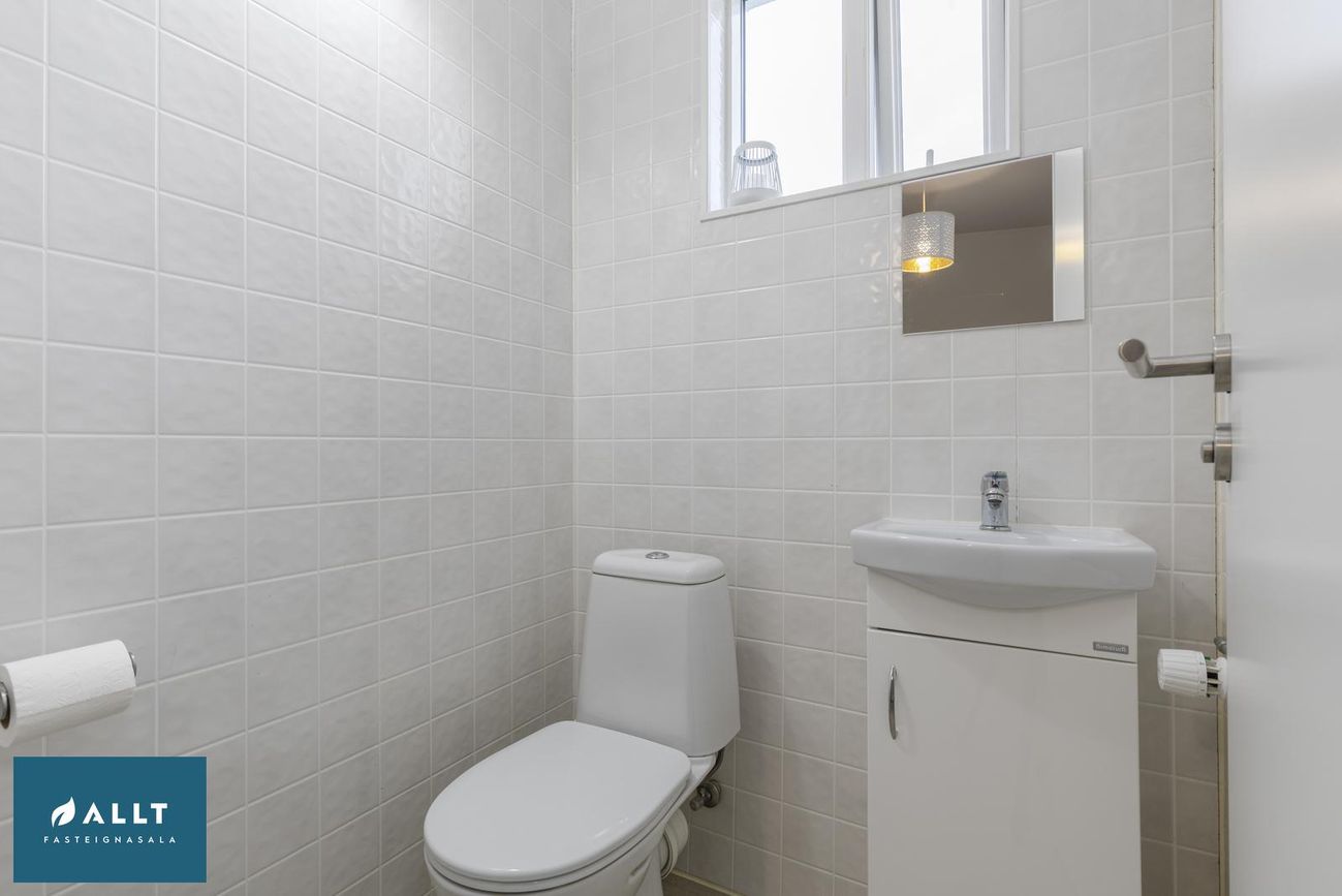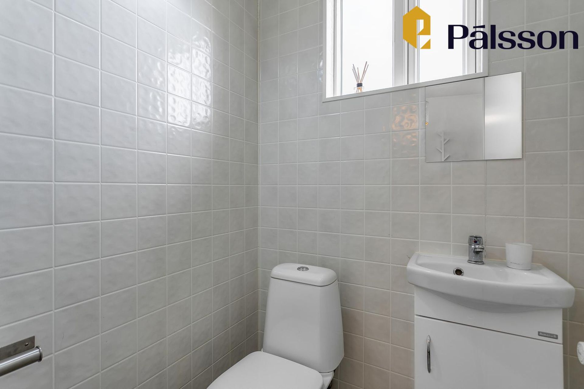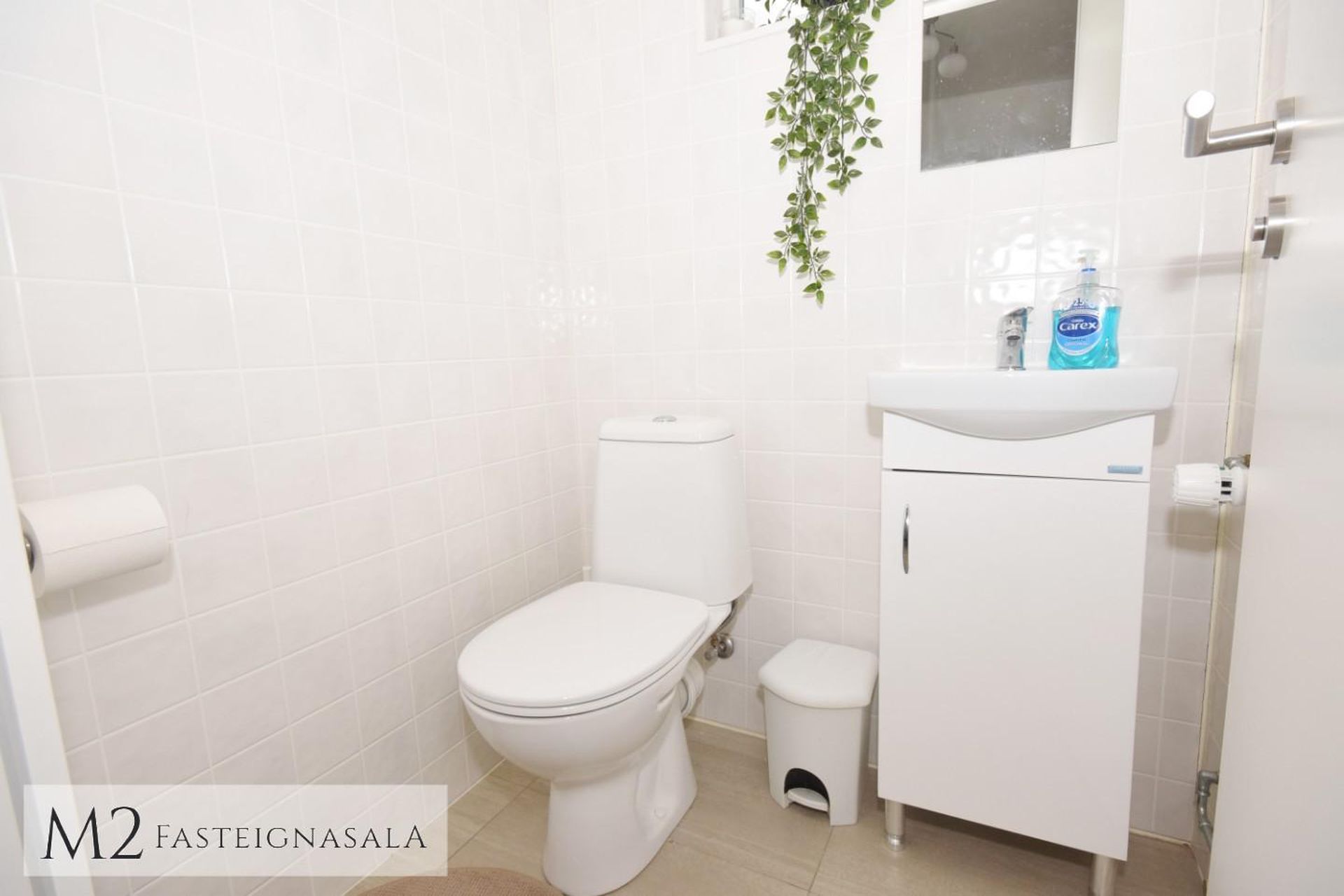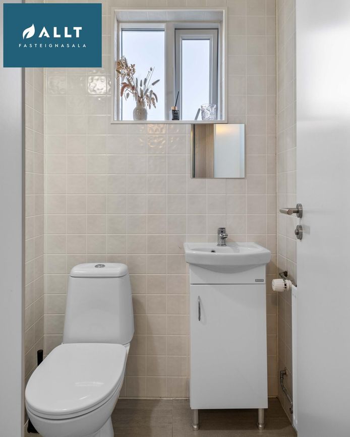 Gestasnyrting: Er inn af forstofu, flísar á gólfi og vegg að mestu og er með salerni, handlaug og nettum, hvítum vaskaskáp og glugga með opnanlegu fagi.